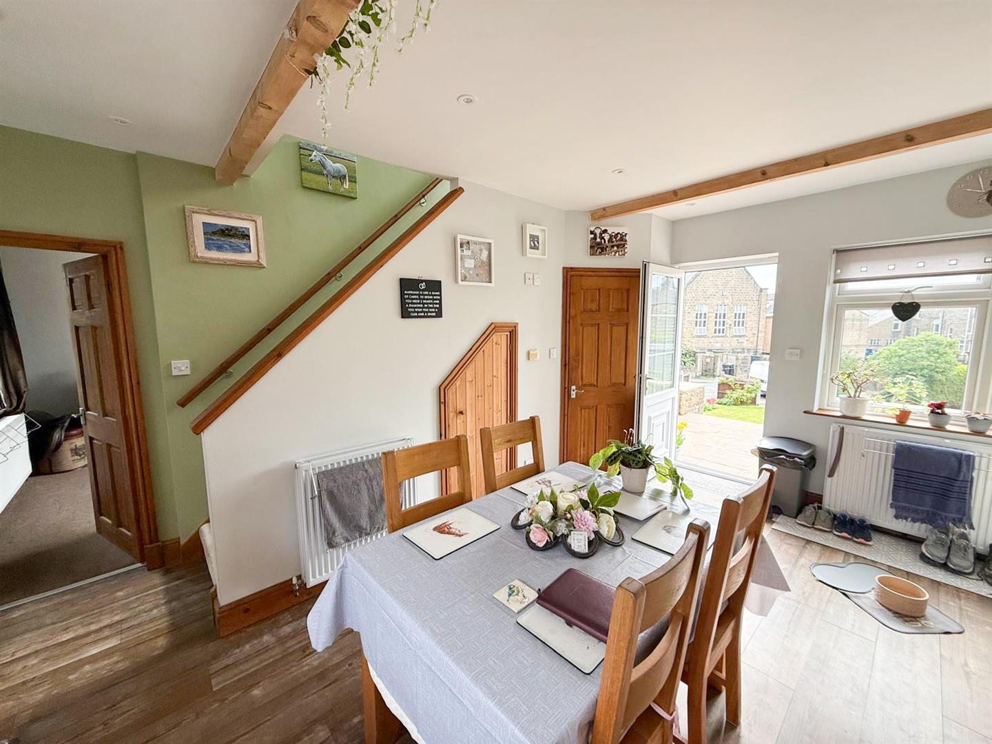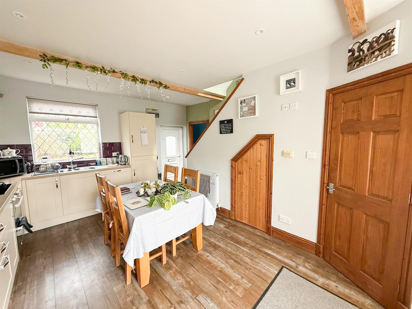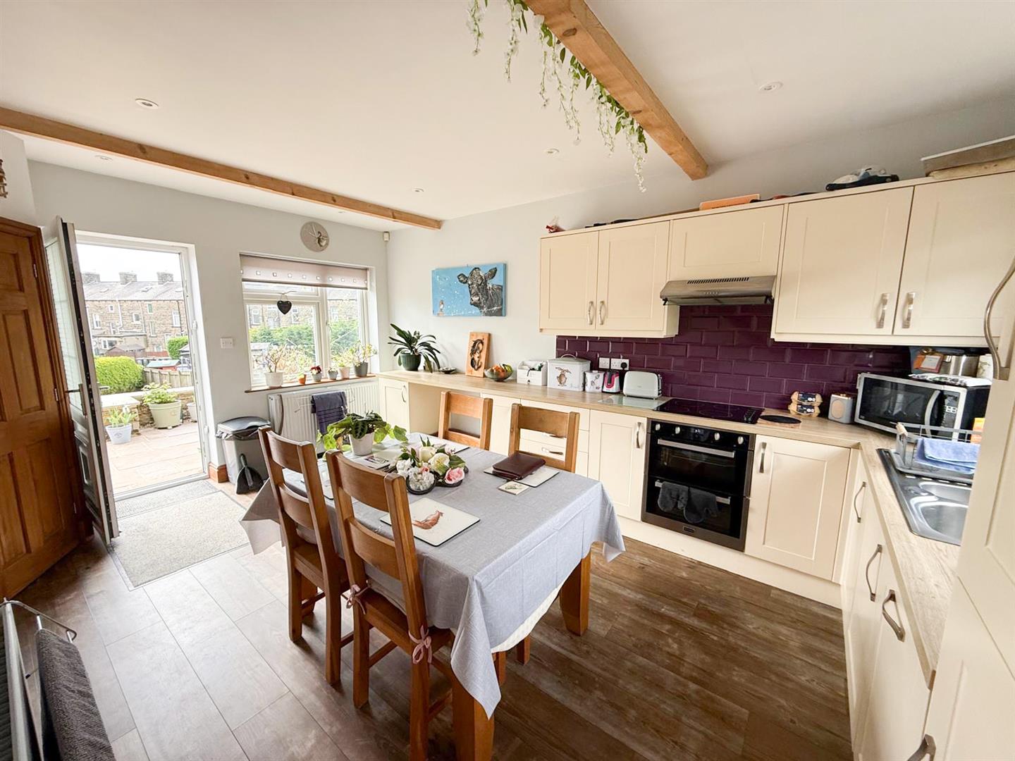 The modern, well-appointed dining kitchen also benefits from dual-aspect windows, creating a bright and airy space perfect for everyday living and entertaining. A door leads directly from the kitchen out to the garden and there is a handy utility cupboard tucked away for added convenience.