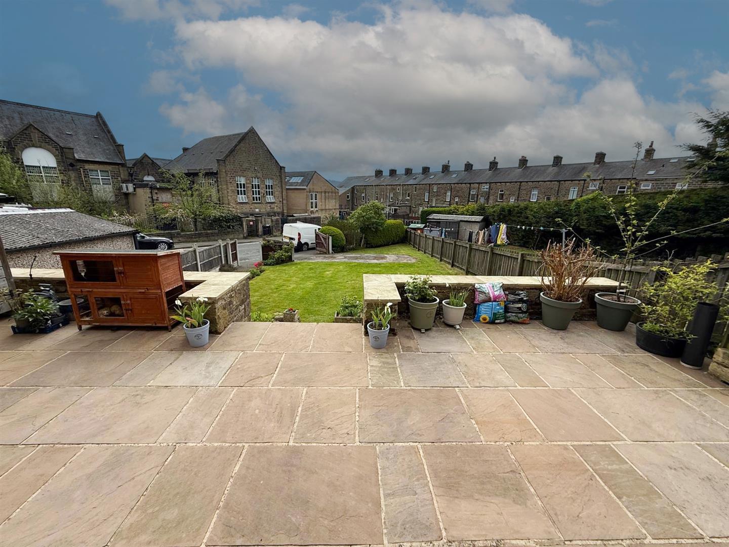Outside, the property is positioned on a substantial plot with lush front lawns framed by mature, well-stocked borders. A side path leads to the expansive rear garden, which features a raised terrace perfect for outdoor dining and entertaining, descending to a large, private lawns area and ample parking space.