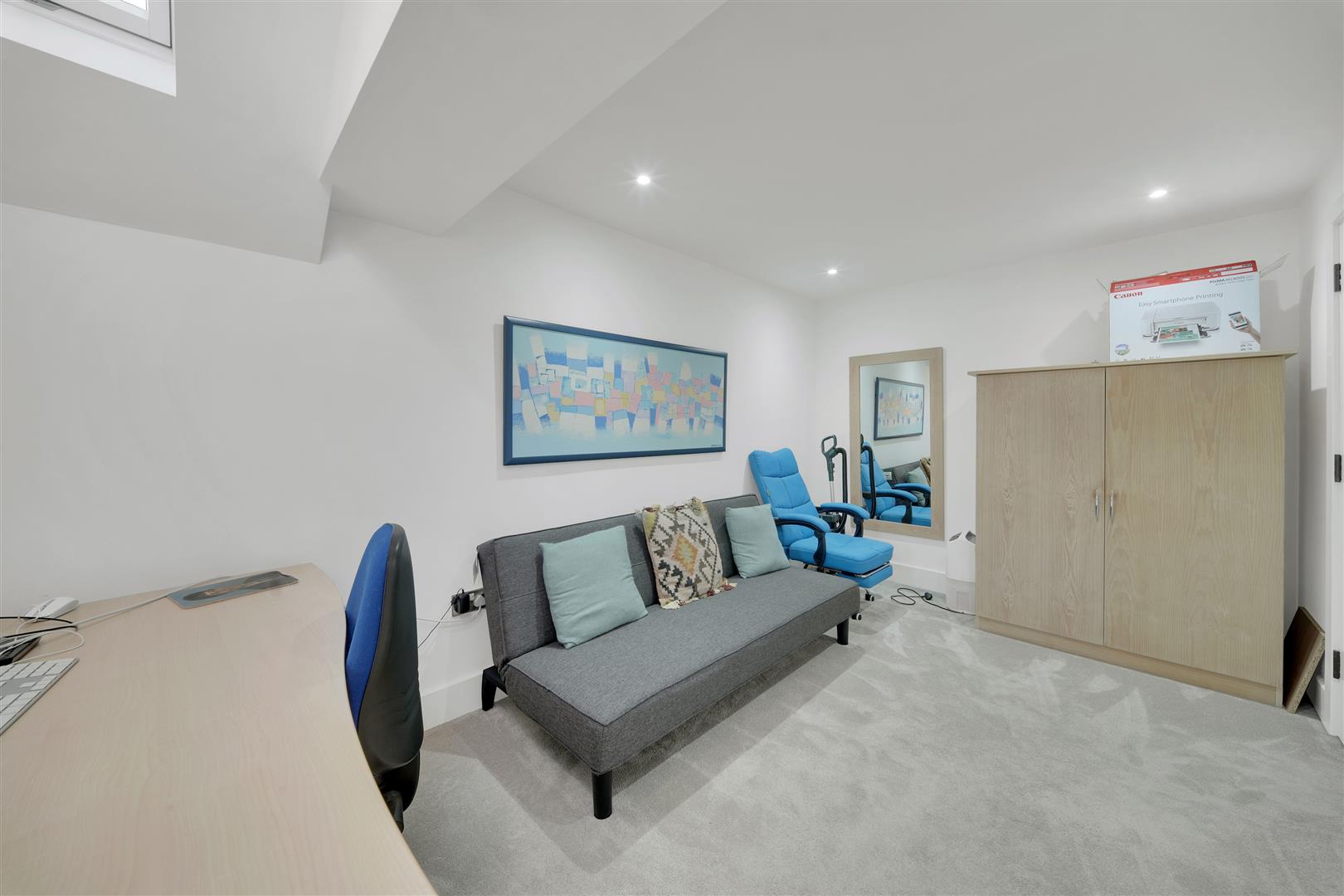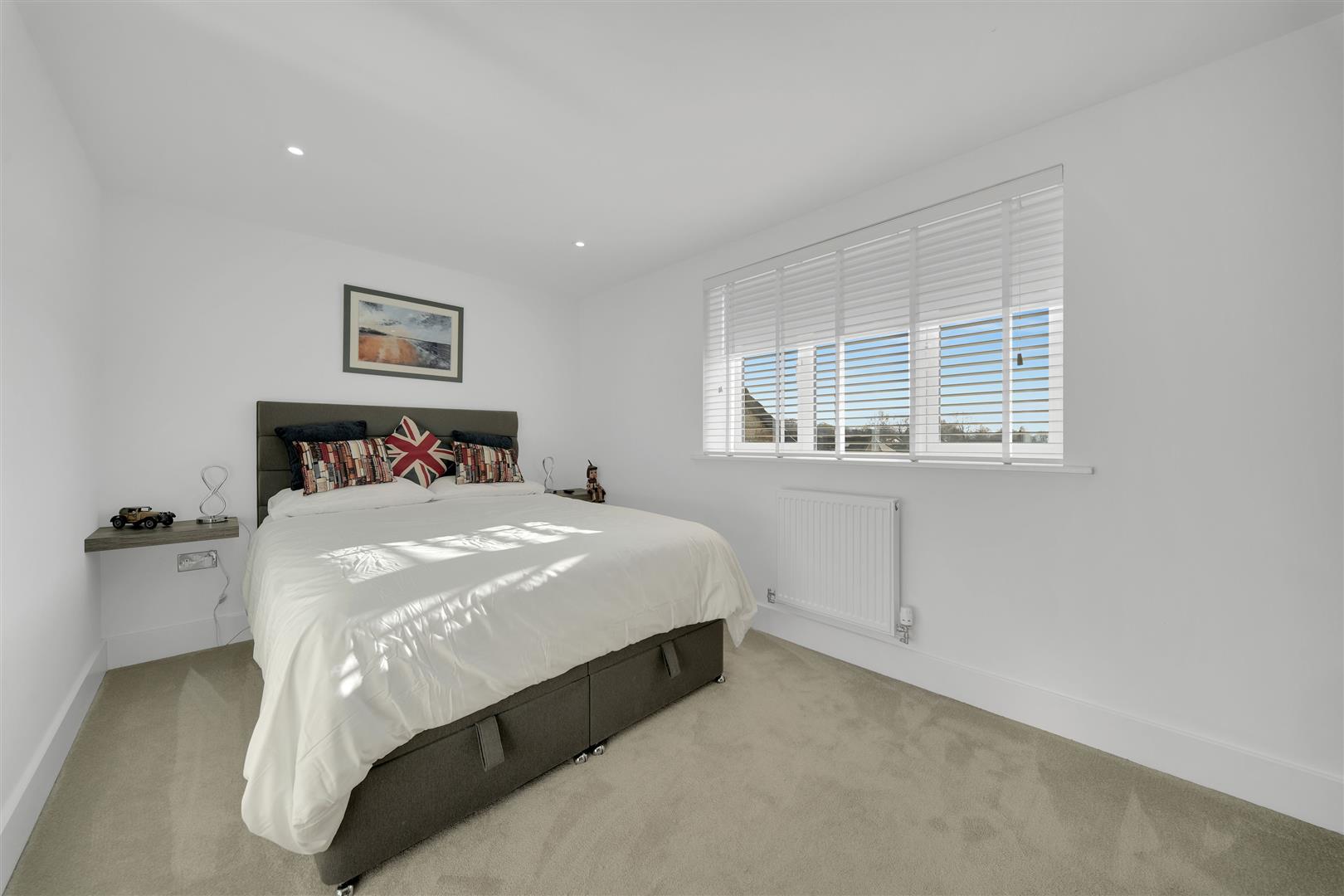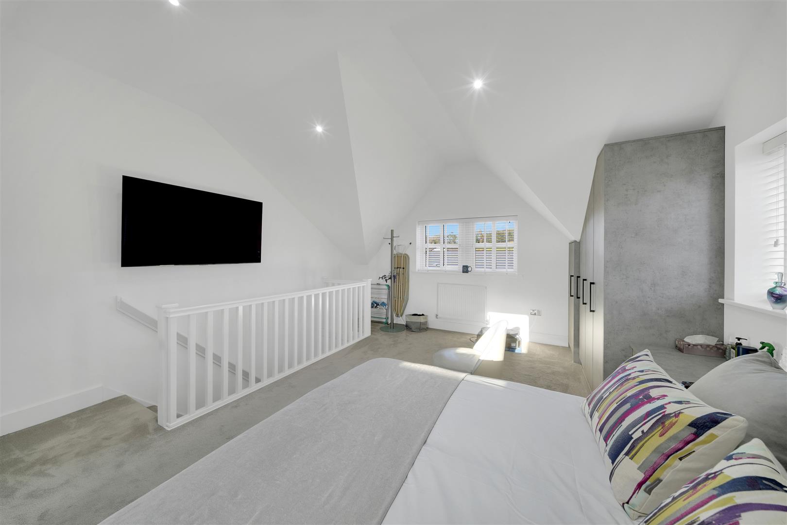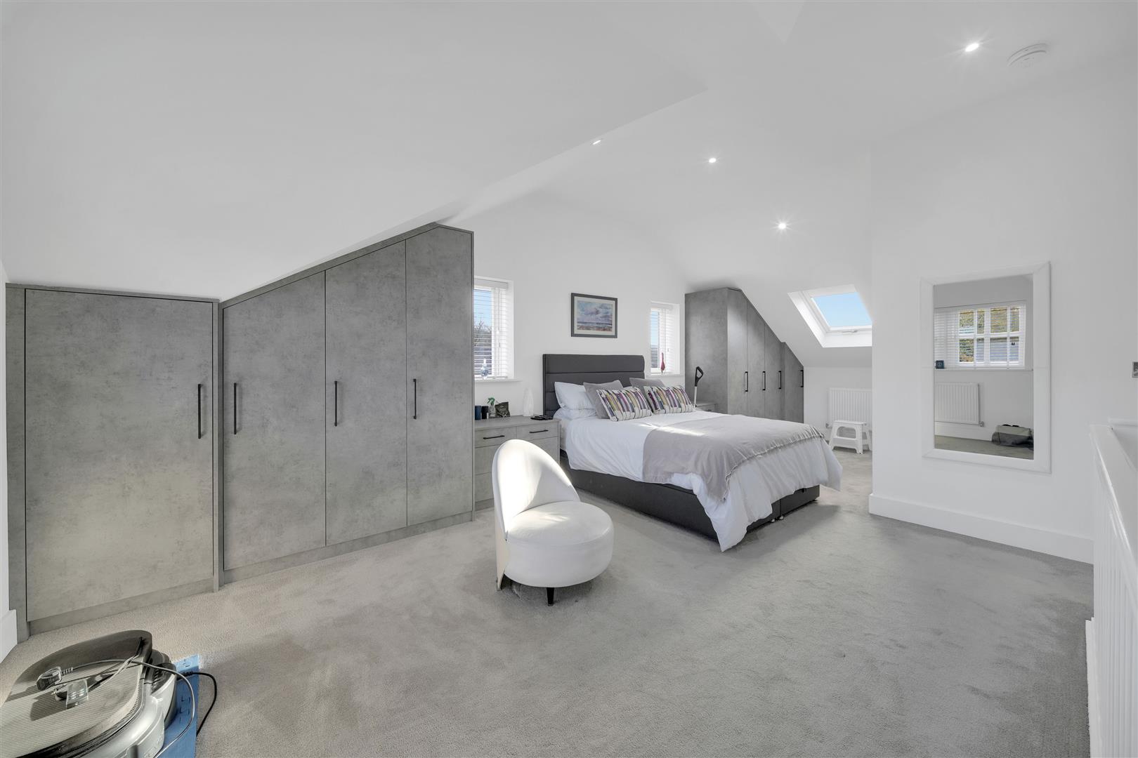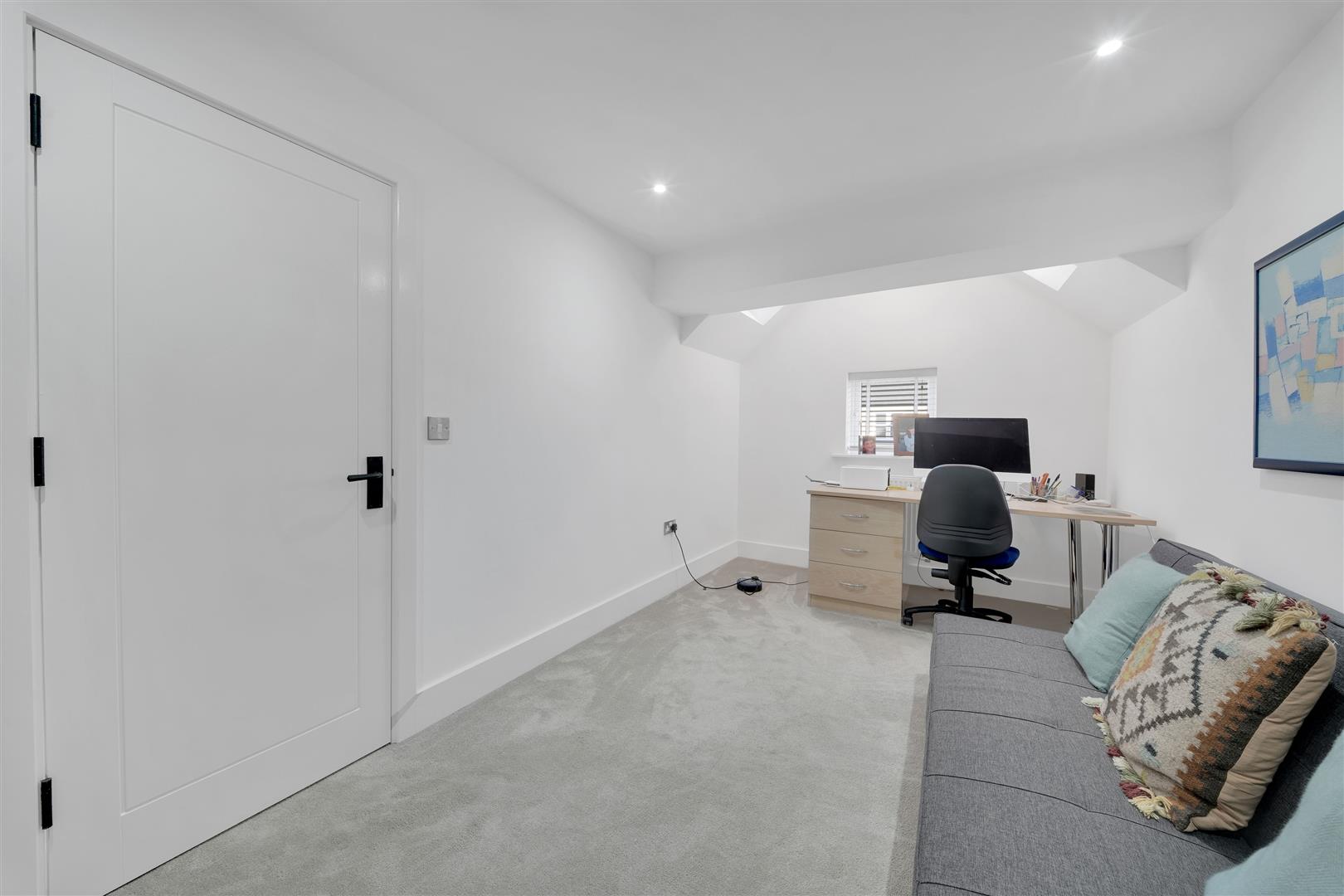 To the first floor, a spacious landing leads to an inner hallway with access to the second floor. Bedroom Two enjoys pleasant views and features bespoke contemporary fitted furniture. Bedroom Three is equally impressive, showcasing a feature ceiling with two Velux windows that flood the room with natural light. Completing this level is a stylish three-piece house bathroom, finished to a high standard and incorporating a bespoke mirrored cabinet.