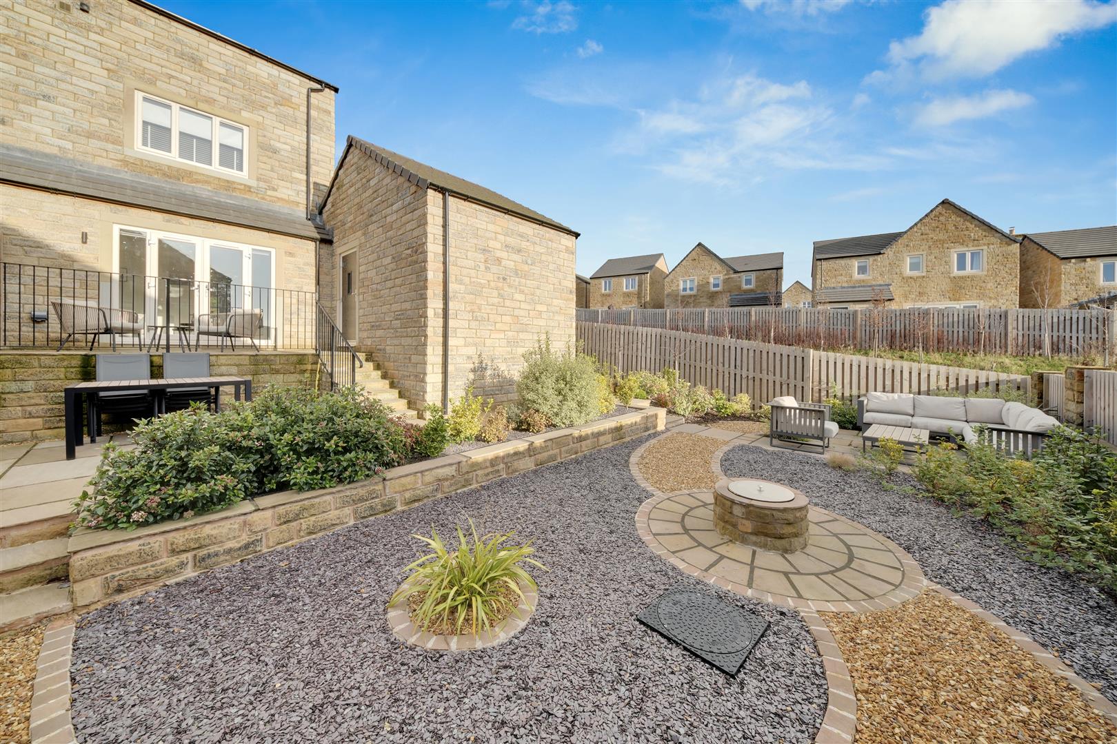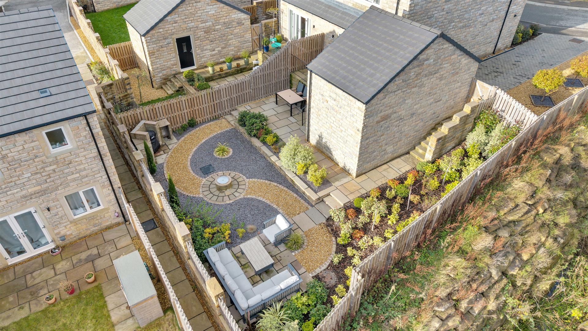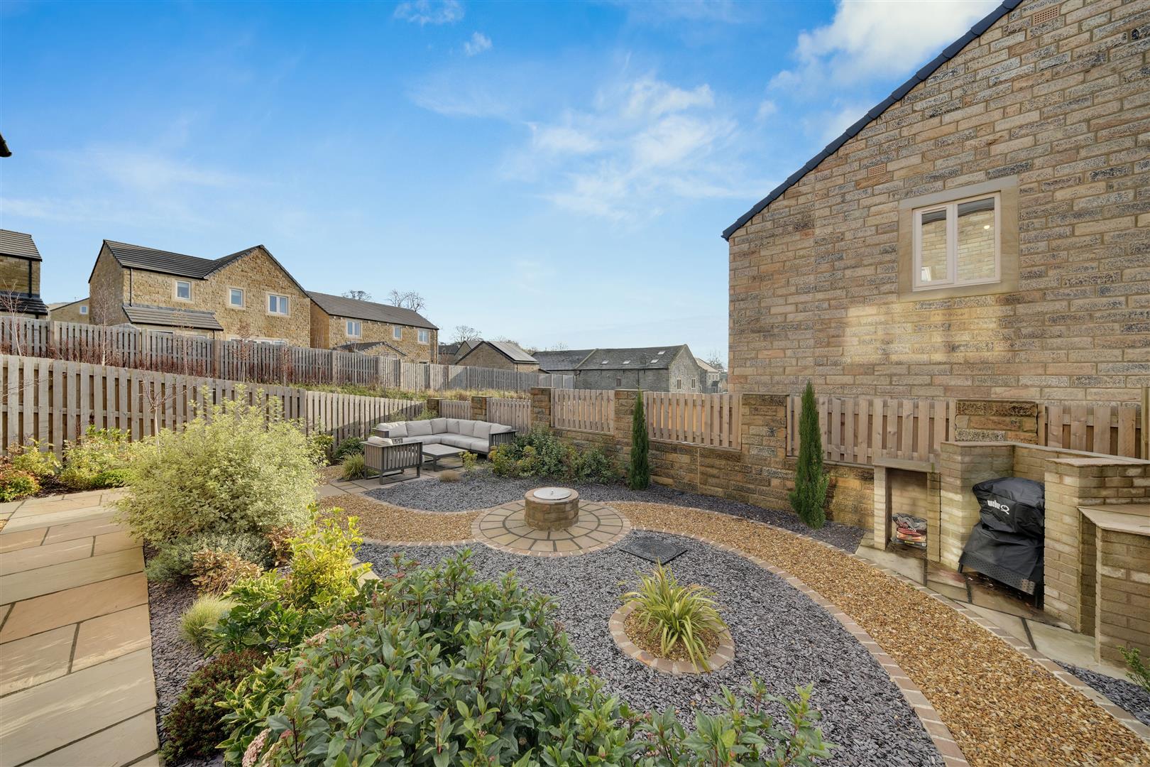 Externally, the property occupies a substantial plot that has been professionally landscaped to create a beautiful and private setting. A tree-lined driveway provides ample off-street parking and leads to a detached single garage with power, lighting, an electric door and rear access. The rear garden is a true oasis — thoughtfully designed for relaxation and entertaining — with paved seating areas, a built-in BBQ and a carefully curated selection of mature shrubs and planting.
