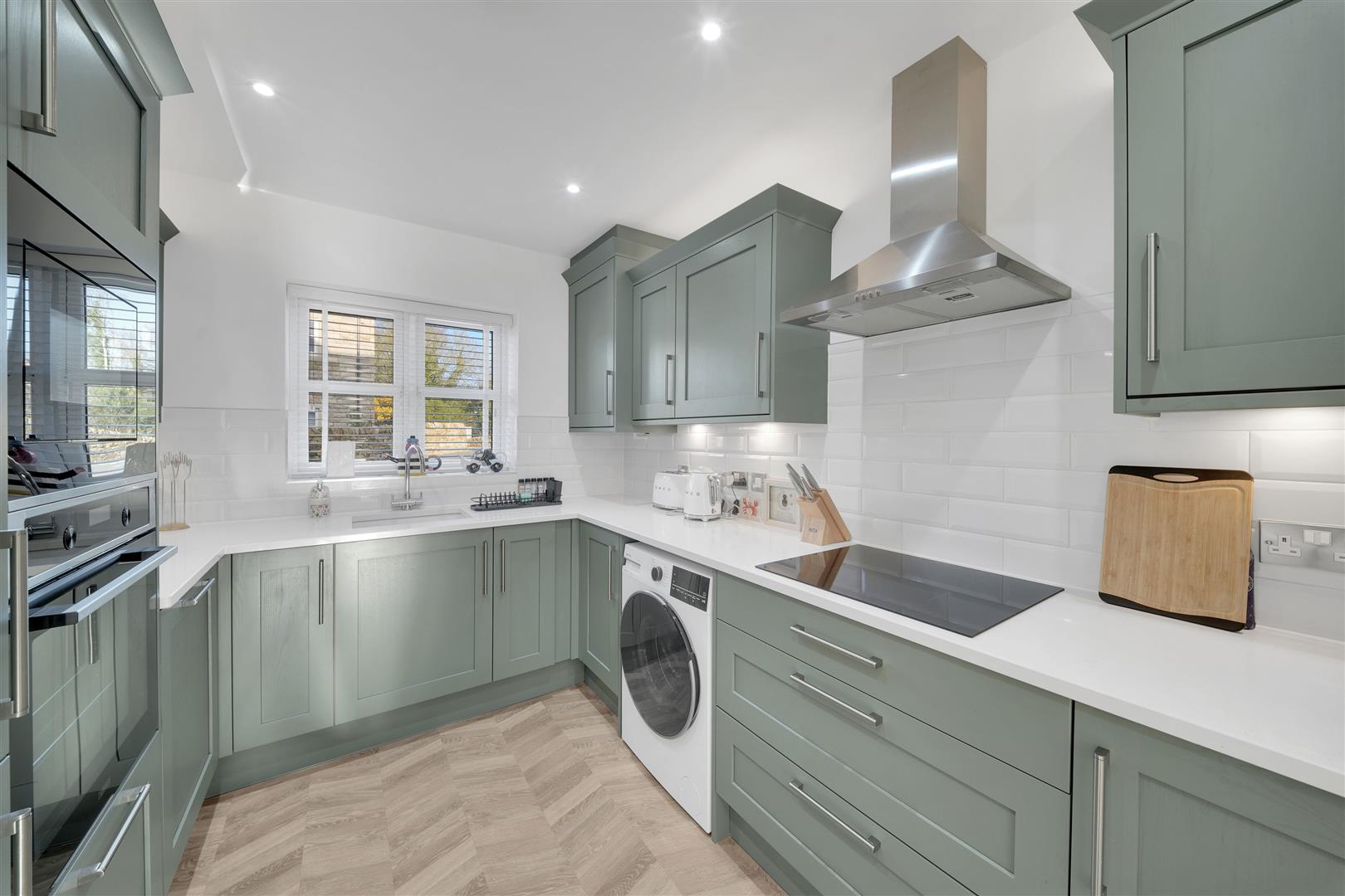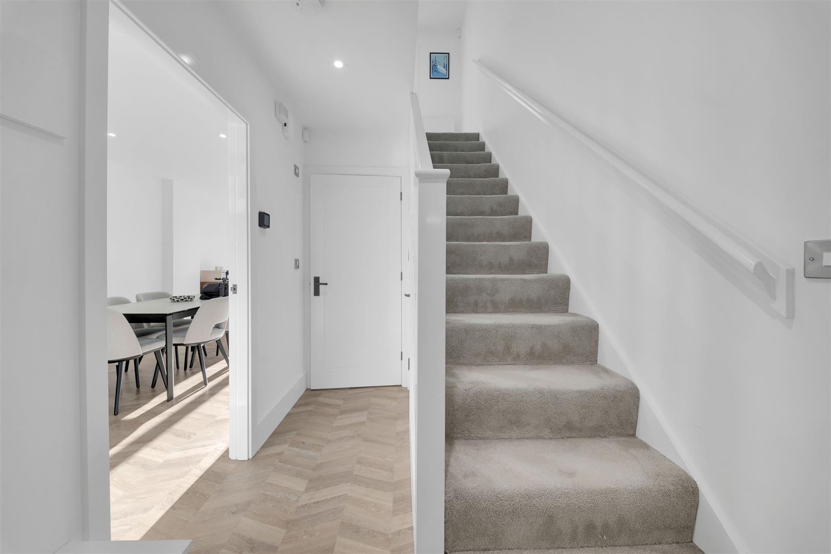 Upon entering, you are welcomed by a bright and spacious entrance hall featuring an elegant open staircase rising to the first floor. The ground floor is beautifully finished with stylish herringbone flooring, complemented by a useful understairs storage cupboard and a luxurious cloakroom.