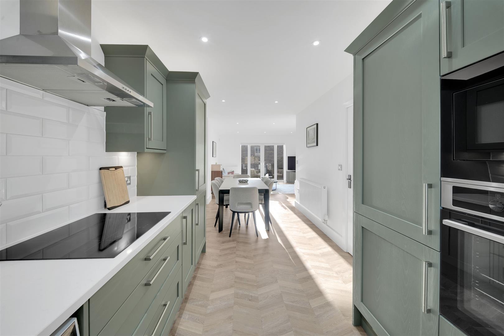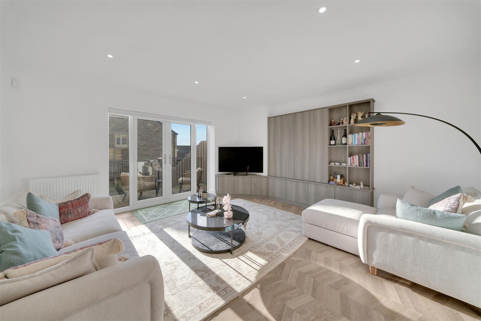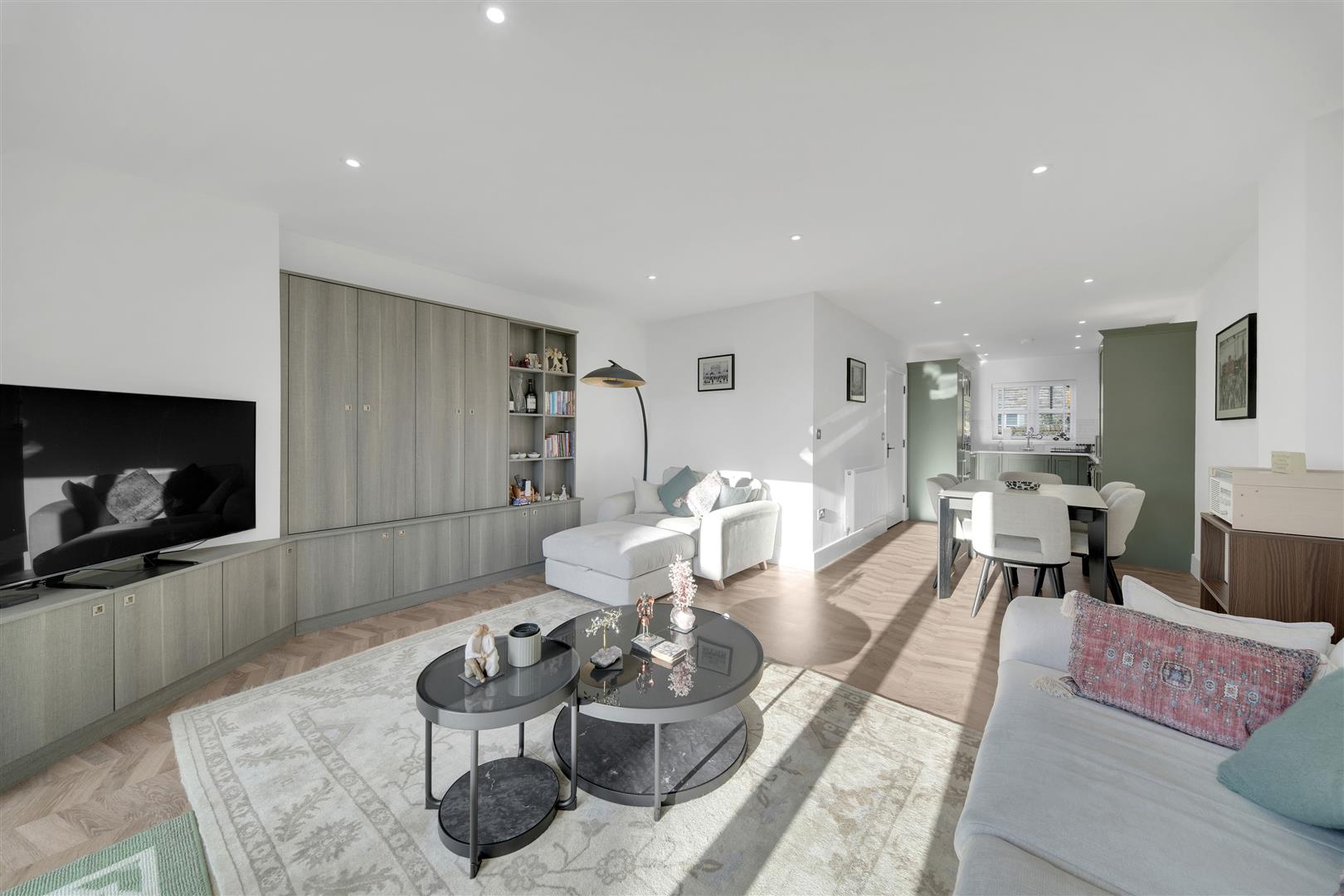 The hallway flows seamlessly into the stunning open-plan living, dining and kitchen area — a light-filled space enhanced by front elevation windows and rear French doors with matching side panels that open directly onto the landscaped garden. The contemporary kitchen is fitted with high-quality integrated appliances and feature lighting, while the dining area also benefits from statement lighting that creates a warm and inviting ambience. The sitting area is centred around a bespoke built-in media and display unit, adding both practicality and a striking design feature.