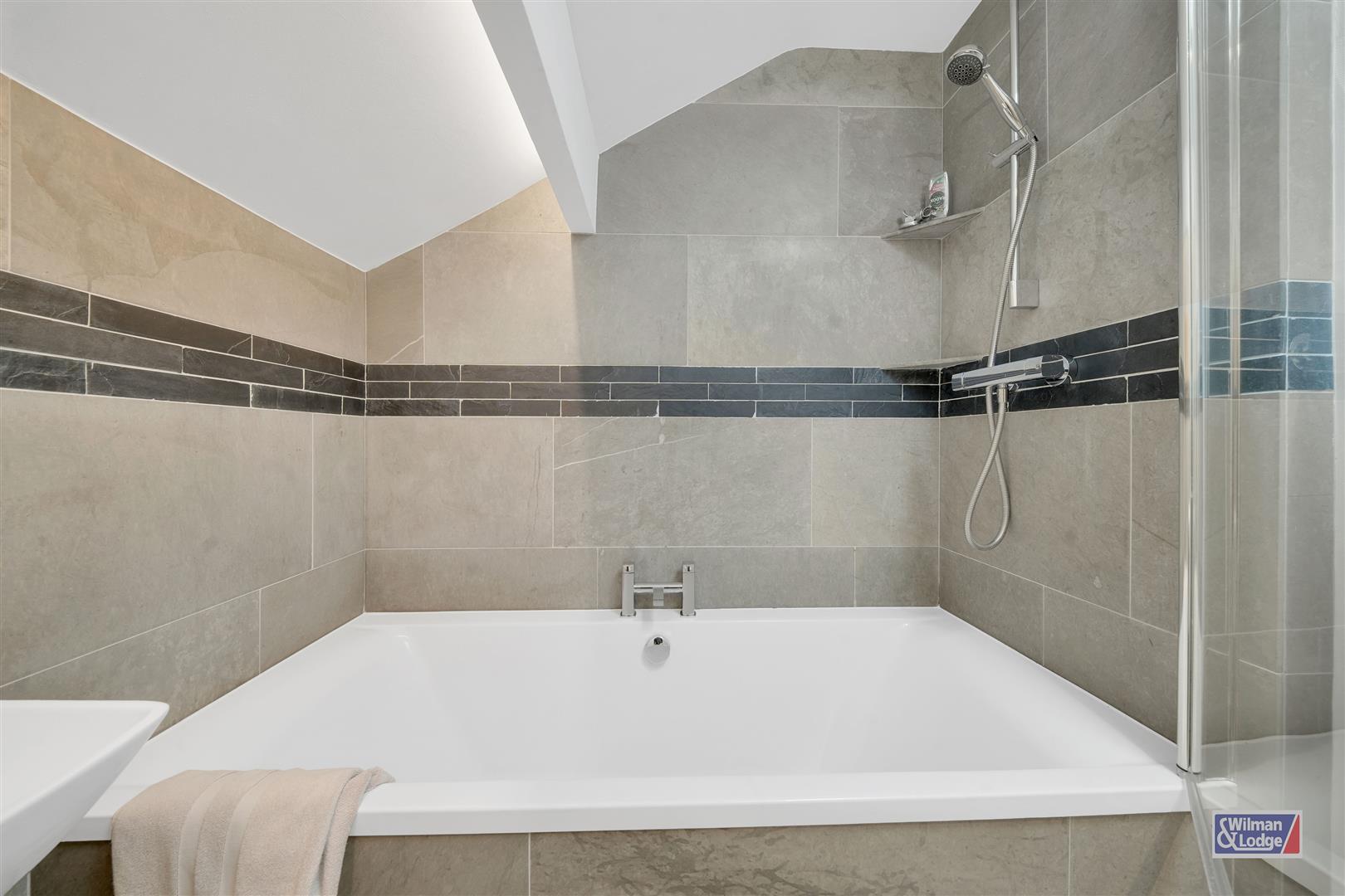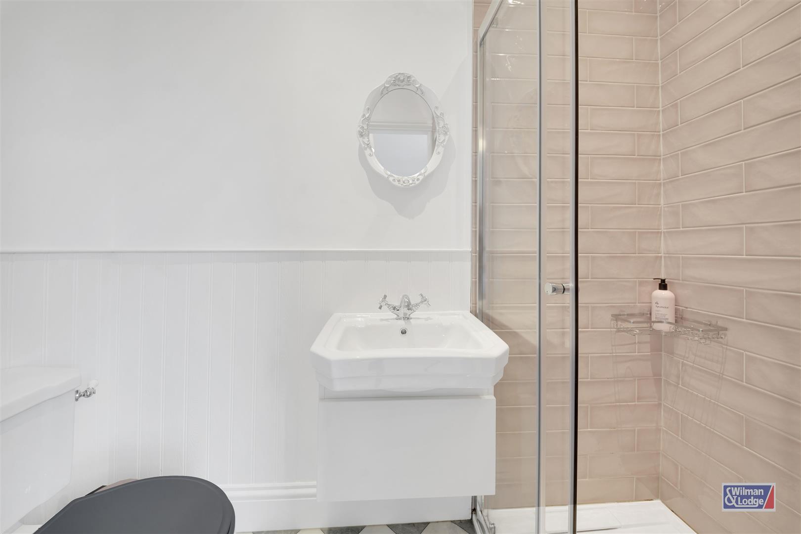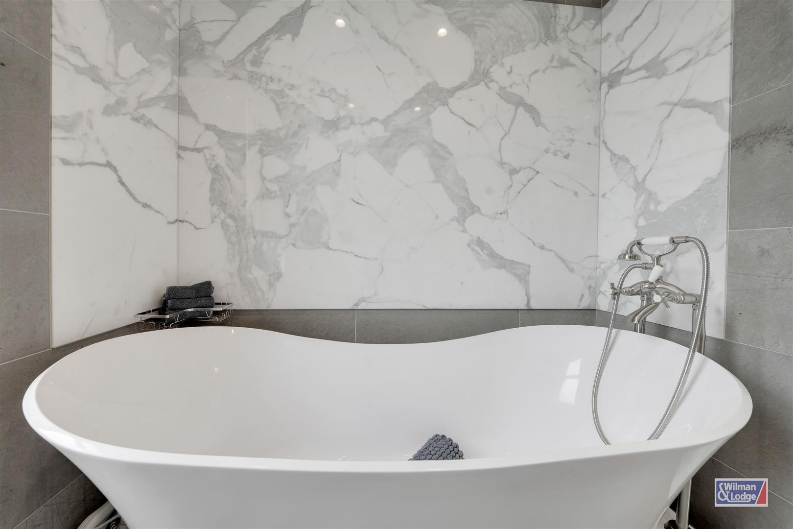 The first floor is home to two generous double bedrooms, including a rear-facing principal suite with stylish ensuite shower room, complete with drencher shower and bespoke tiling. To the front, a large bay window floods the second double bedroom with natural light, offering treetop views and ample space for a reading corner. A luxurious house bathroom serves this floor, with underfloor heating, natural stone tiling and a statement freestanding Lusso stone bath – the perfect spot for relaxation. Also on this level is a fully fitted dressing room with bespoke cabinetry, which could also be used as a nursery or home office.