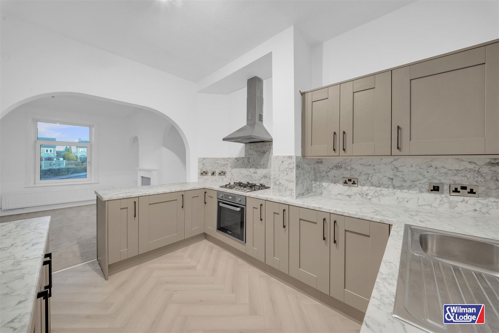 Moving through the property, the heart of the home is revealed: a superb open plan living and dining kitchen. This contemporary space combines a stylish, modern kitchen with a cosy dining and seating area framed by large picture windows. From here, you can access the very practical cellar as well as the first-floor staircase.