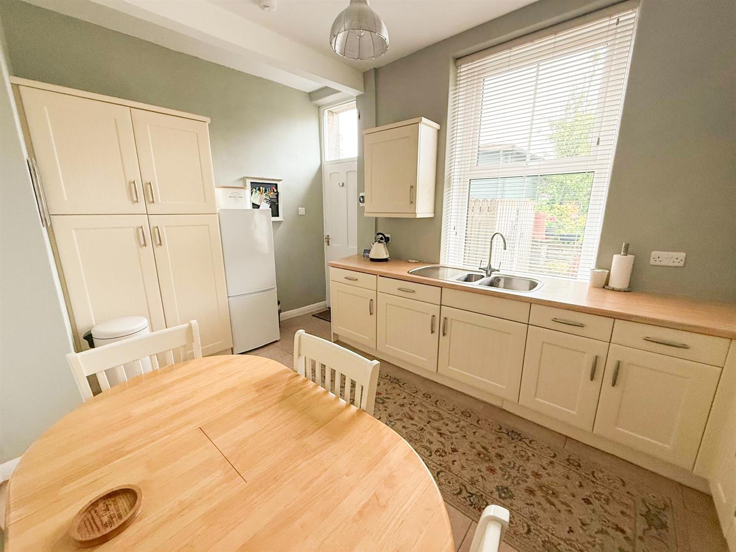 The dining kitchen blends traditional charm with modern practicality, featuring a stylish recessed oven, integrated appliances, tiled flooring, and direct access to a small courtyard with sitting out area to the rear—perfect for indoor-outdoor living.