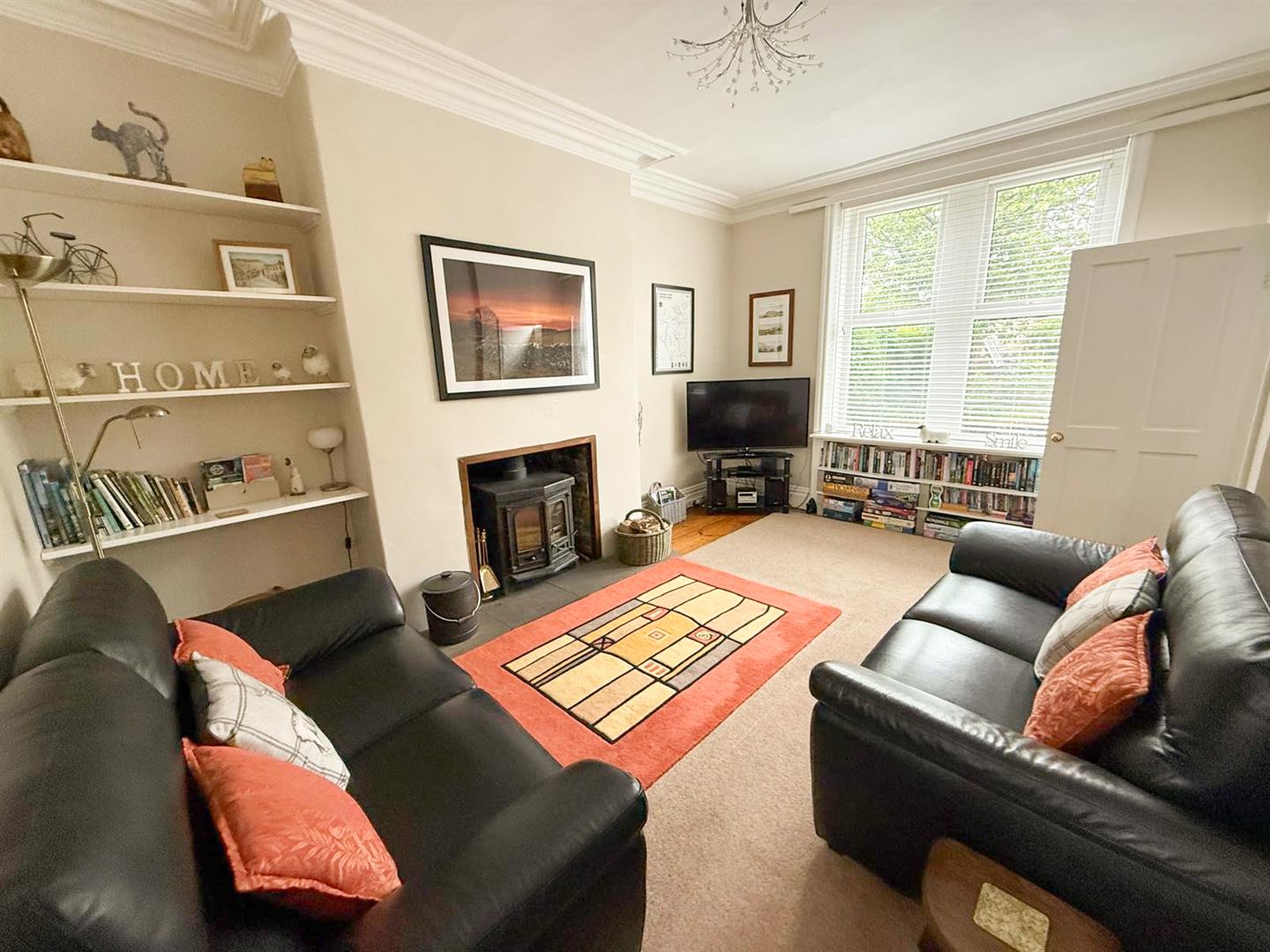 Step through the front door into a warm and inviting entrance hall, where original stripped and polished floorboards offer a glimpse into the home’s heritage. A charming, enclosed staircase rises to the first floor, while the hall flows into a delightful sitting room, which enjoys a large front-facing window with scenic views. This room is rich in period features, including an elegant, recessed fireplace with a multi-fuel stove, original ceiling cornices, a deep wall recess with side window, and the same beautifully restored flooring.