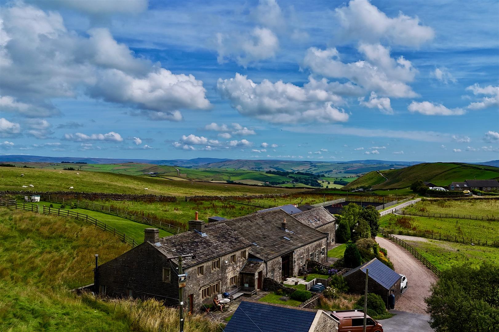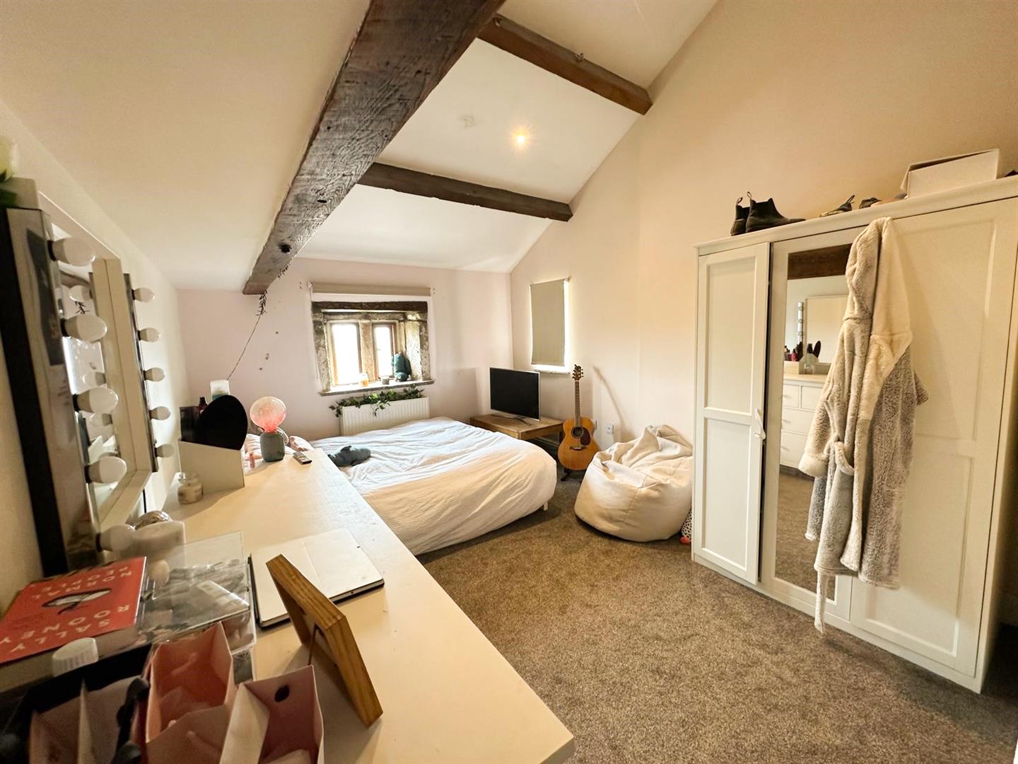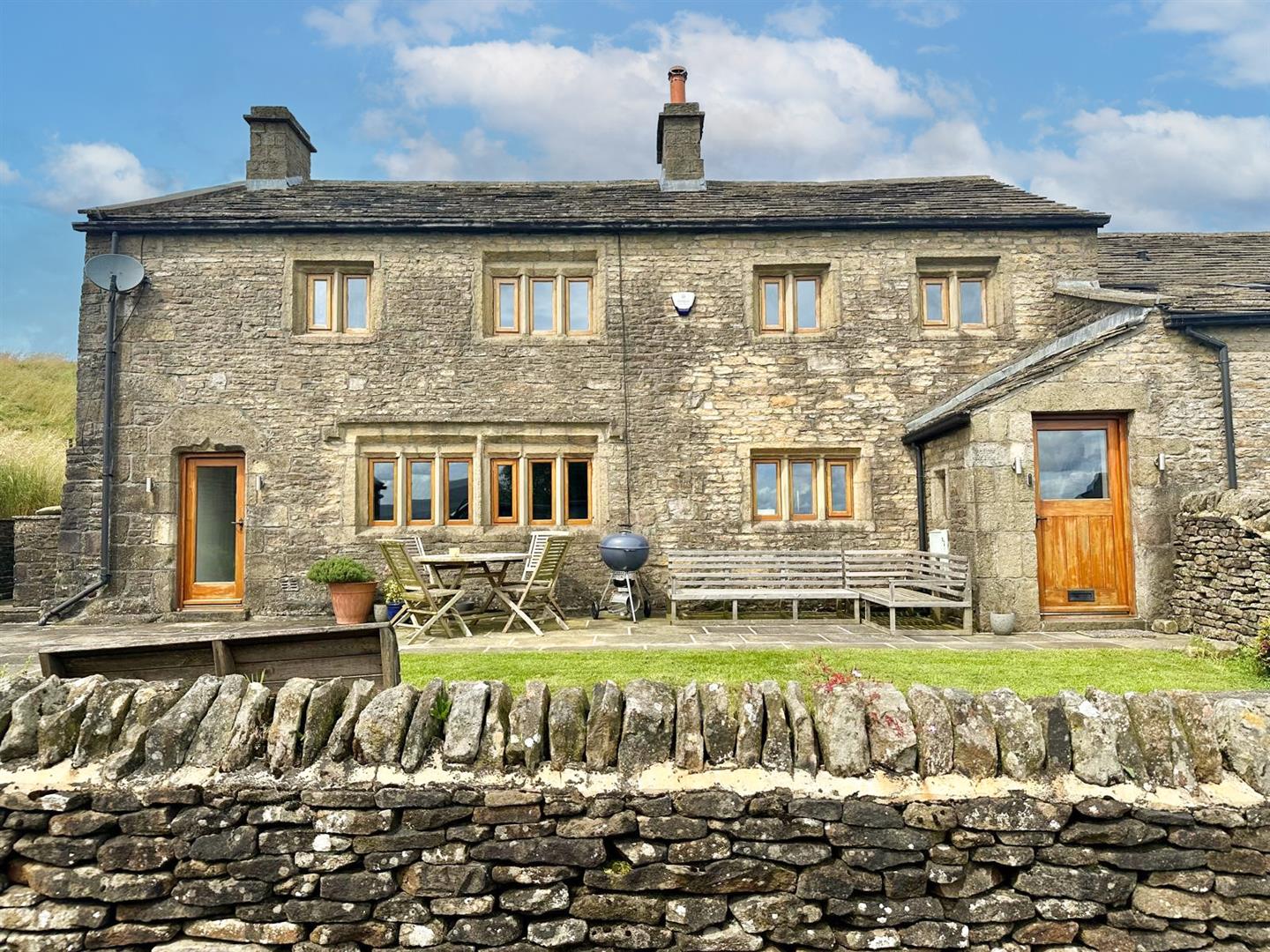The first floor comprises a generous landing, four well-proportioned bedrooms, and a luxurious four-piece house bathroom. Externally, the farmhouse is set within approximately 1.3 acres of partly terraced land, featuring dry stone walling and fencing along the boundaries. The front elevation boasts a paved patio seating area and a lawn offering stunning views.