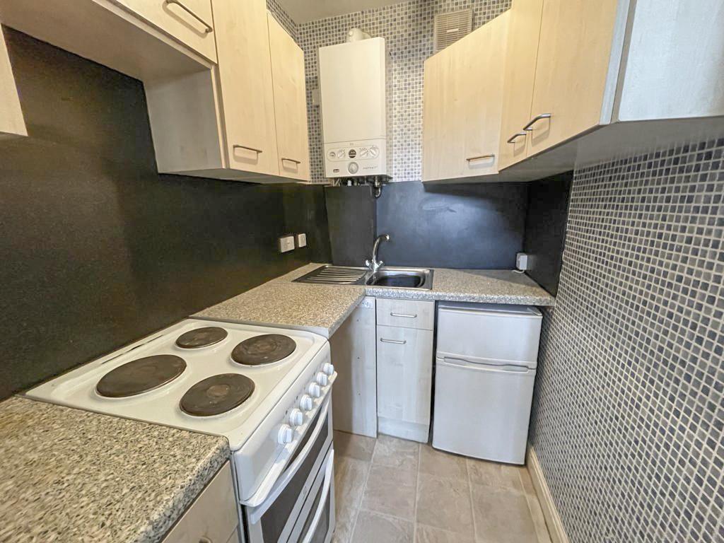 Compact style kitchen with a range of fitted base and wall units with stainless steel sink unit with mixer tap. Slot in fridge freezer and free standing electric oven. Wall mounted gas fired central heating boiler (approx. 1 year old).