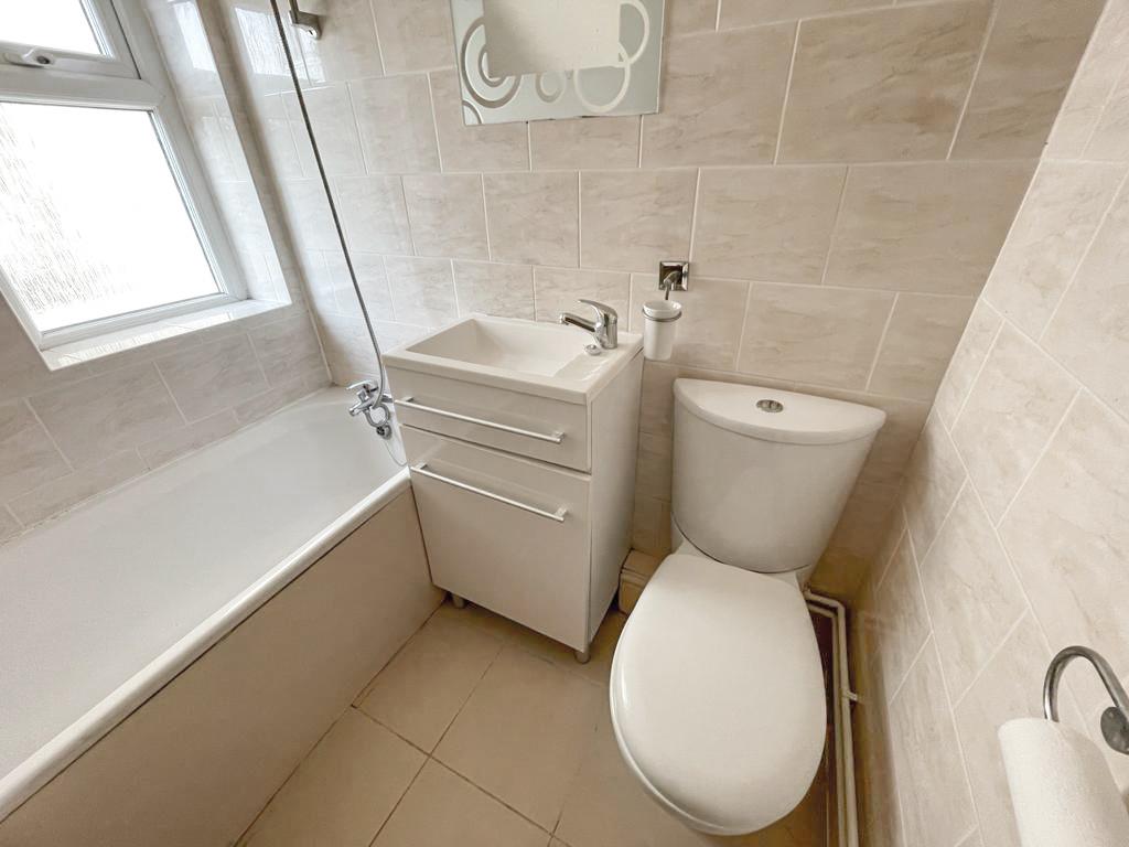steps down to fully tiled bathroom having fitted white suite with panelled bath with mixer tap and shower attachment. Vanity unit style wash hand basin with cupboards below, and low suite w.c. uPVC sealed unit opaque glazed window to rear elevation.