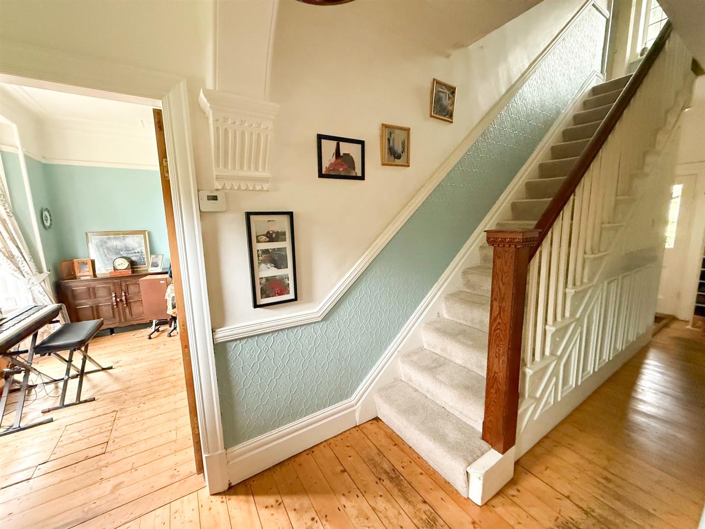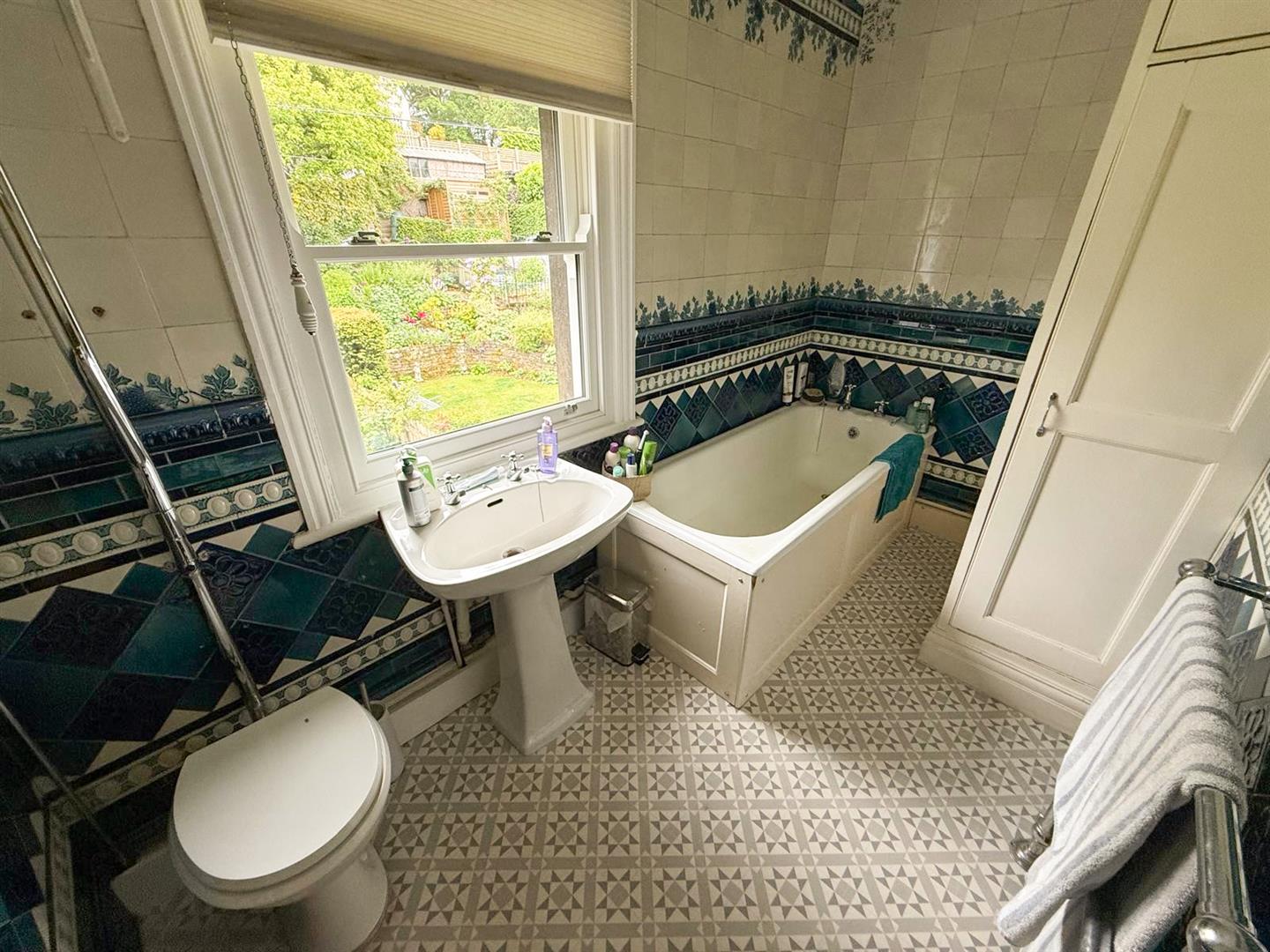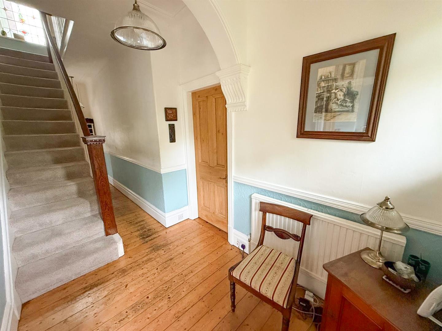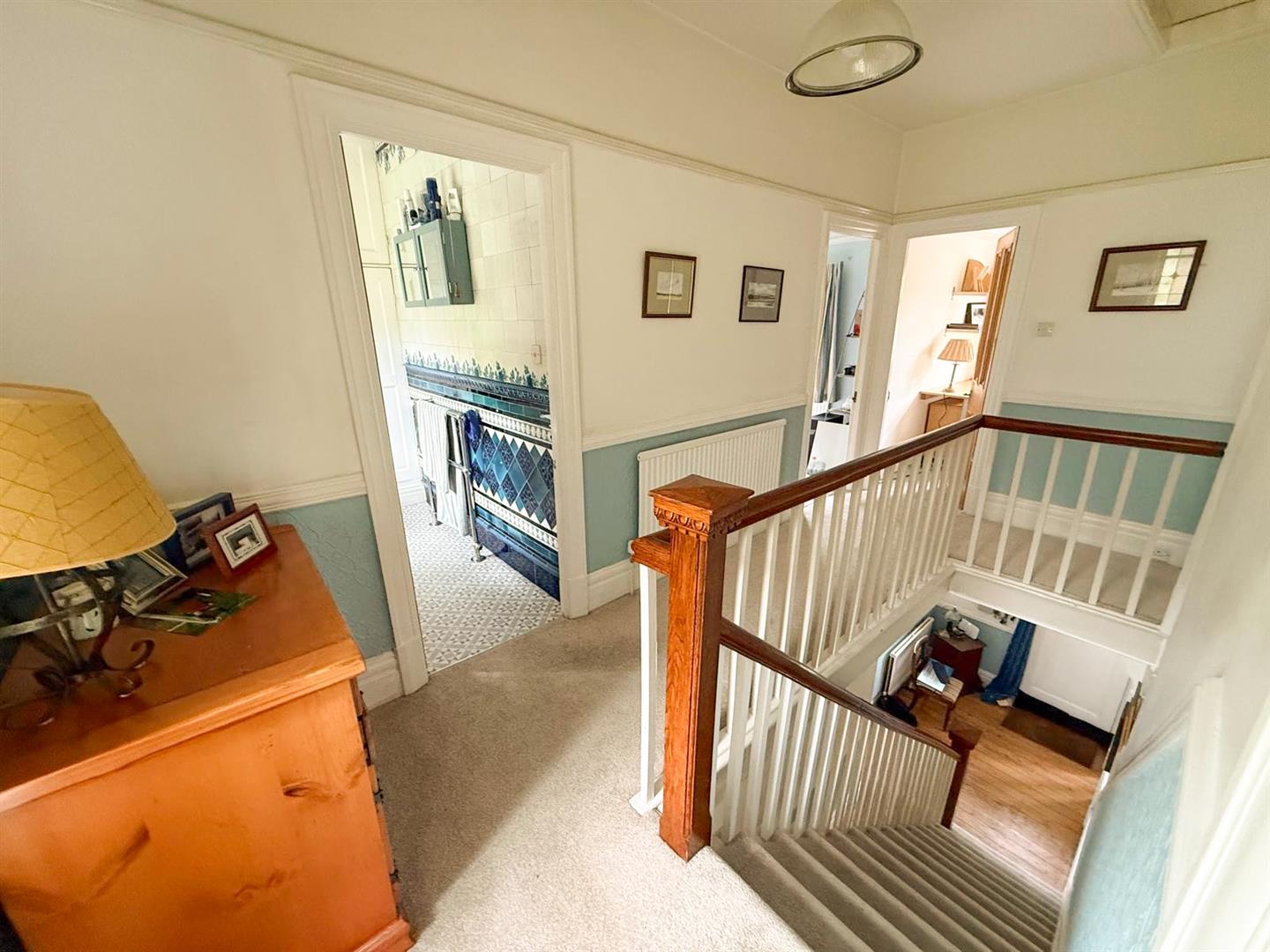 Upstairs, a wide landing with a beautiful stained-glass window leads to two spacious double bedrooms, a further double with additional adjoining box room/dressing area and a comfortable single room, perfect for family living or a home office. The accommodation is completed by a three-piece house bathroom.