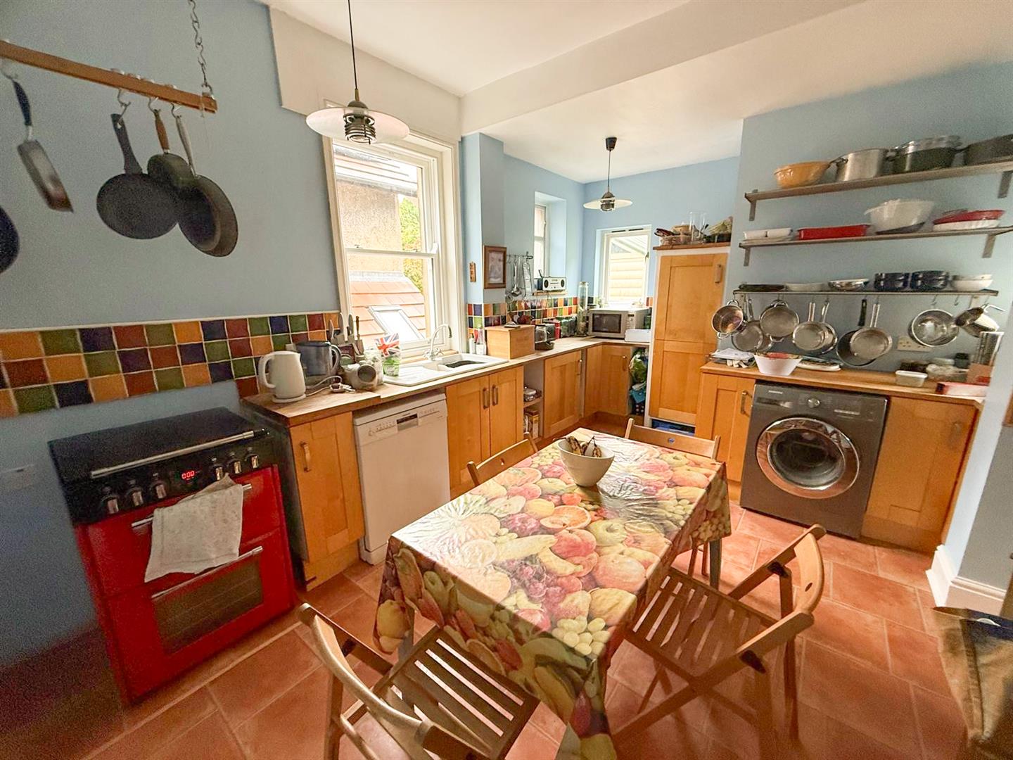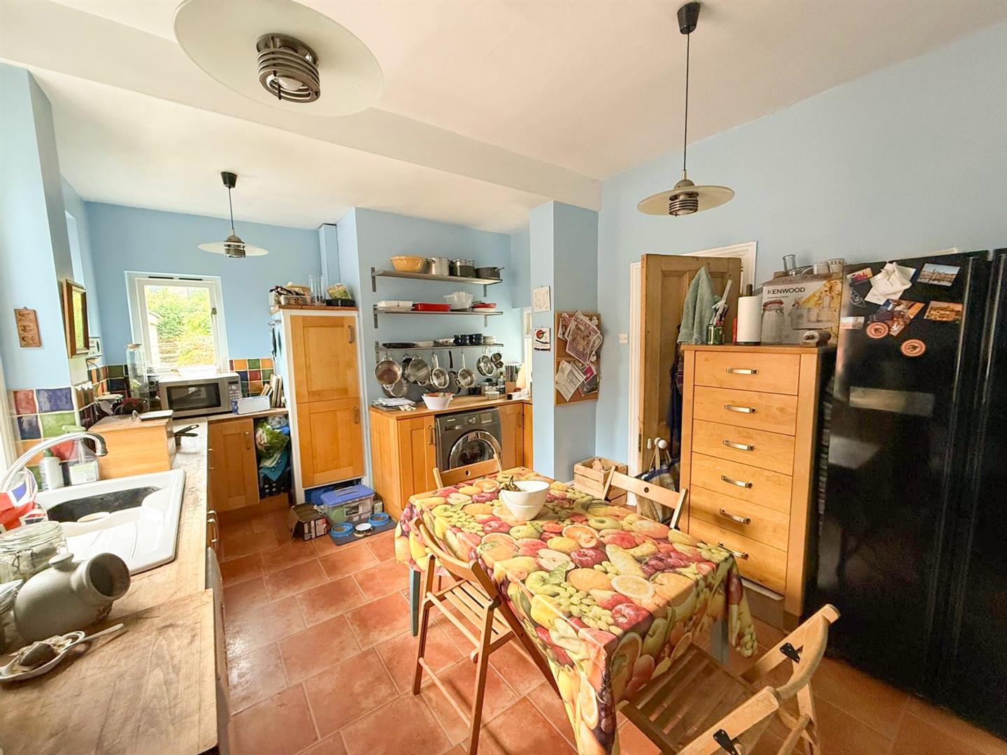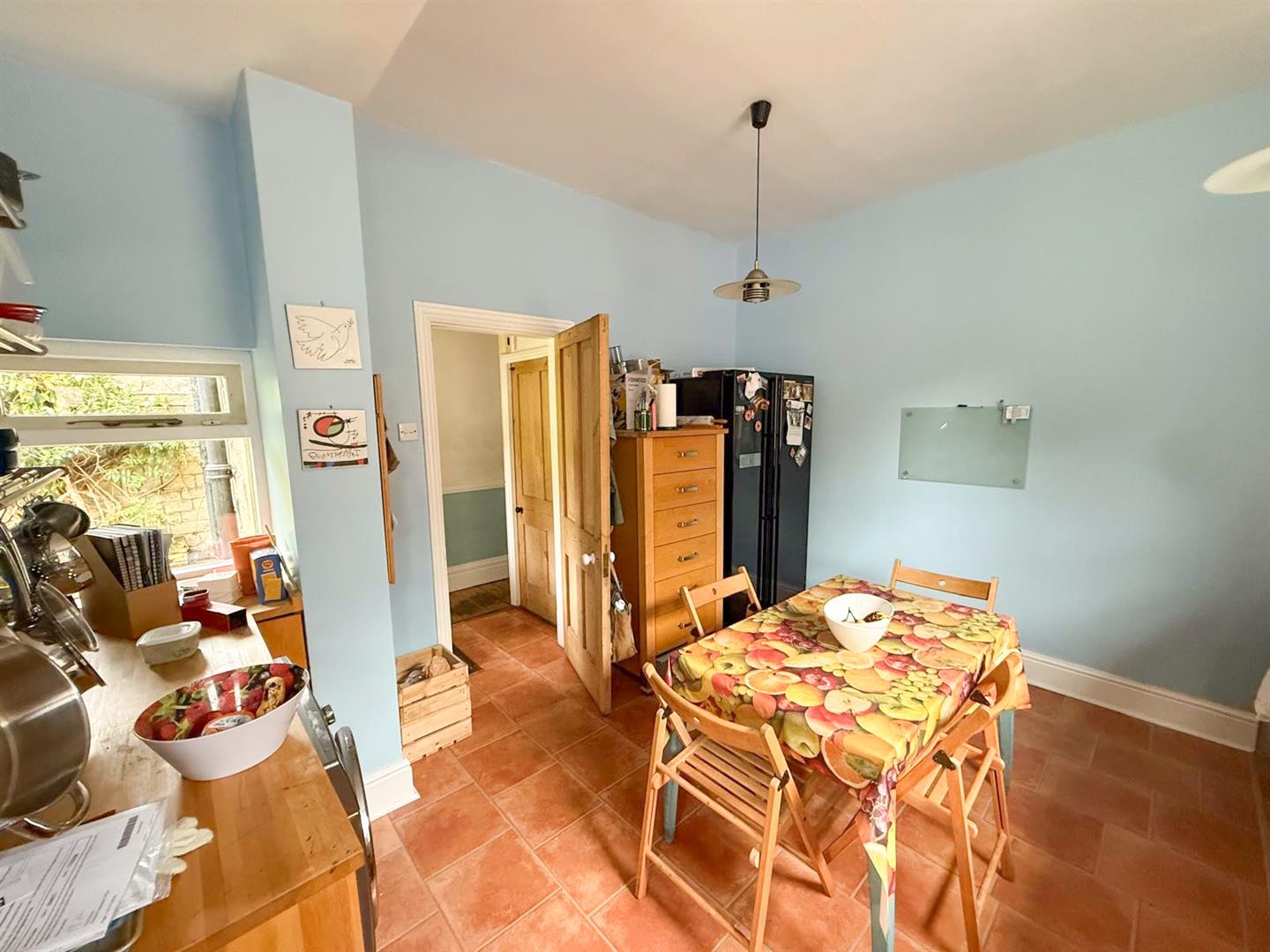 To the rear of the property, the spacious dining kitchen provides a practical yet pleasant setting for daily life, complete with a range of fitted units and delightful views over the rear garden. A particularly useful addition is the keeping cellar, ideal for storage or potential development.