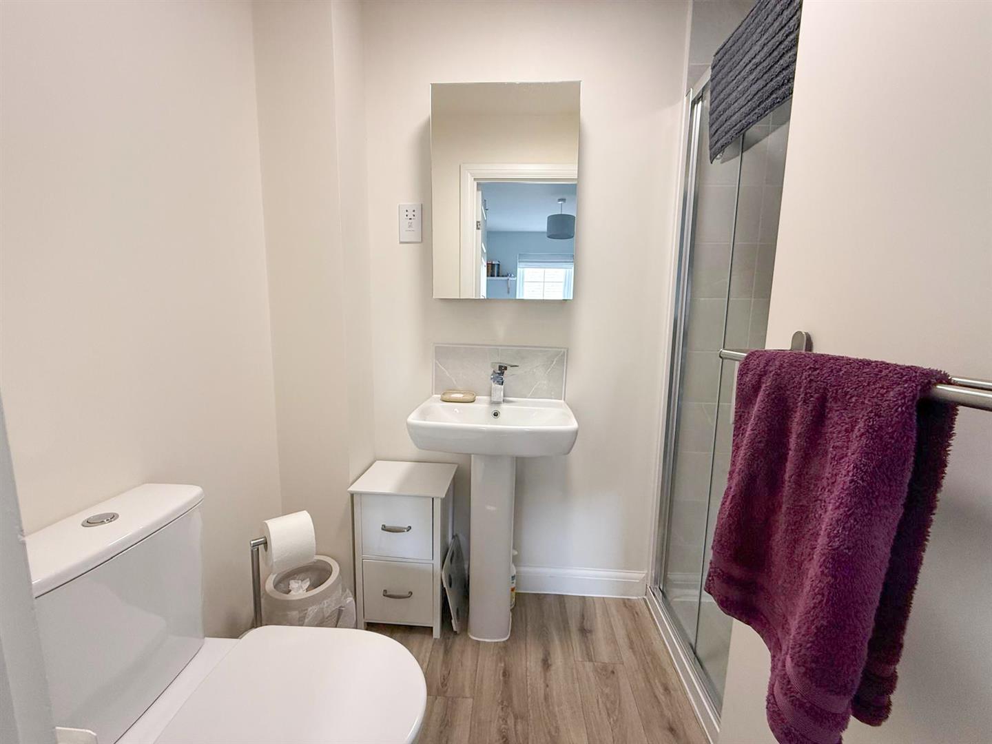 comprising; fully tiled bath and shower, low suite W.C., pedestal wash hand basin, bathroom mirror cabinet, vinyl floor, uPVC window and extractor fan.