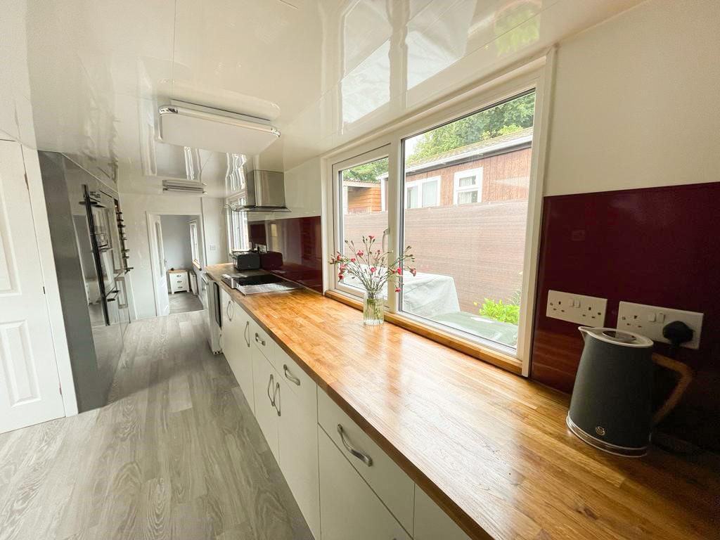With a stunning range of contrasting high gloss wall and base units, stainless steel sink and drainer unit with matching mixer tap, solid wood work surfaces over with matching upstands, built in AEG steam fan oven with Zanussi combi microwave, 2nd oven and Bosch warming drawer, KKT Kolbe ceramic hob, large Smeg fridge/freezer, integral Hotpoint dishwasher, large built in wine rack, recessed and plinth lighting.