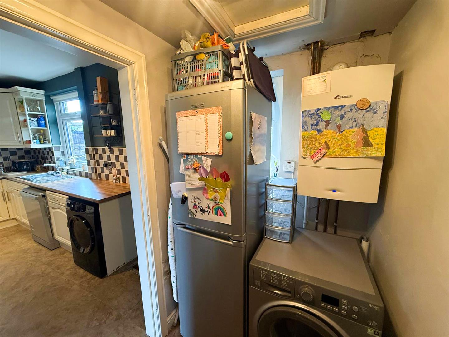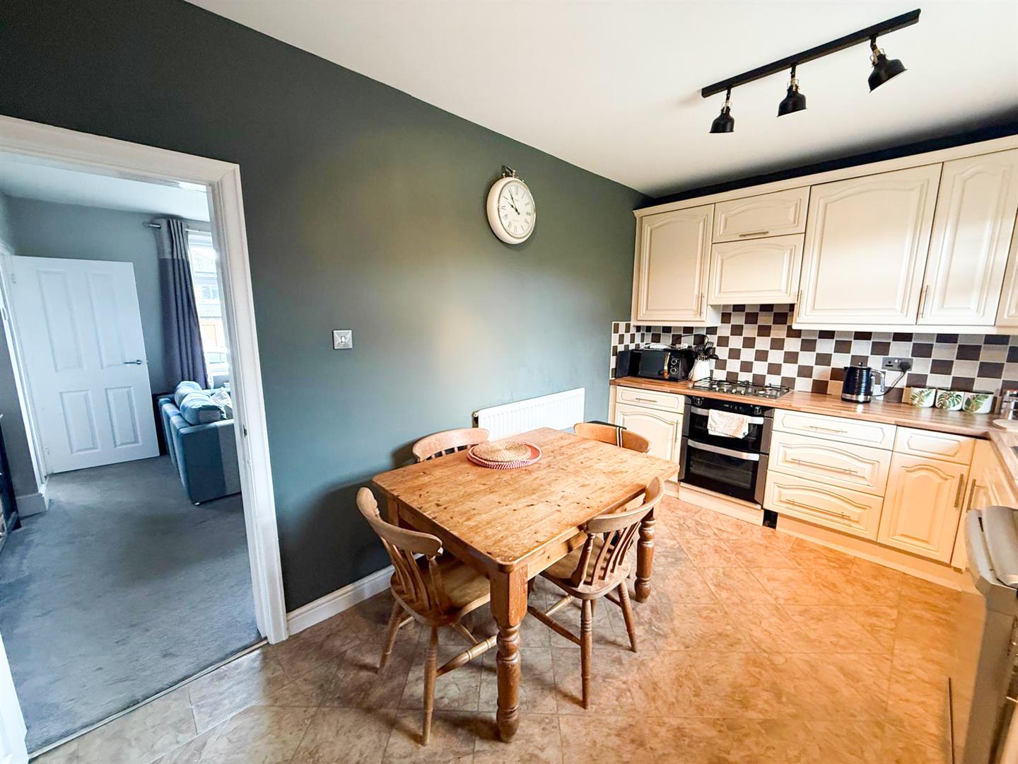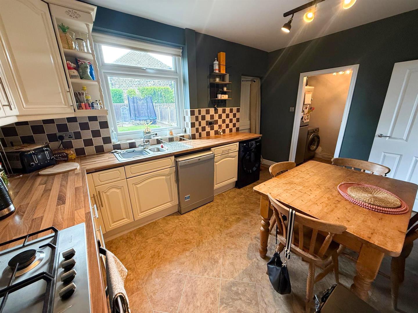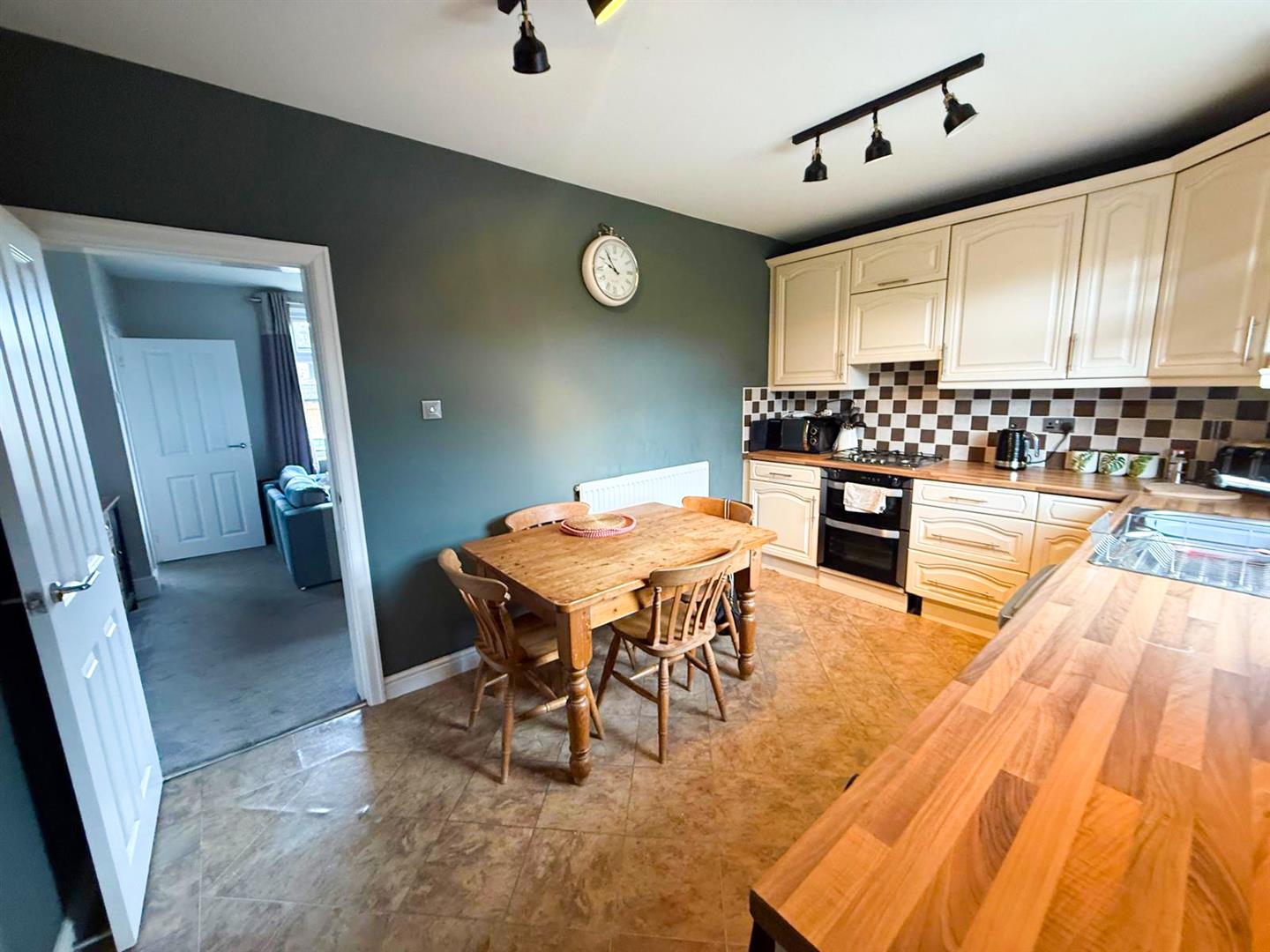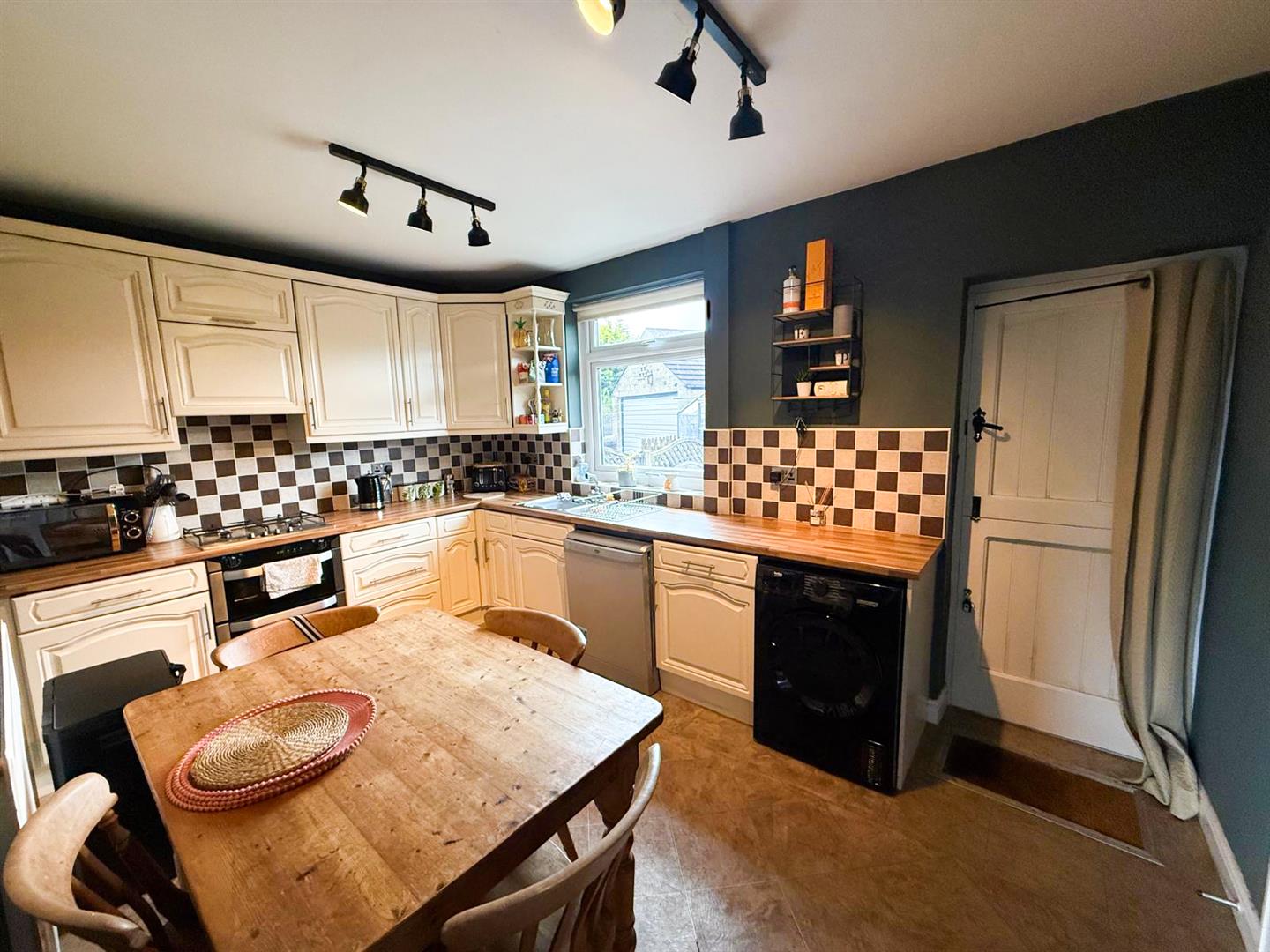 At the rear, the impressive dining kitchen offers a superb range of wall and base units, providing ample storage and workspace. Dual windows flood the space with daylight, while a door opens directly to the rear garden – perfect for indoor-outdoor living. A particularly useful utility room sits just off the kitchen, adding further practicality to the home.