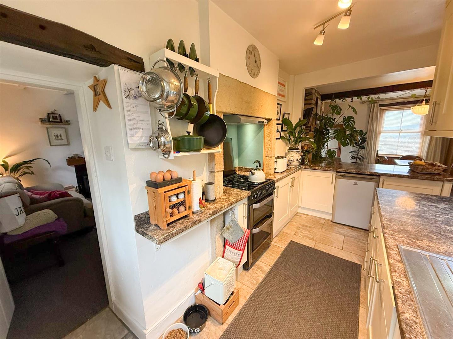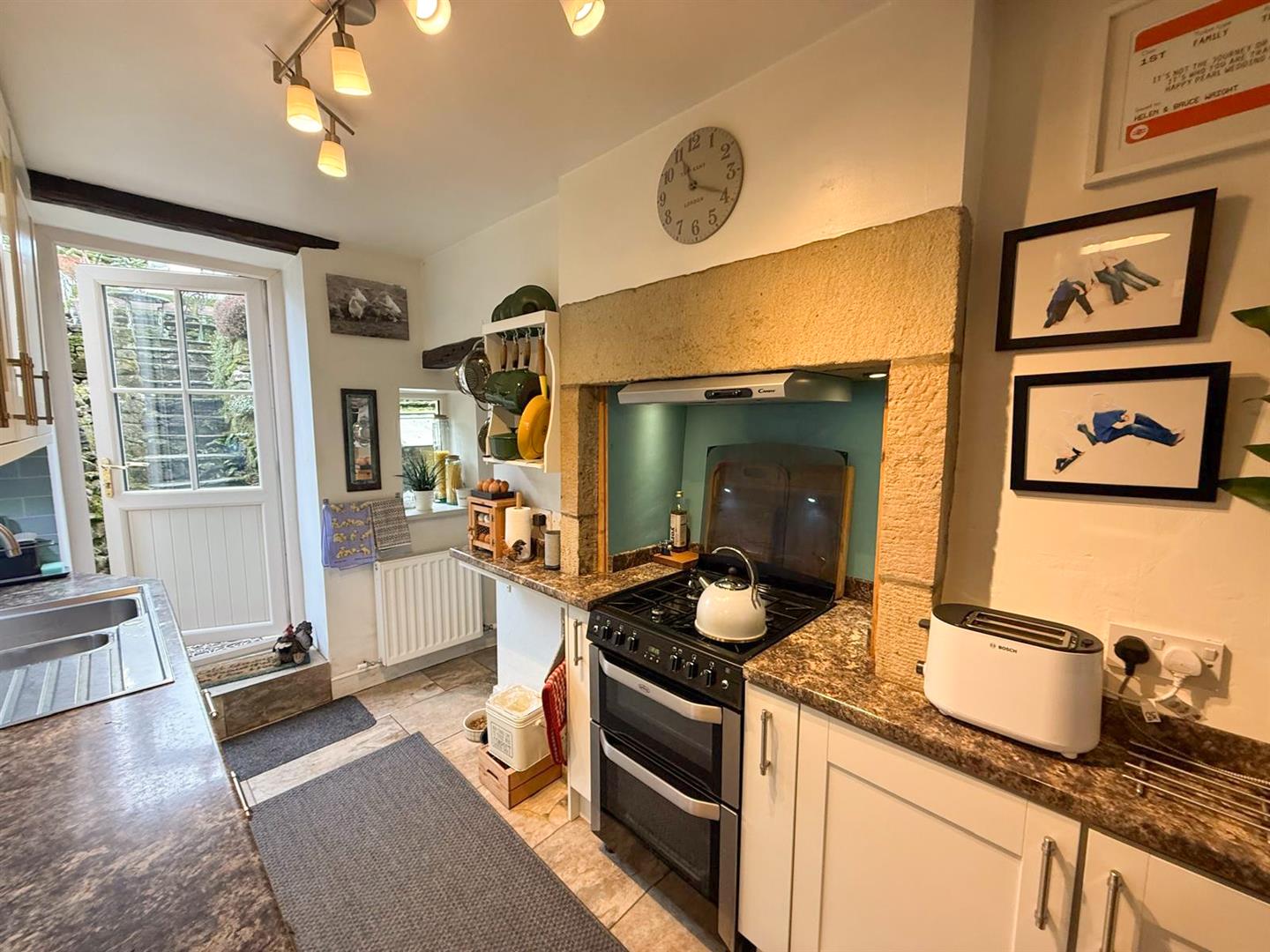 The kitchen itself is thoughtfully designed, blending modern convenience with cottage charm. It features a recessed oven with an overhead lintel and provides direct access to the rear garden as well as the sitting room. The adjoining sitting room boasts a recessed fireplace with a multi-fuel stove, exposed stonework, and beams, creating a perfect spot to unwind while enjoying the garden views.
