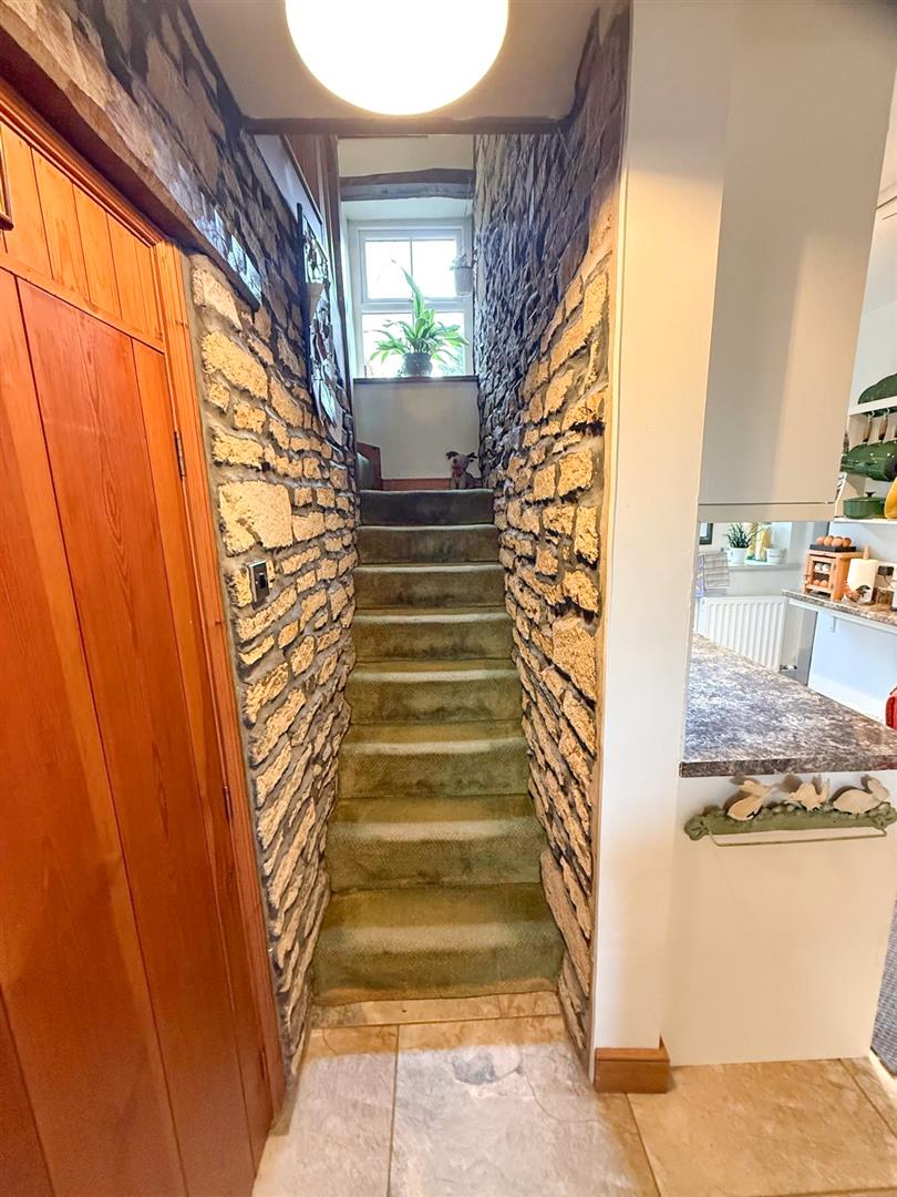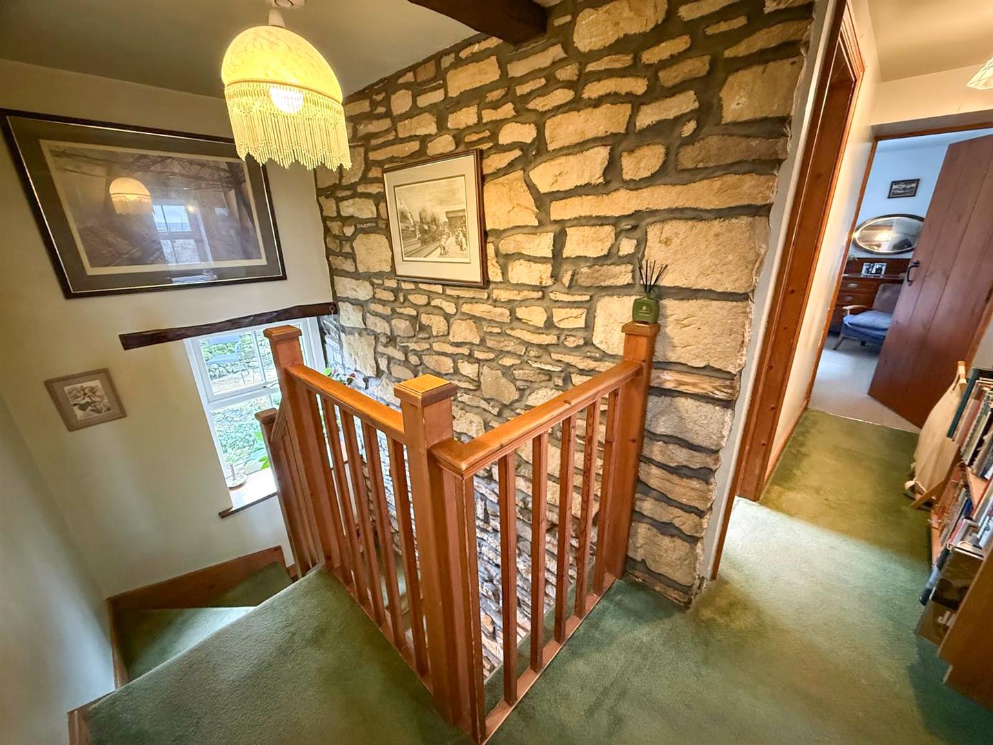 From the kitchen, an open staircase leads to the first floor, showcasing exposed stonework and a rear elevation window framing stunning views. The spacious landing provides access to the loft, which has been creatively used as a hobby space, complete with power, lighting, and a Velux window.