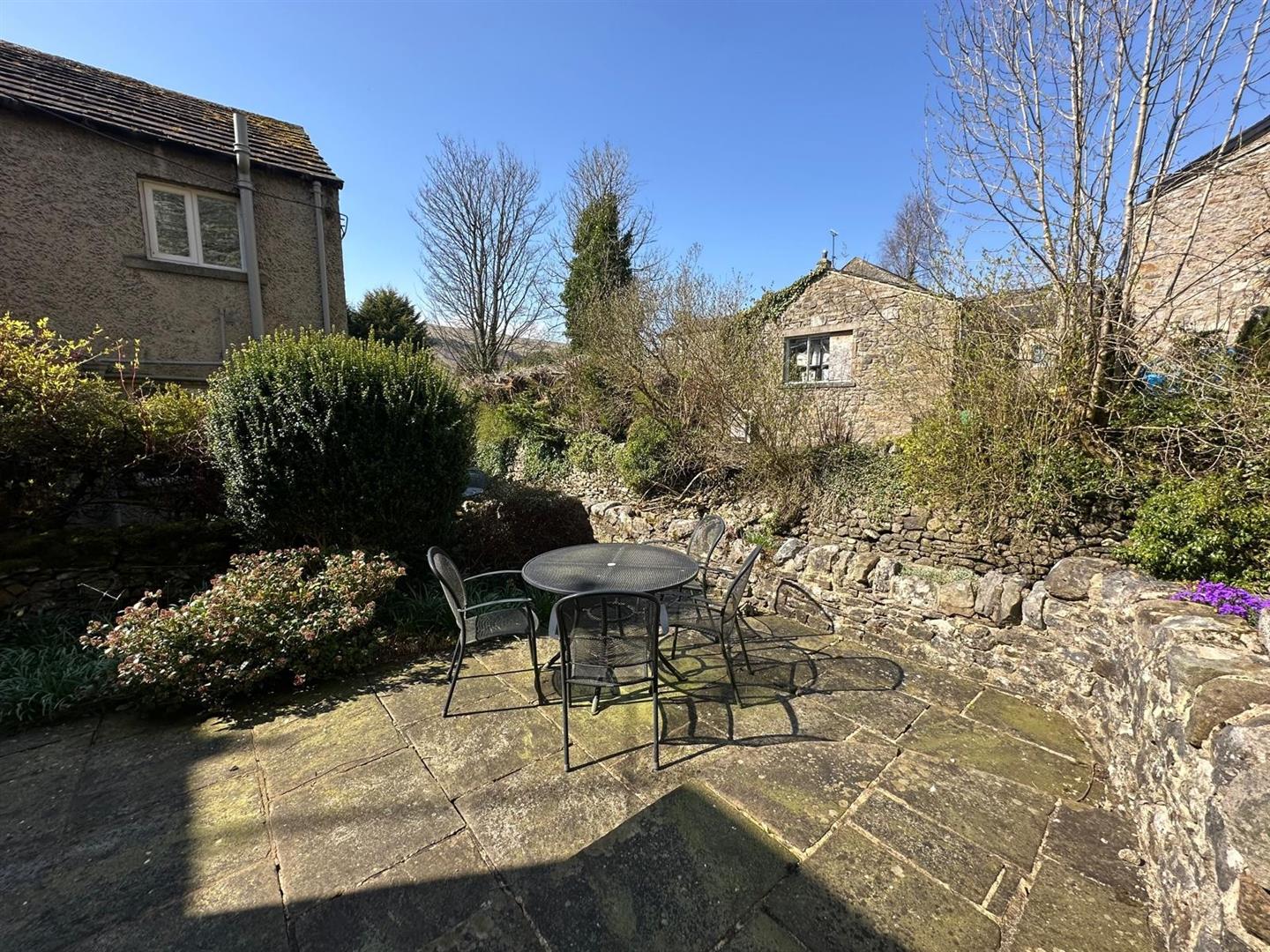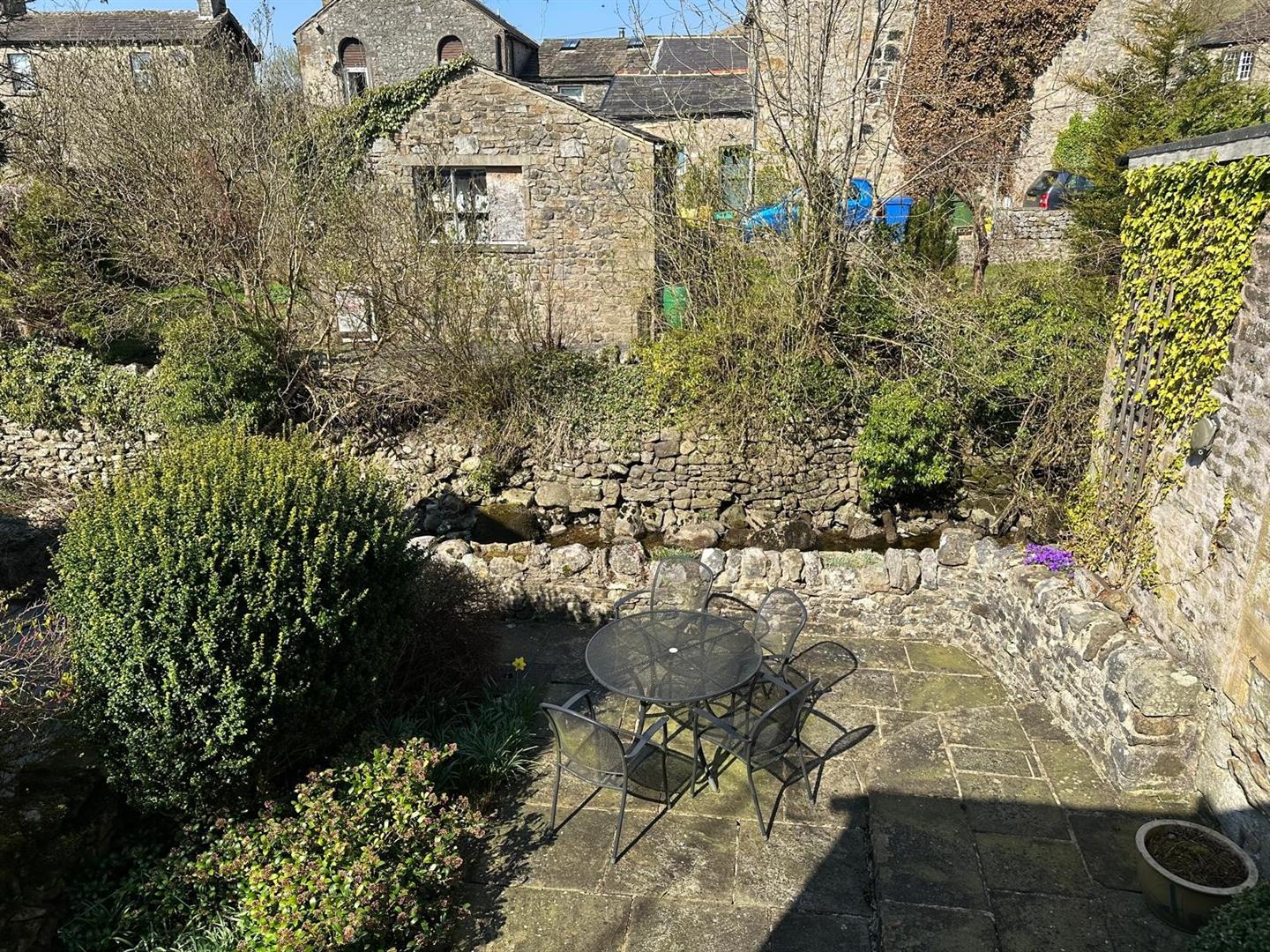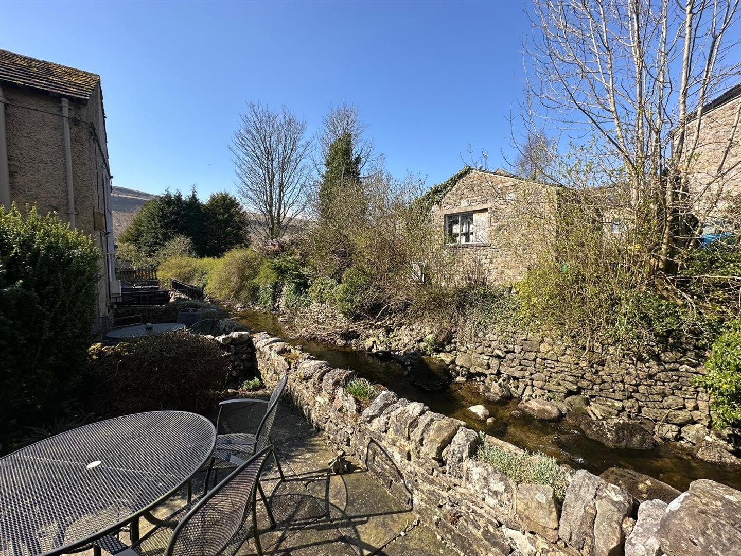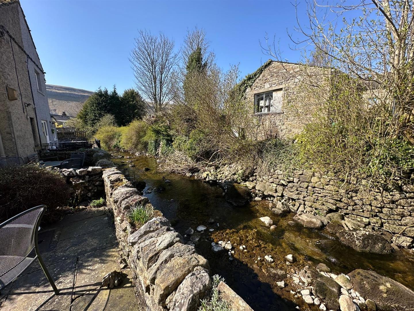 The sitting room is a standout feature: a warm, inviting space with large windows that let in plenty of natural light, a striking stone fireplace with an open fire, and original ceiling beams that lend an authentic, cosy cottage atmosphere. From the rear hallway, step out into a peaceful, paved garden—perfect for unwinding or entertaining—surrounded by mature shrubs and bordered by the tranquil beck that weaves through the heart of Kettlewell.