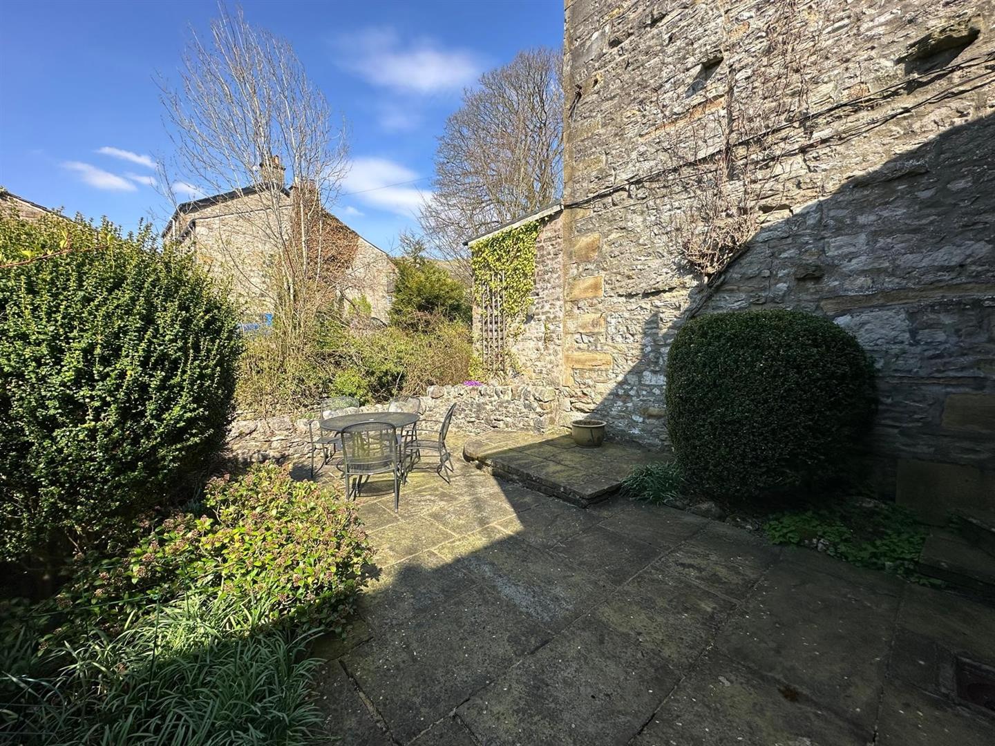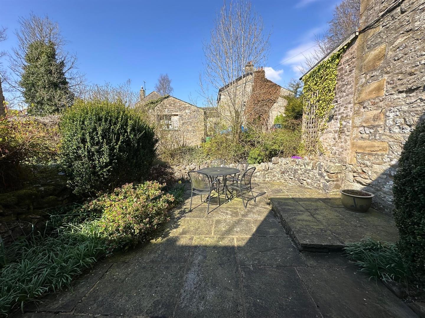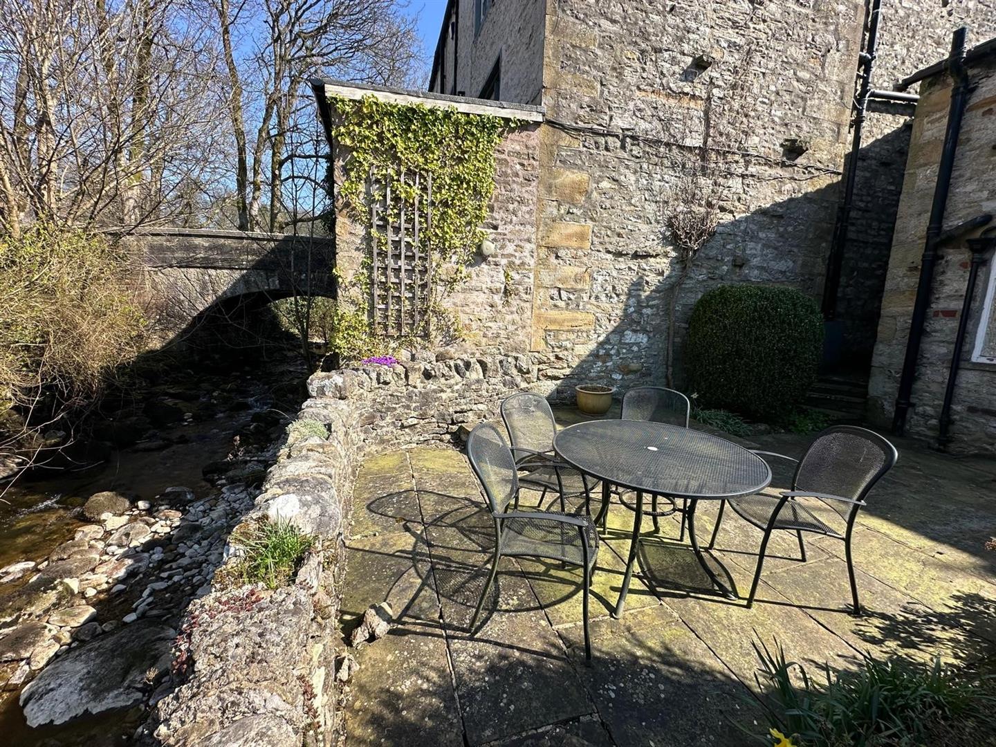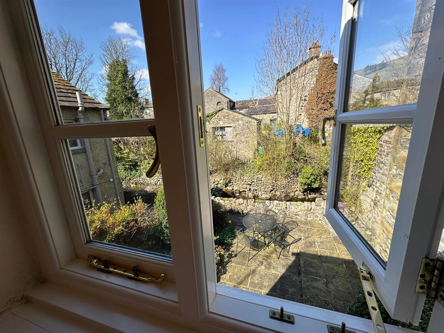 The sitting room is a standout feature: a warm, inviting space with large windows that let in plenty of natural light, a striking stone fireplace with an open fire, and original ceiling beams that lend an authentic, cosy cottage atmosphere. From the rear hallway, step out into a peaceful, paved garden—perfect for unwinding or entertaining—surrounded by mature shrubs and bordered by the tranquil beck that weaves through the heart of Kettlewell.
