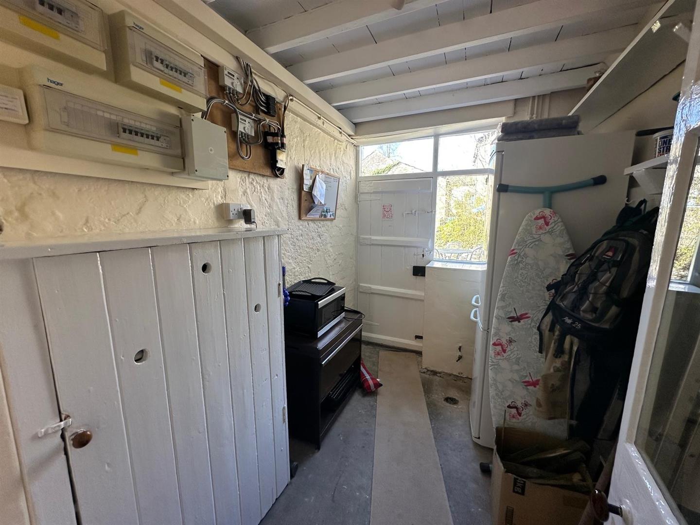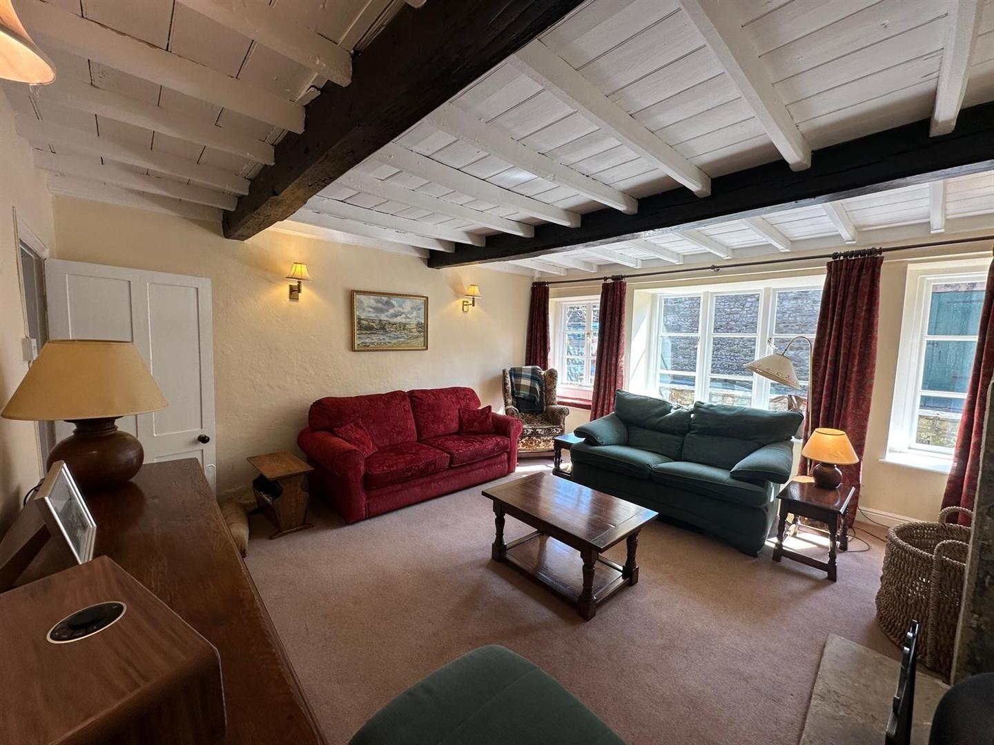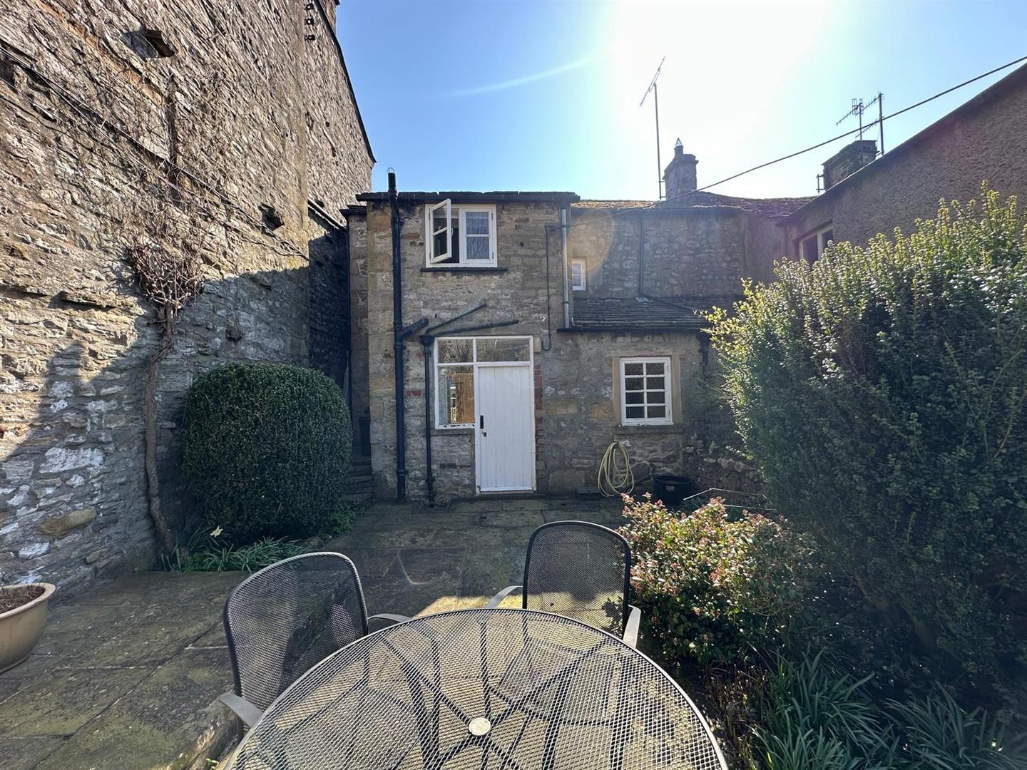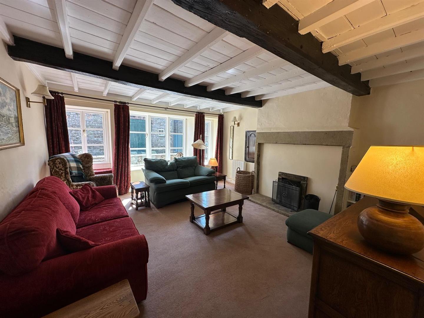 The sitting room is a standout feature: a warm, inviting space with large windows that let in plenty of natural light, a striking stone fireplace with an open fire, and original ceiling beams that lend an authentic, cosy cottage atmosphere. From the rear hallway, step out into a peaceful, paved garden—perfect for unwinding or entertaining—surrounded by mature shrubs and bordered by the tranquil beck that weaves through the heart of Kettlewell.