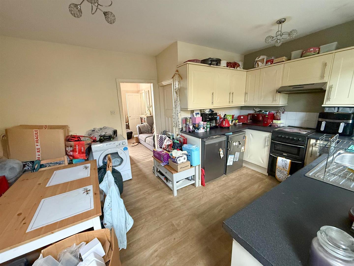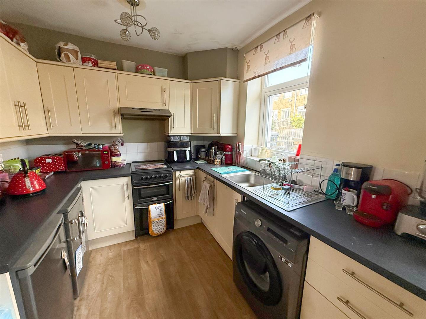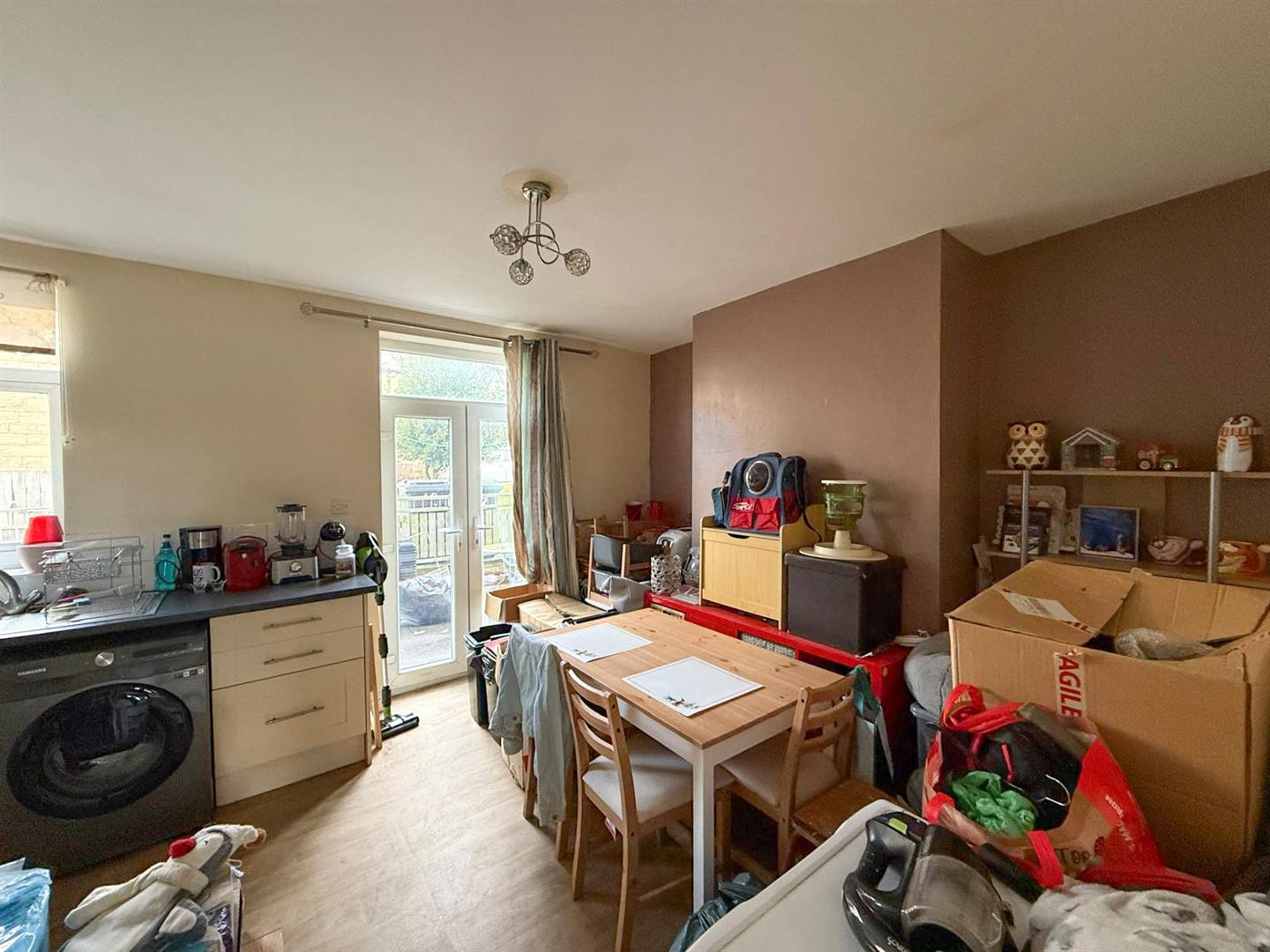The spacious living/dining kitchen is well equipped and bright, featuring a rear-facing window and French doors that open directly onto the garden, creating a lovely flow between indoor and outdoor living.