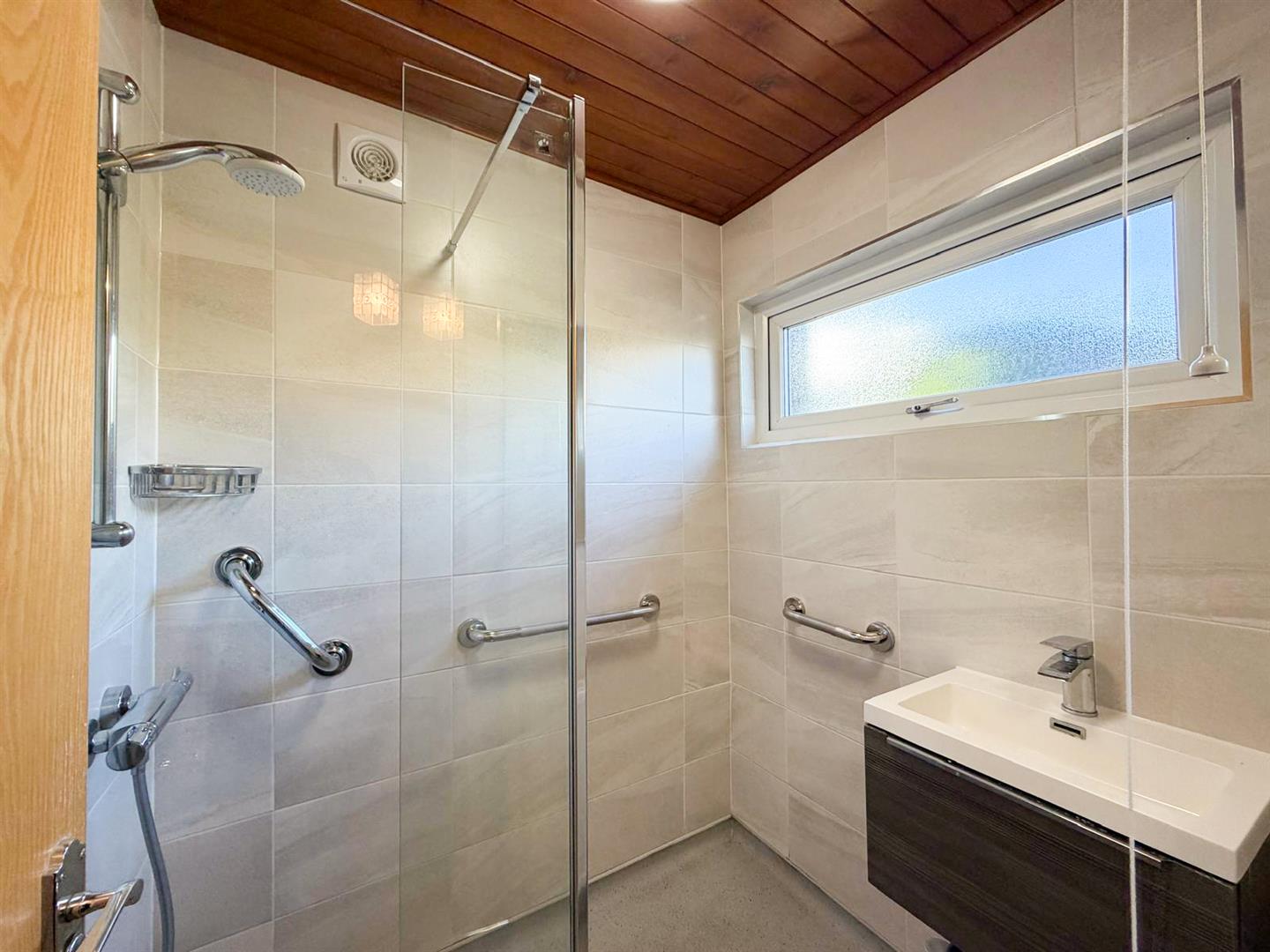 Upon entering, you are greeted by a spacious hallway with an open return staircase leading to the first floor. The ground floor features a modern shower room and a separate W.C. At the front of the house, the sitting room boasts a large picture window that floods the space with natural light and offers a pleasant view of the garden. An attractive fireplace and wood flooring add a touch of elegance to the room. Further along the hallway, a large walk-in cupboard provides practical storage solutions.