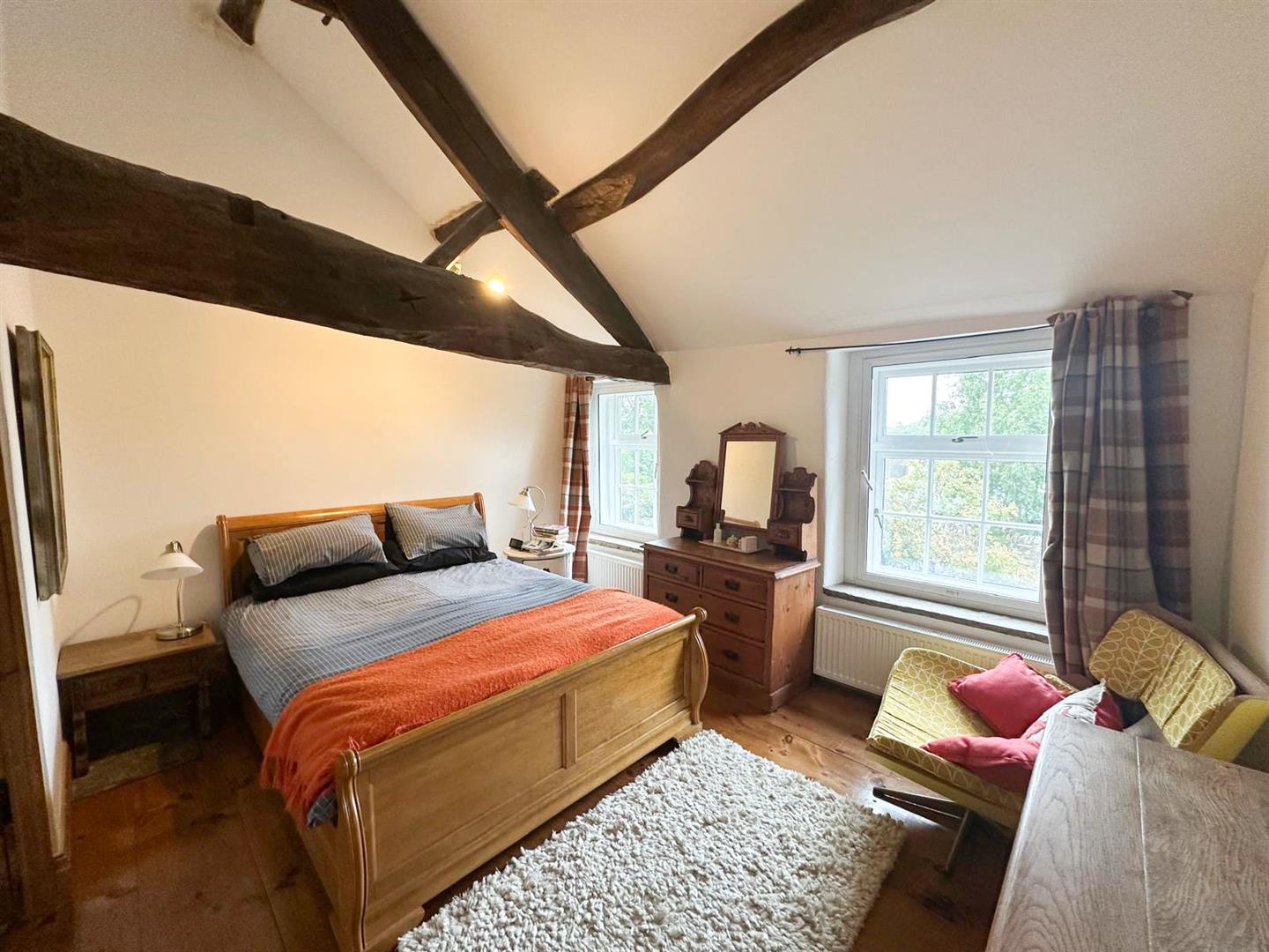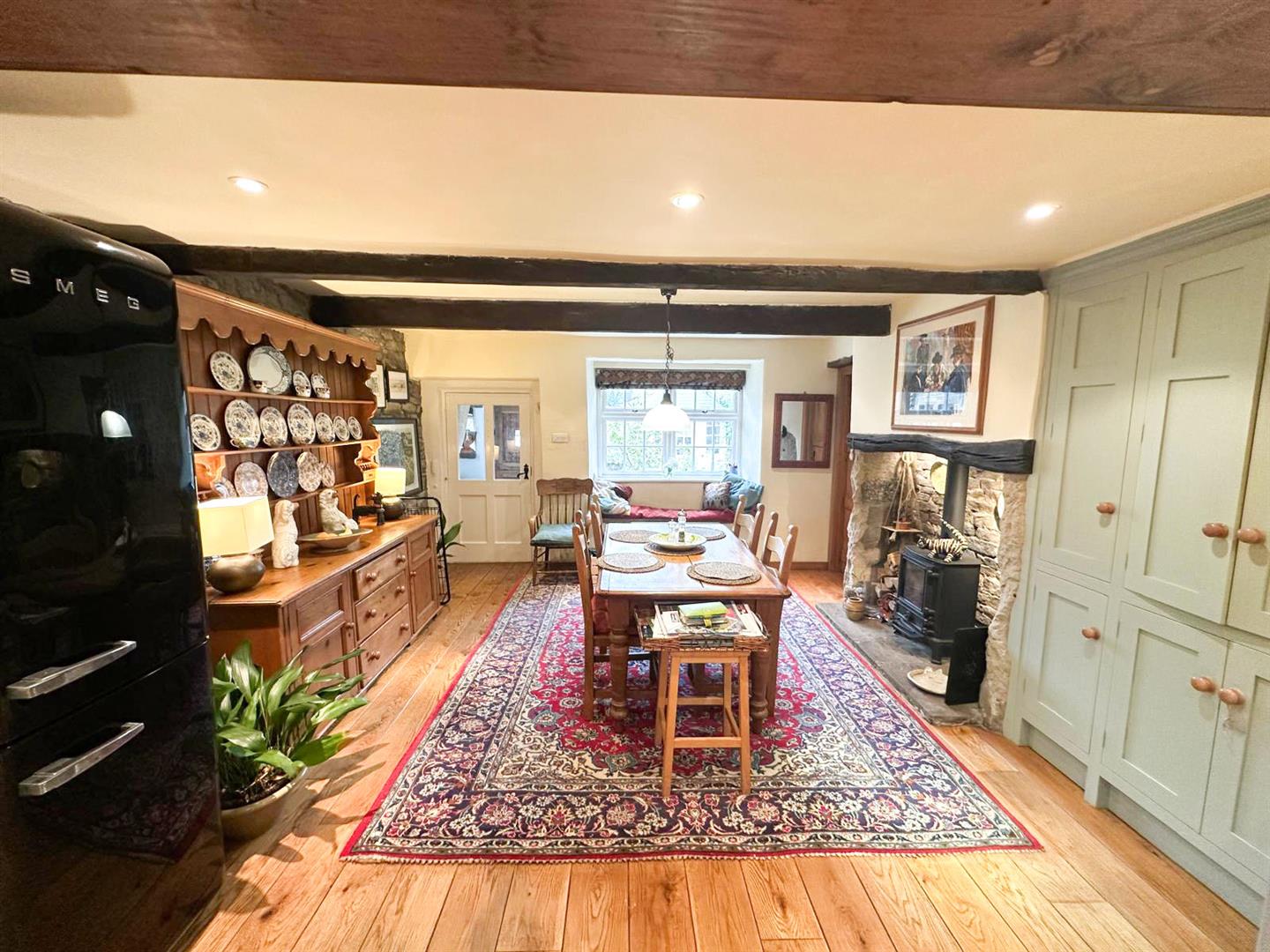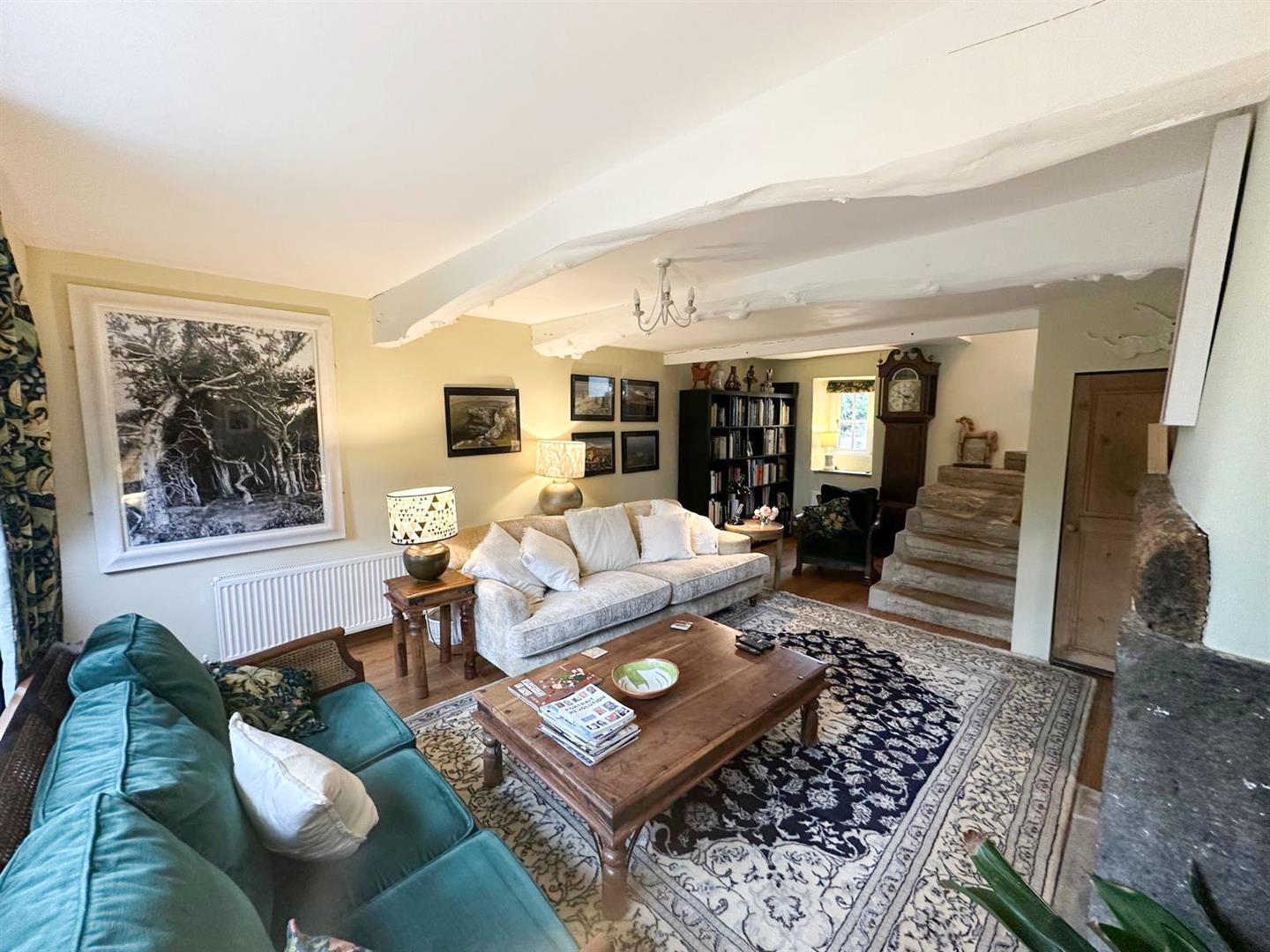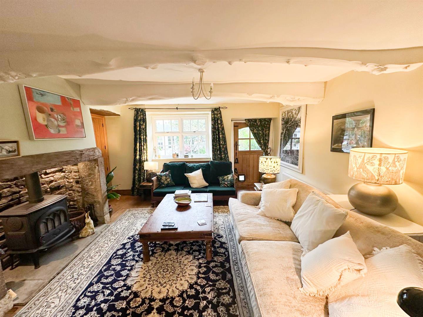 Stepping inside, you are welcomed through a porch into the dining kitchen—a delightful space with bespoke oak cabinetry, Belfast sink, and oak flooring under exposed beams, with a cosy window seat that makes the perfect spot to enjoy a quiet morning. From here, the living room continues the theme of rustic charm with its exposed stone wall, beams, oak flooring and a handsome Inglenook fireplace. Flooded with natural light from windows front and back, it also features an open stone staircase and direct access to the garden, making it both practical and atmospheric.