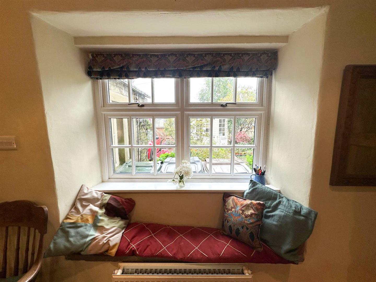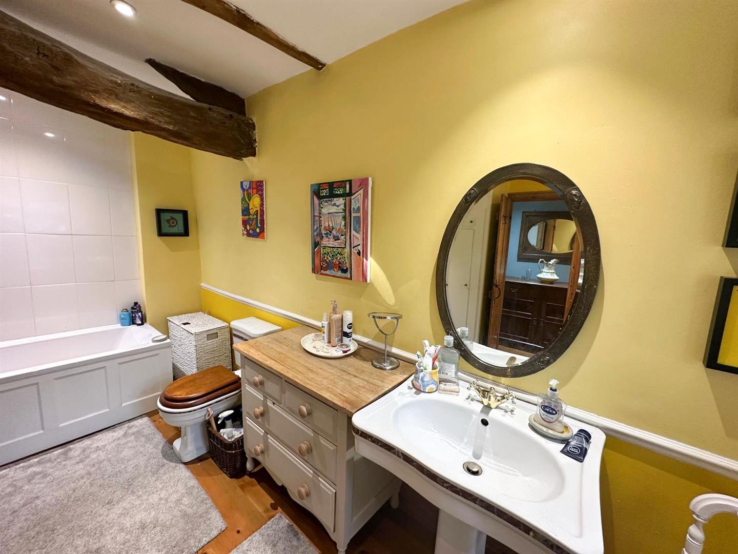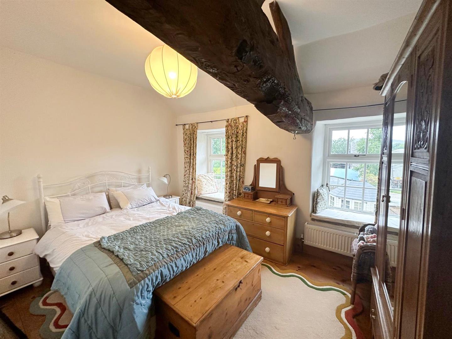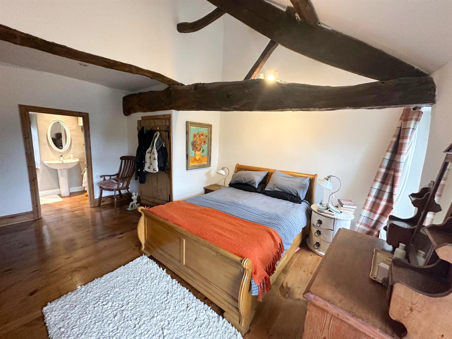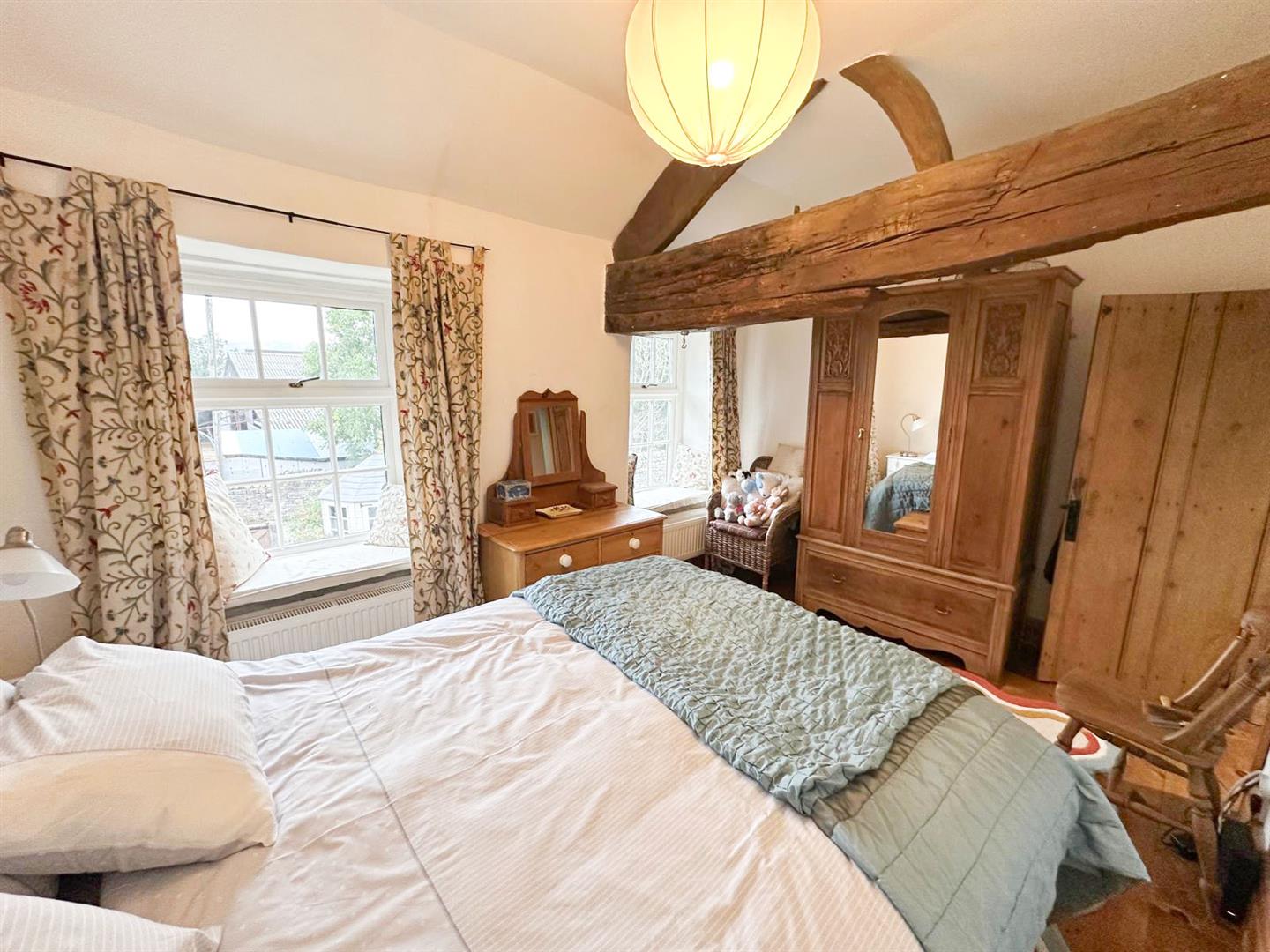 Stepping inside, you are welcomed through a porch into the dining kitchen—a delightful space with bespoke oak cabinetry, Belfast sink, and oak flooring under exposed beams, with a cosy window seat that makes the perfect spot to enjoy a quiet morning. From here, the living room continues the theme of rustic charm with its exposed stone wall, beams, oak flooring and a handsome Inglenook fireplace. Flooded with natural light from windows front and back, it also features an open stone staircase and direct access to the garden, making it both practical and atmospheric.