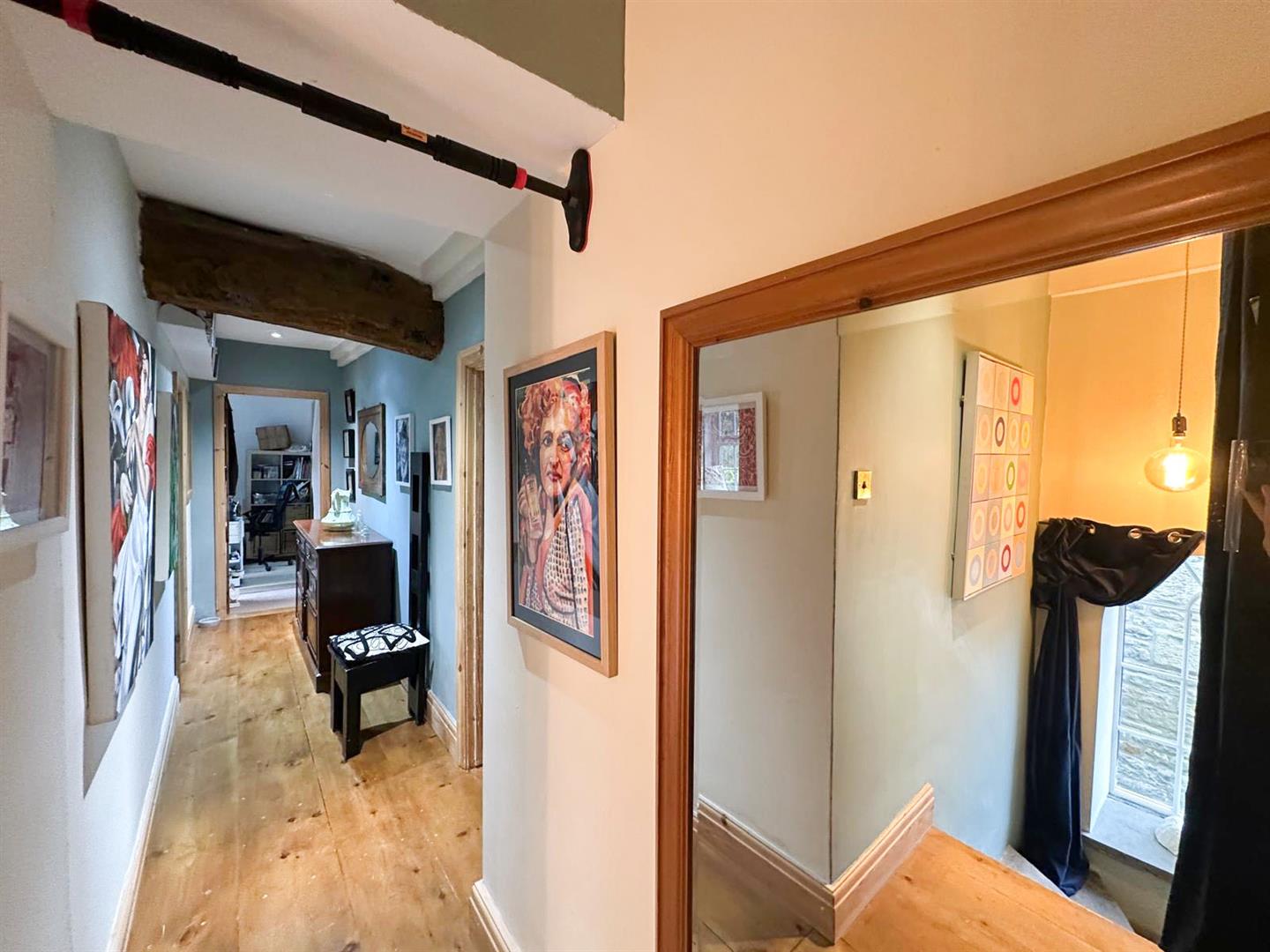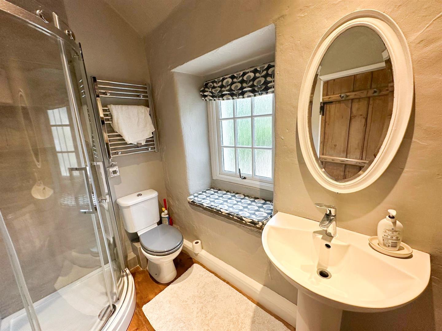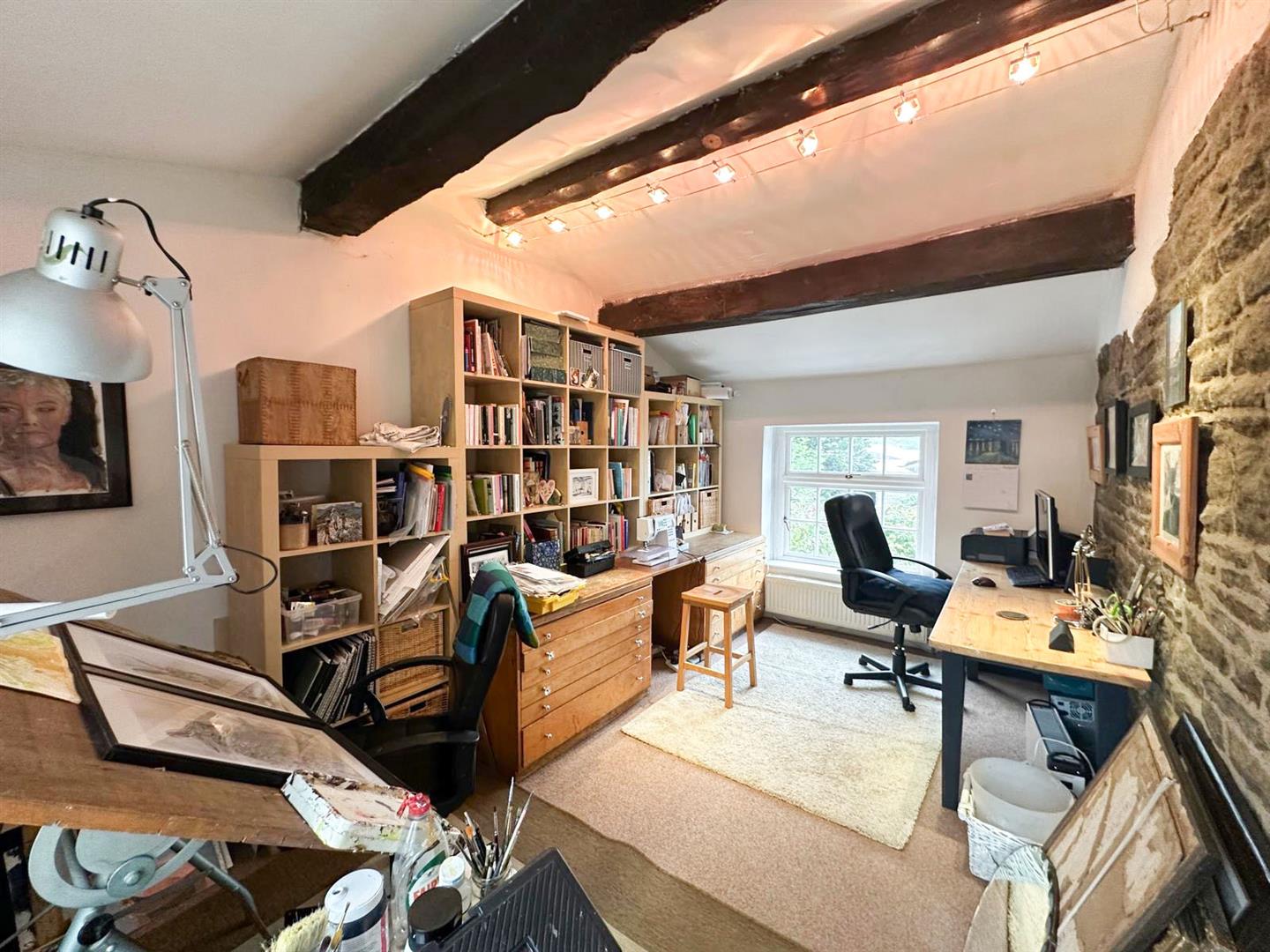 Upstairs, the landing is graced with a feature arched window, leading to three well-proportioned double bedrooms. The master bedroom is a beautiful retreat, with oak flooring, exposed beams, and twin windows framing far-reaching views over the farm to Farnhill Moor. It also enjoys a stylish en-suite shower room with thoughtful touches such as built-in shelving and a window seat. The second bedroom, also with beams and views from deep windowsills, has easy access to the smartly finished house bathroom, while the third double room—with dual-aspect windows, exposed stone and a beamed ceiling—is currently enjoyed as an office or hobby space. A spacious family bathroom completes the first floor, offering a bright and practical space with ample storage.