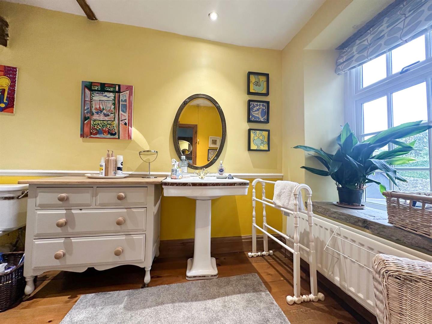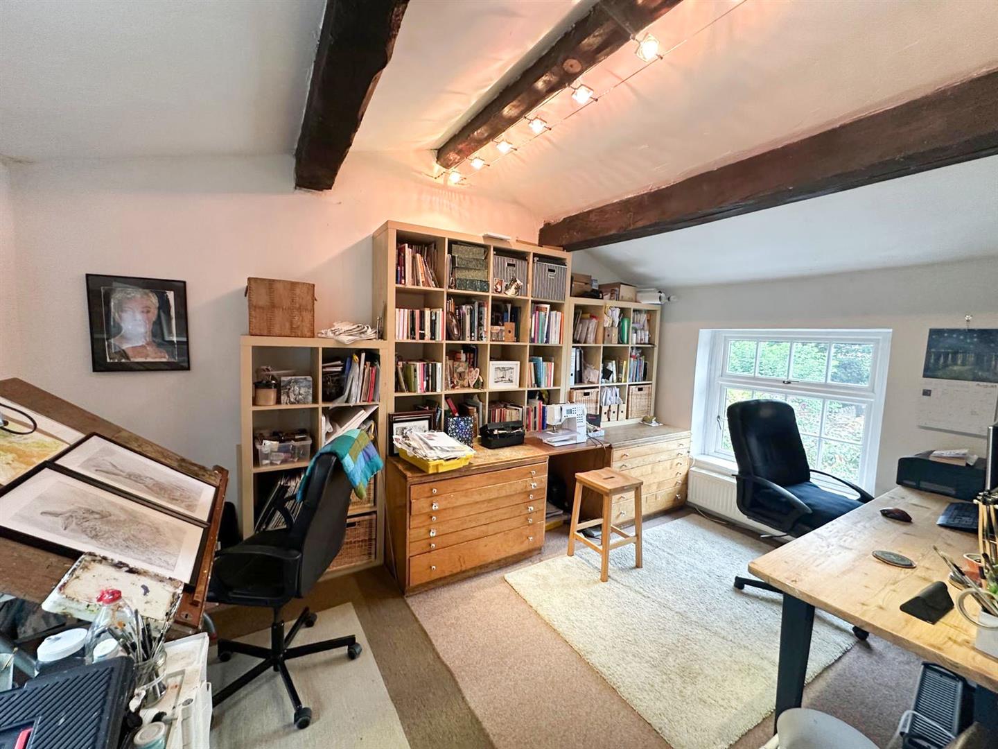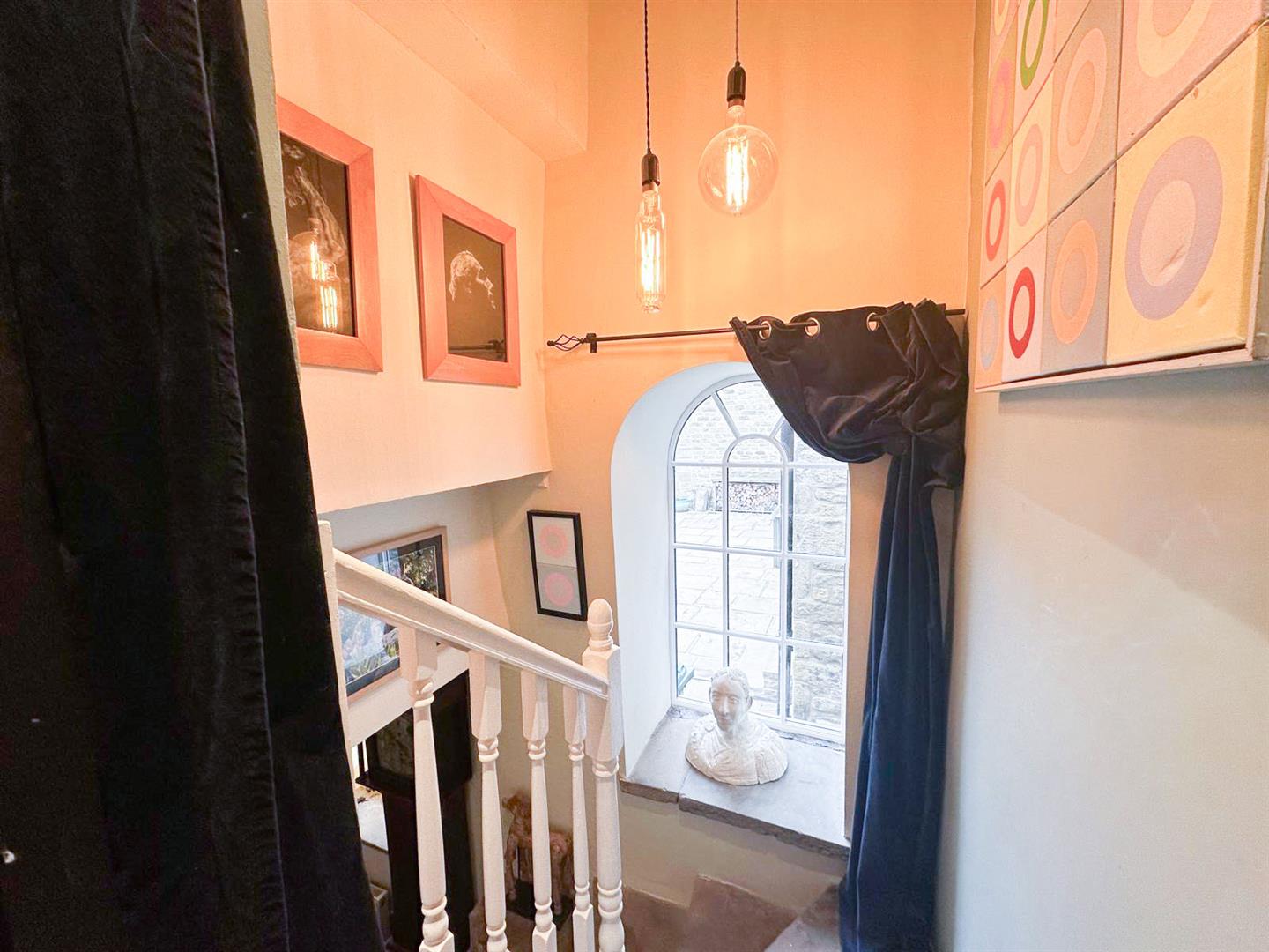 Upstairs, the landing is graced with a feature arched window, leading to three well-proportioned double bedrooms. The master bedroom is a beautiful retreat, with oak flooring, exposed beams, and twin windows framing far-reaching views over the farm to Farnhill Moor. It also enjoys a stylish en-suite shower room with thoughtful touches such as built-in shelving and a window seat. The second bedroom, also with beams and views from deep windowsills, has easy access to the smartly finished house bathroom, while the third double room—with dual-aspect windows, exposed stone and a beamed ceiling—is currently enjoyed as an office or hobby space. A spacious family bathroom completes the first floor, offering a bright and practical space with ample storage.