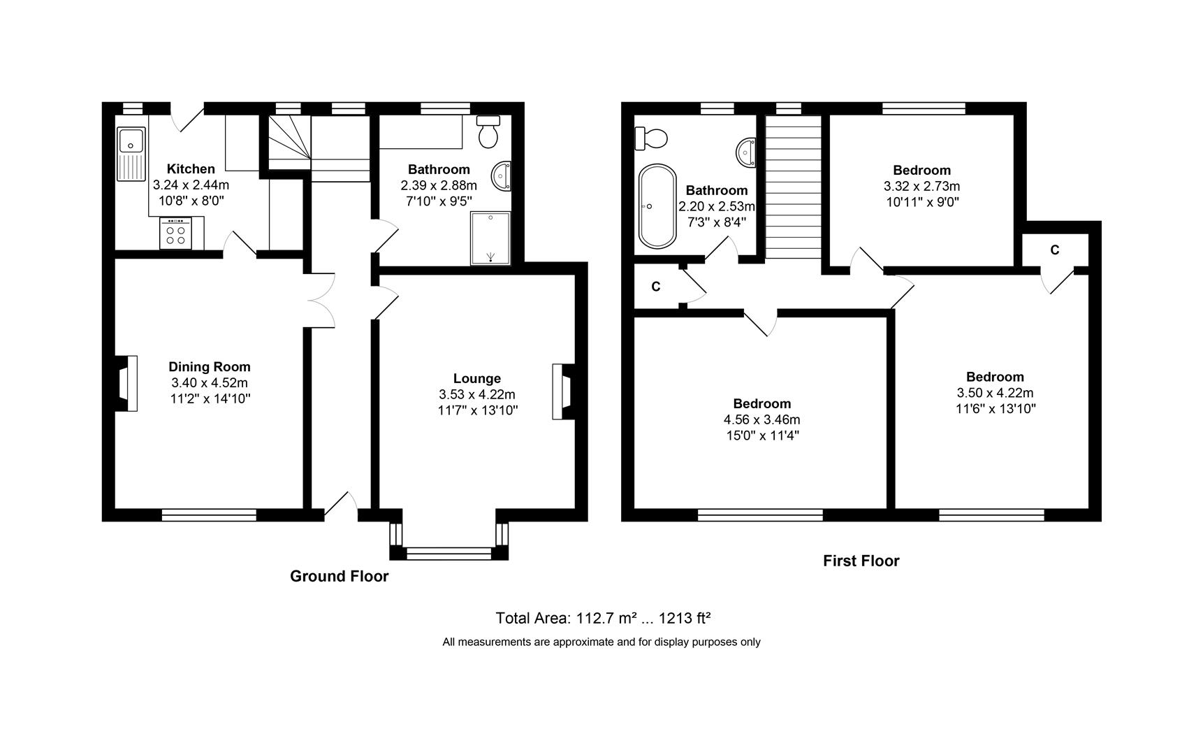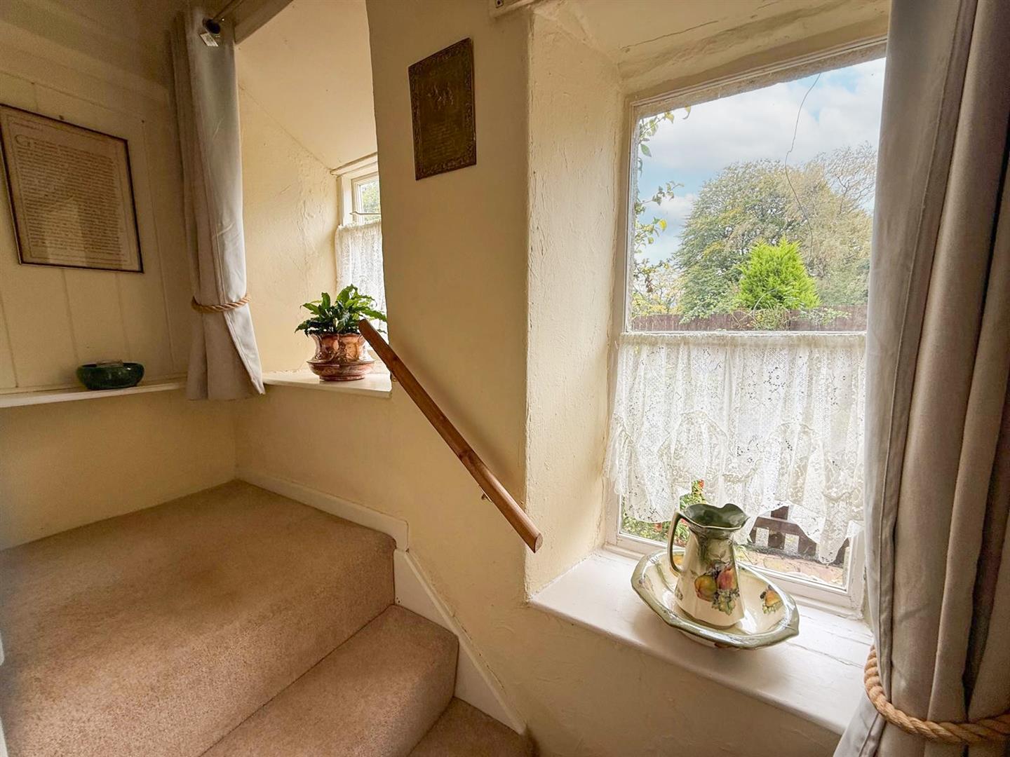 Stepping through the original front door, you enter a welcoming entrance hall featuring a graceful return staircase leading to the first floor and oak-effect flooring that continues into the main living areas. To the right, a charming sitting room awaits, complete with a square bay window, exposed ceiling beams, and an attractive fireplace with an open fire. Original double doors lead into the living/dining room, which also enjoys a front-facing aspect and boasts a stunning inglenook fireplace with a recessed multi-fuel stove. Beams to the ceiling, a built-in cupboard and shelving beside the fireplace, and a quaint window seat add character and warmth to the space.
