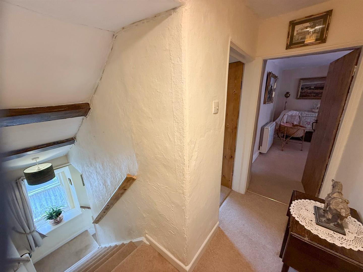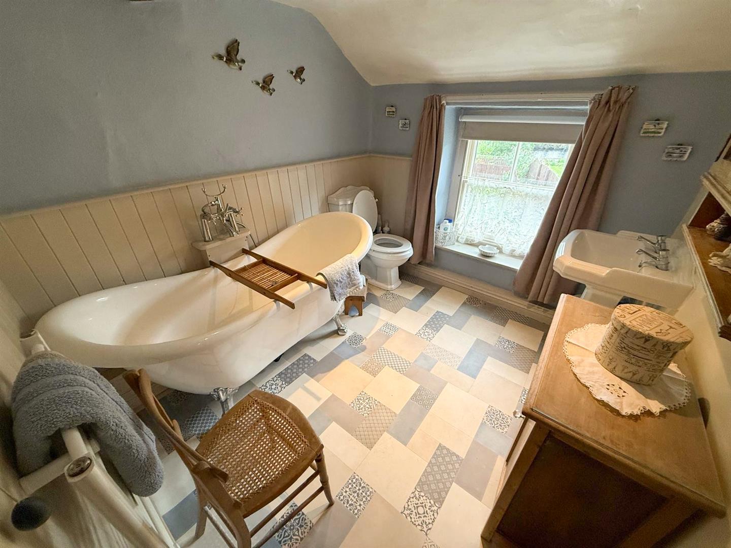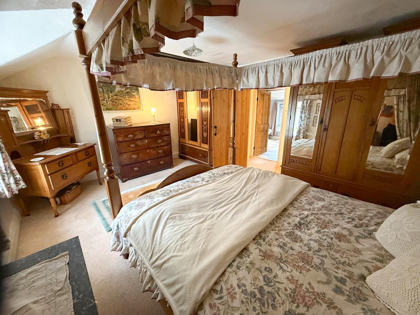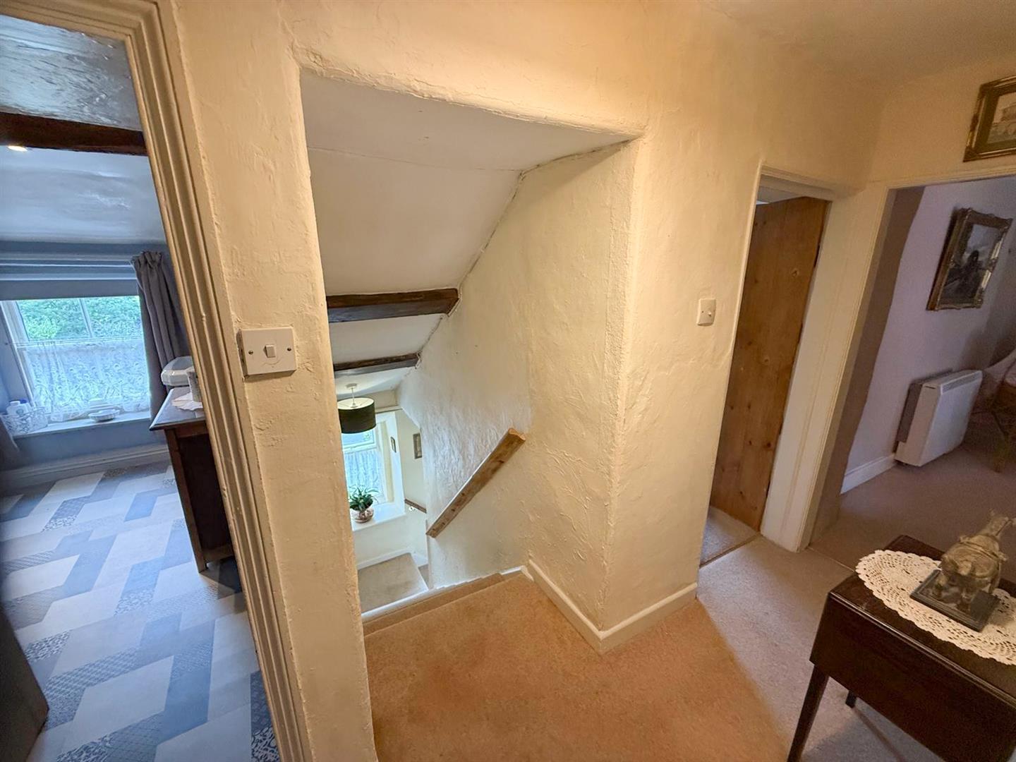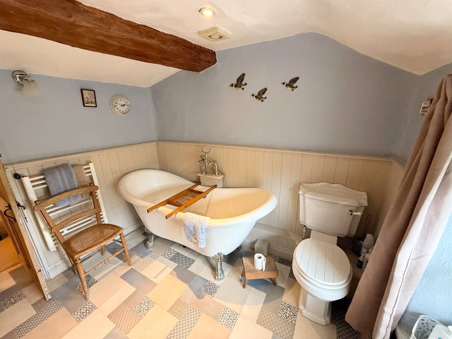 The first floor reveals a half-landing with a rear-facing window offering superb views over the garden and the river beyond. The landing provides access to a walk-in cupboard and three generously proportioned double bedrooms, all with original doors. One bedroom enjoys captivating river views, while the luxurious house bathroom features a freestanding bath, exposed beams, and more views of the river, creating a serene and relaxing space.