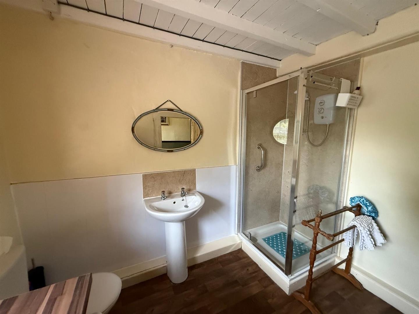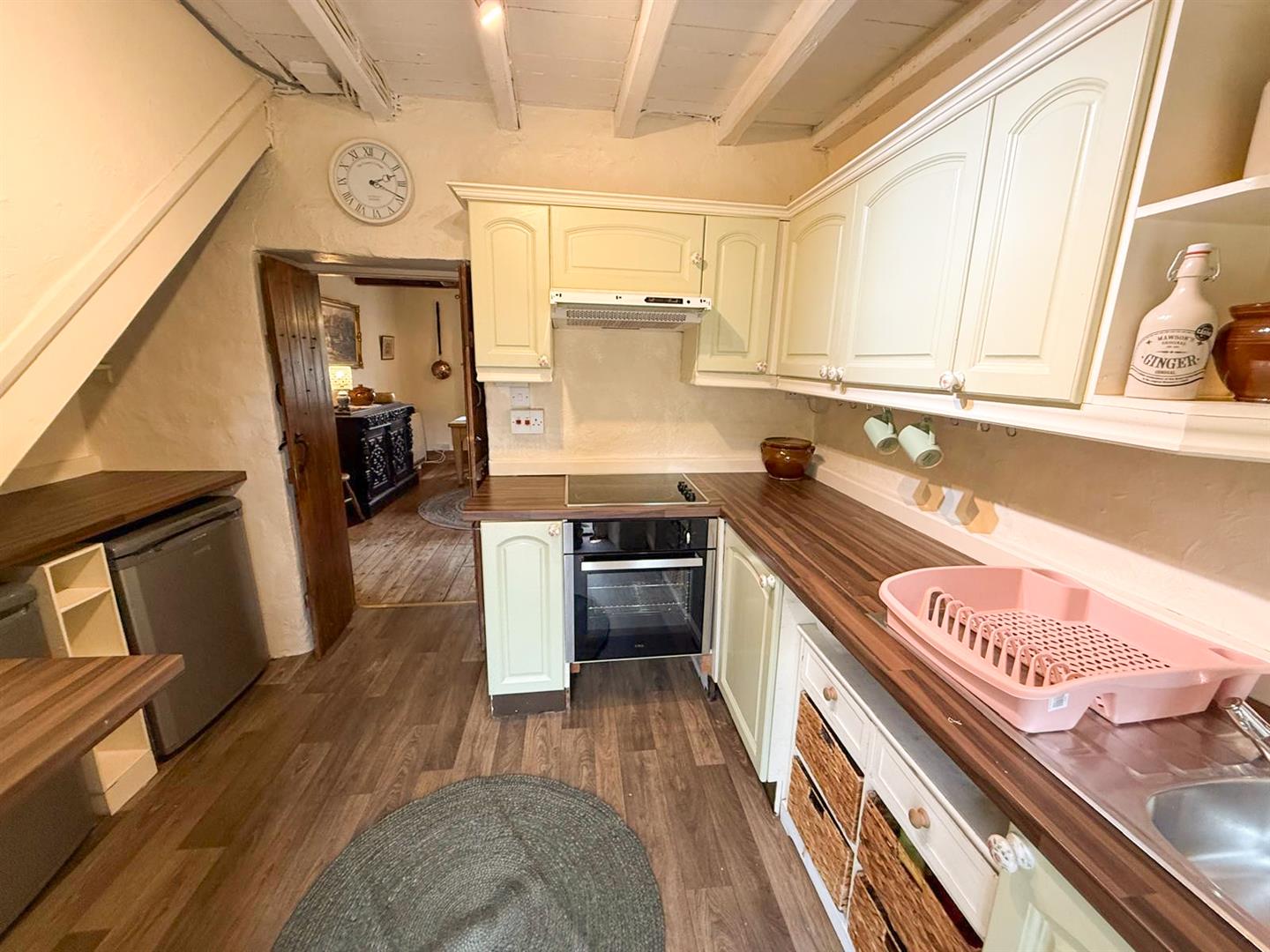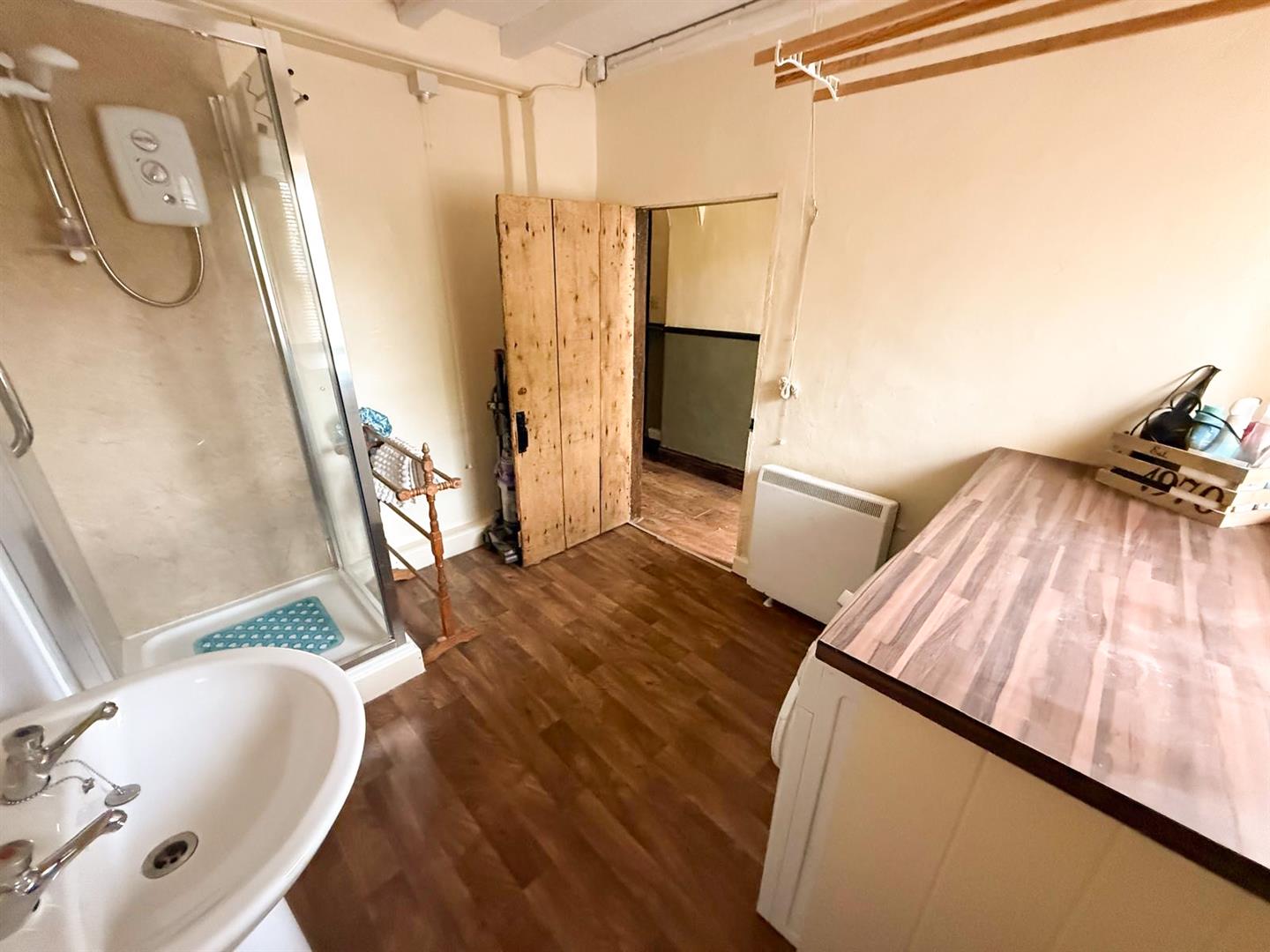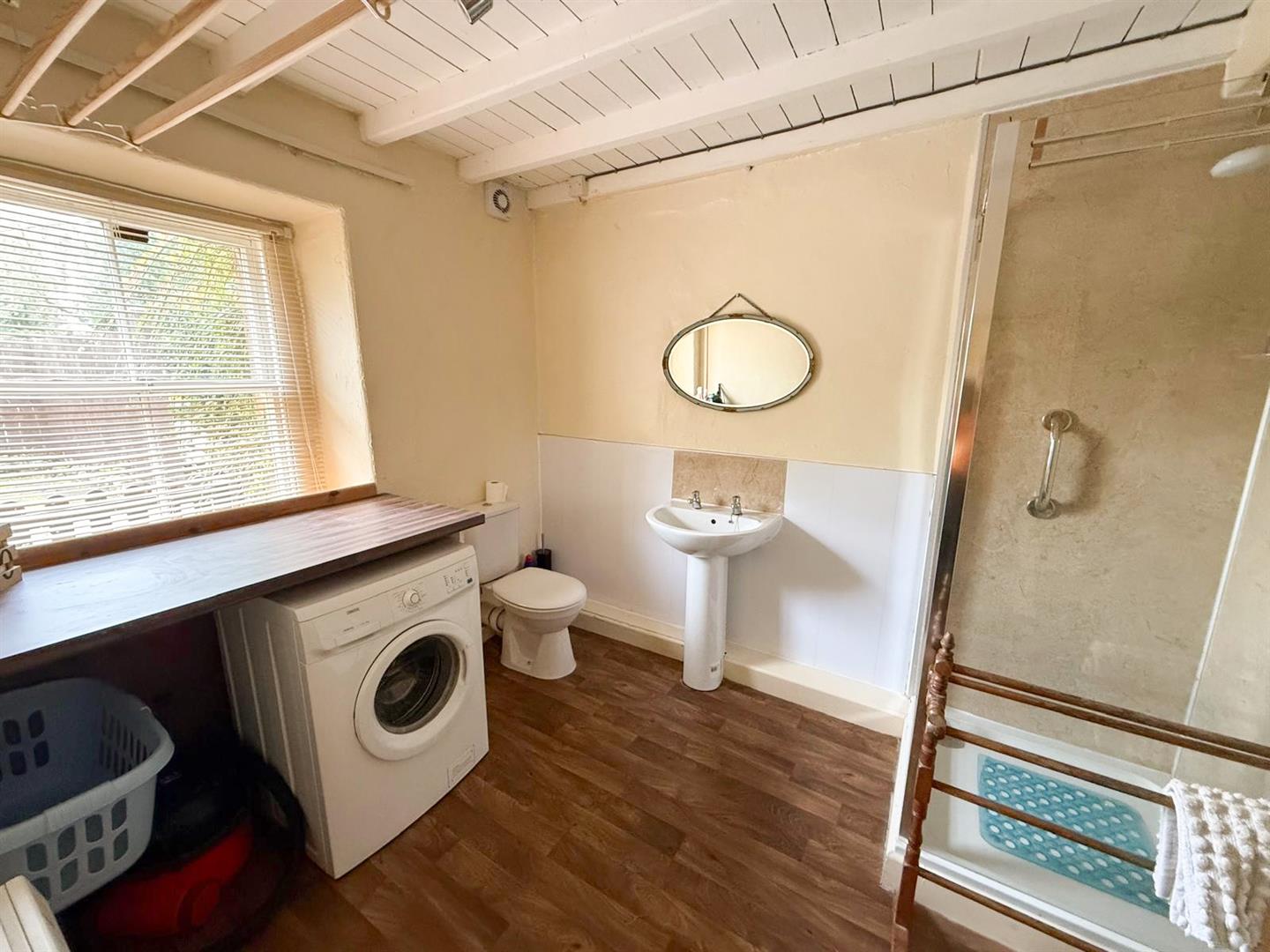 From here, original double doors open into a well-equipped kitchen with a rear-facing window overlooking the garden, complemented by wood-effect flooring. A practical shower room with utility space, also featuring beams and wood-effect flooring, completes the ground floor accommodation.