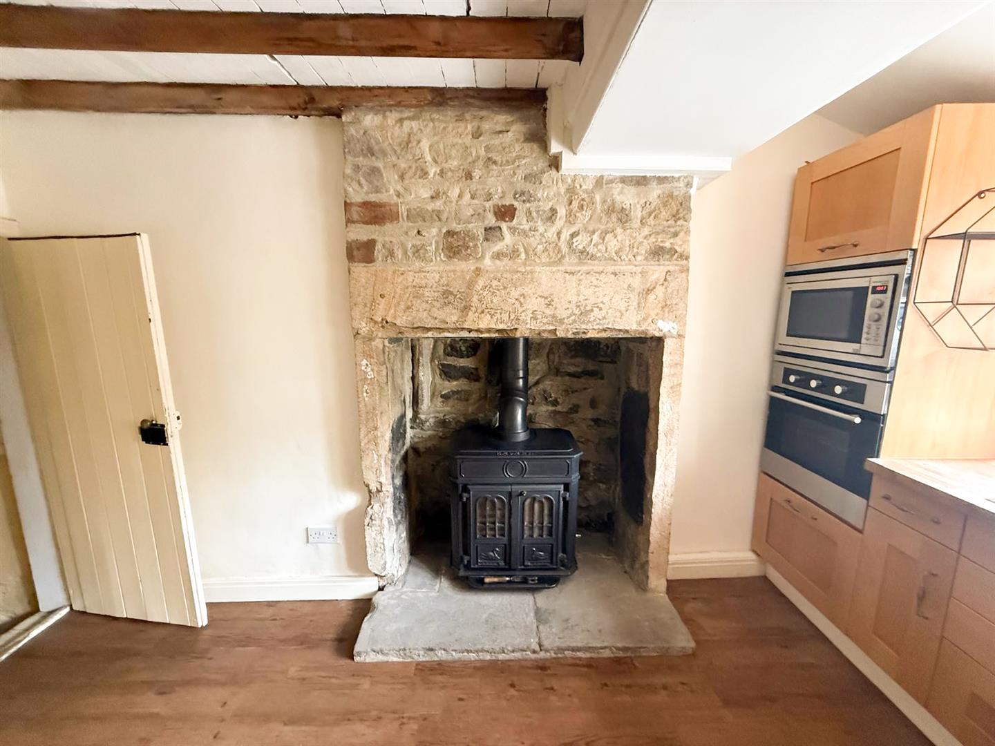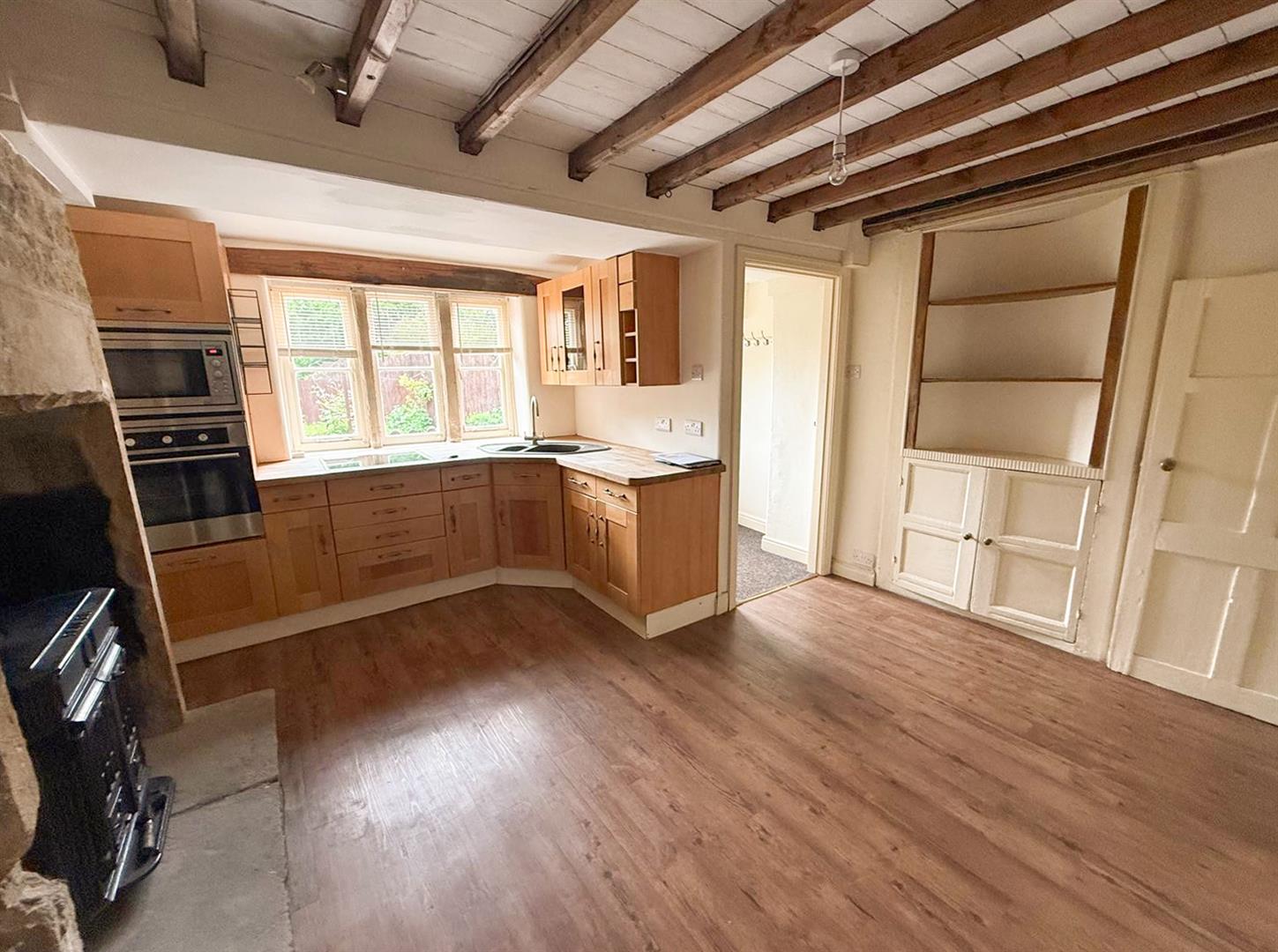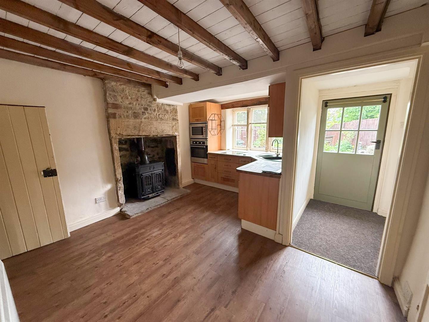 An inner hallway with an enclosed staircase leads you to the first floor. To the rear of the home, the dining kitchen is a charming and functional space, fitted with a generous range of cabinetry and complemented by an impressive inglenook fireplace housing a multi-fuel stove. Original built-in cupboards, a mullioned window overlooking the garden, and ceiling beams add further character to this inviting room. From here, there is access to the basement level. The rear vestibule leads out to the garden.