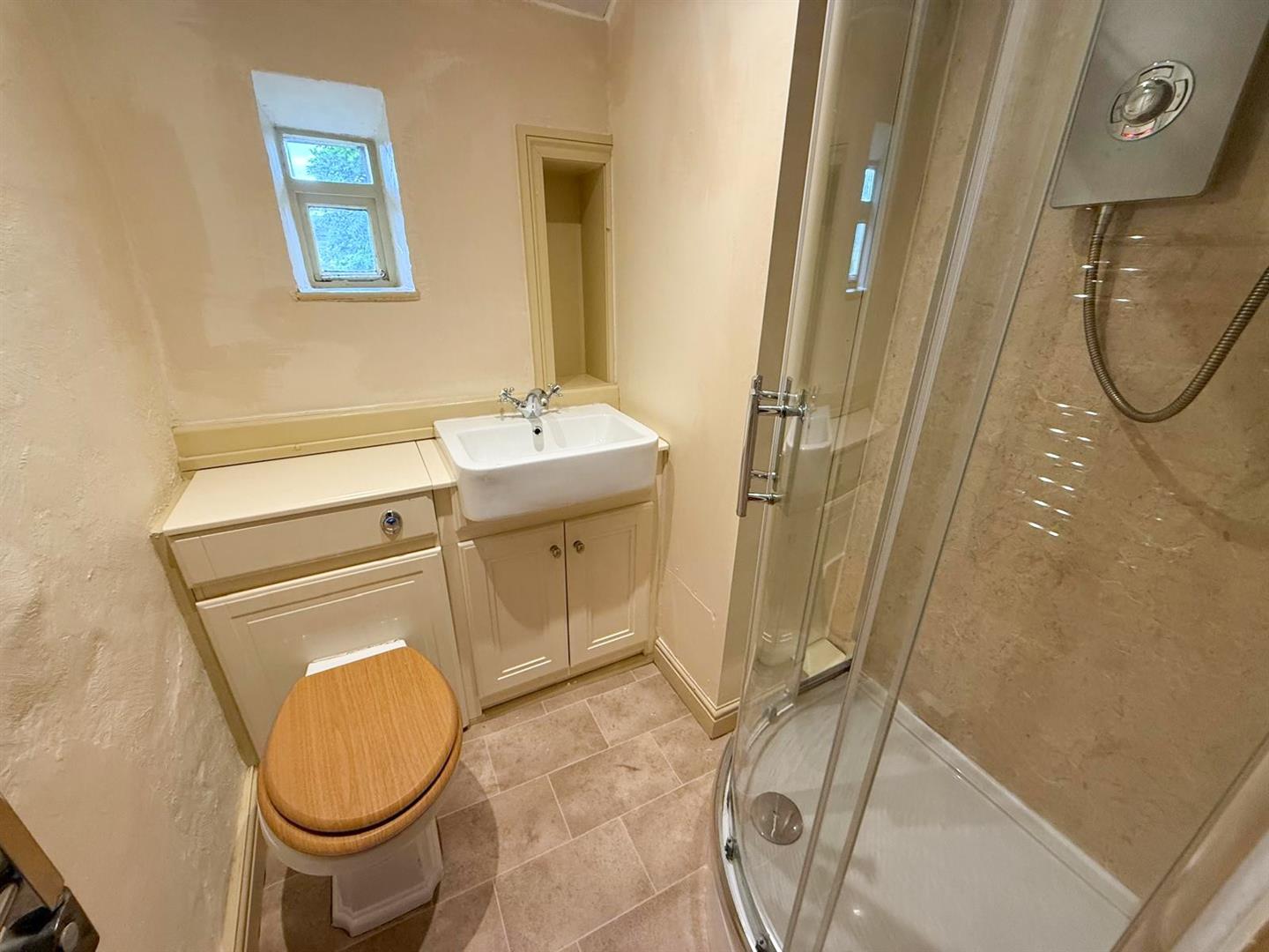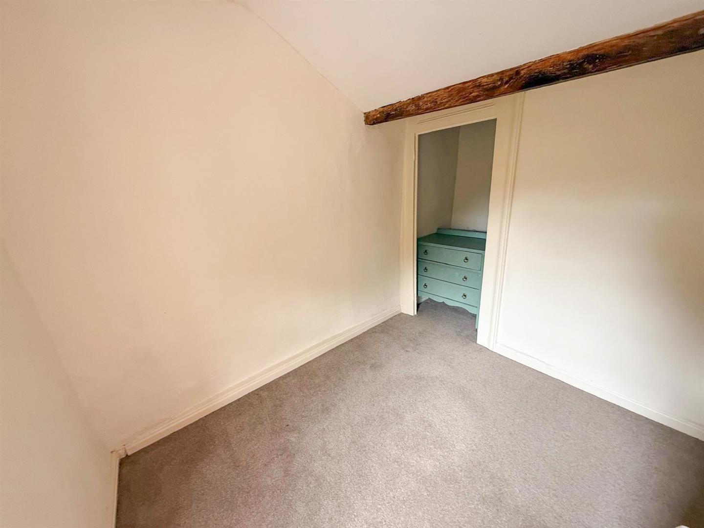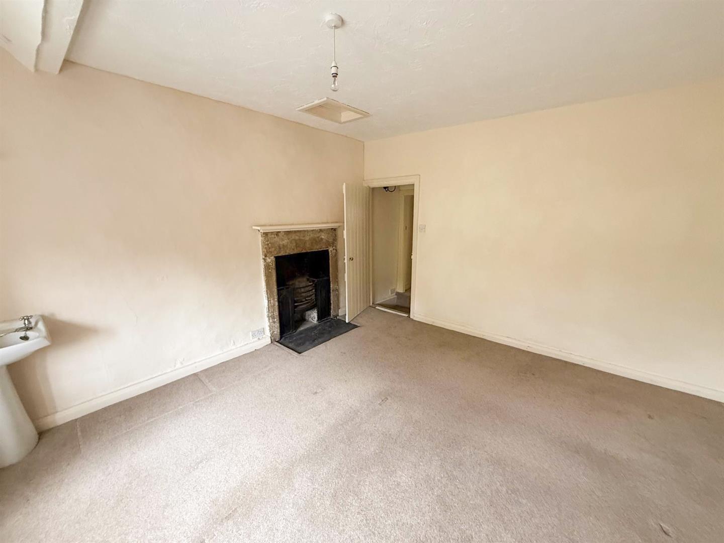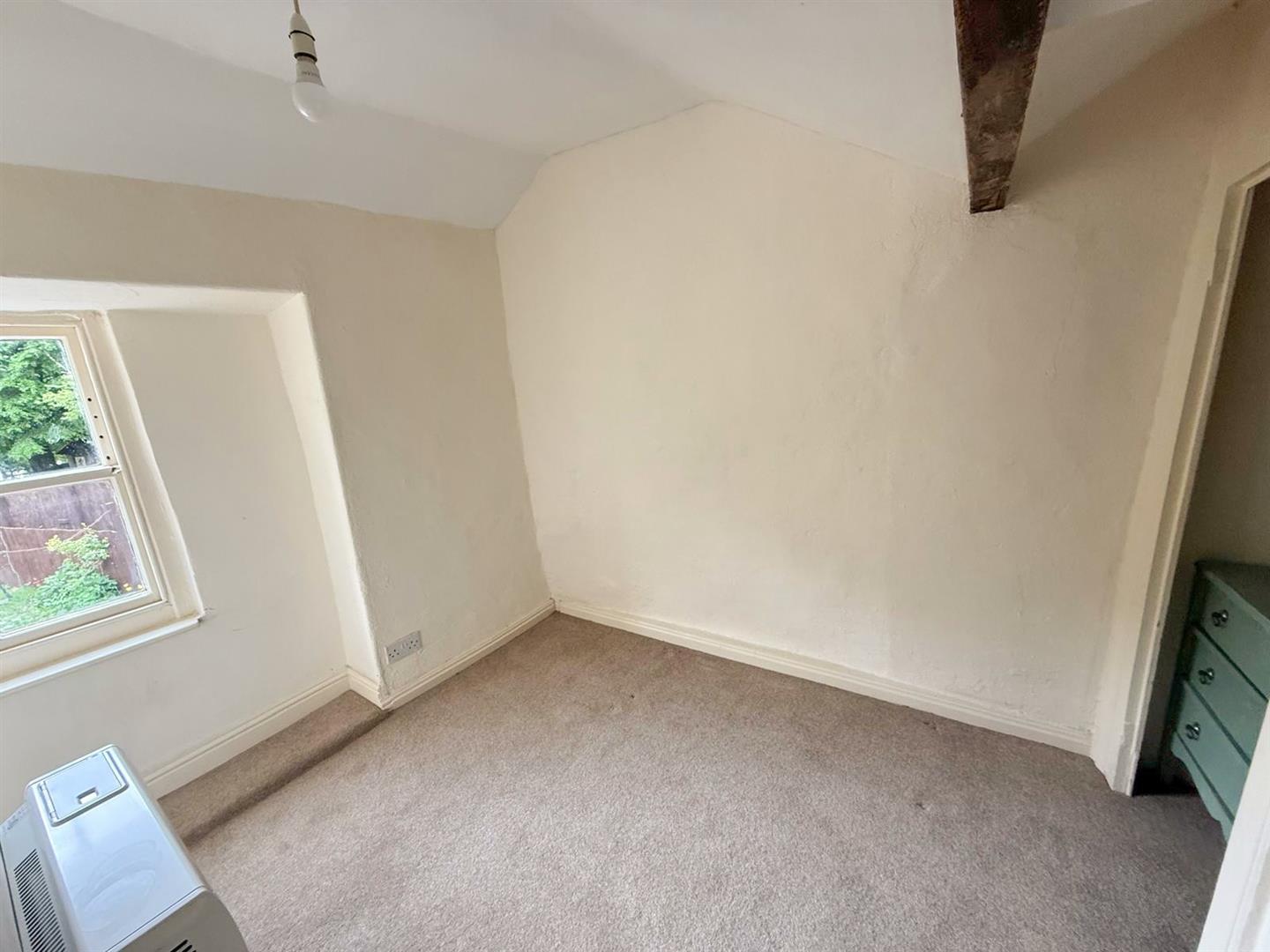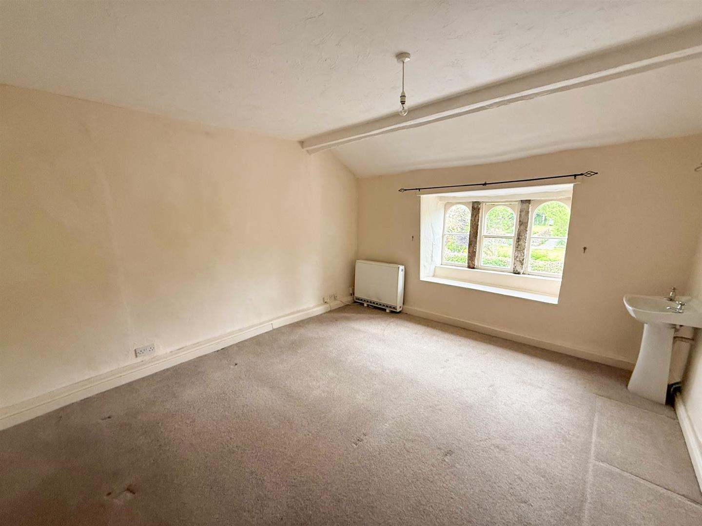 Upstairs, the split-level landing leads to two comfortable bedrooms. The master bedroom is particularly special, showcasing an original cast iron fireplace and distinctive arched mullion windows that frame captivating views of the village. The second bedroom is also generously proportioned and features built-in wardrobes along with stunning views over the rear garden and towards the gently flowing river beyond. A modern three-piece shower room completes the first-floor accommodation.