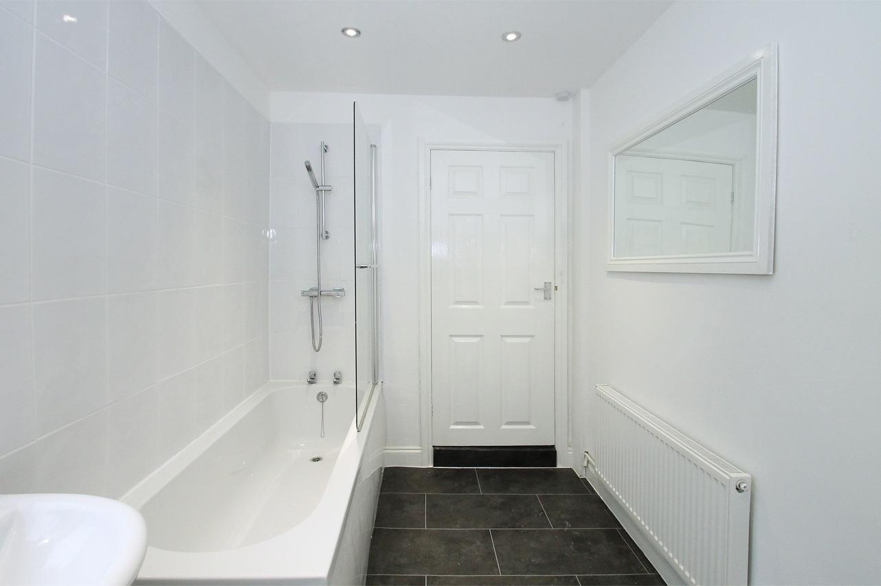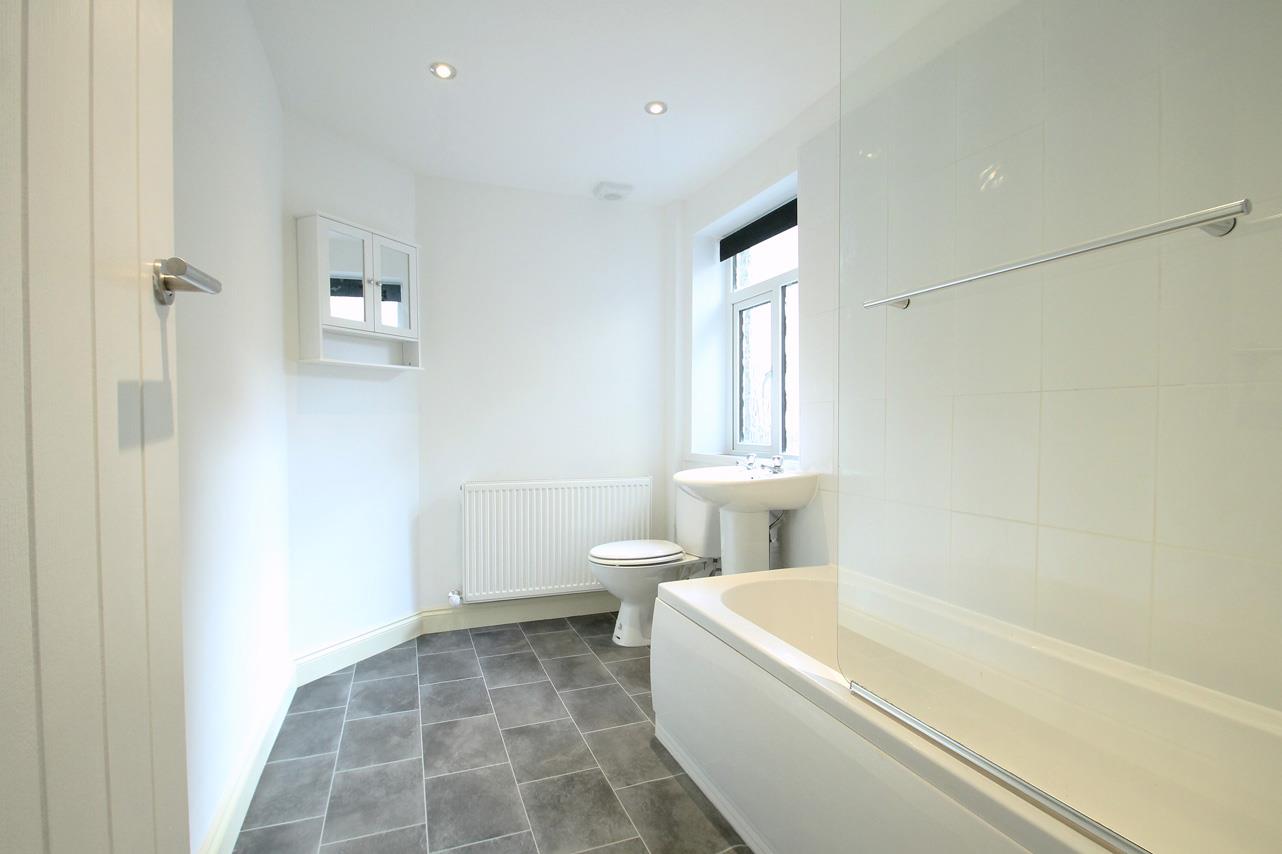 With three piece suite comprising; panelled bath with shower over with glazed screen, pedestal wash basin and low suite W.C., part tiled walls, extractor fan, linen cupboard and pull light switch.