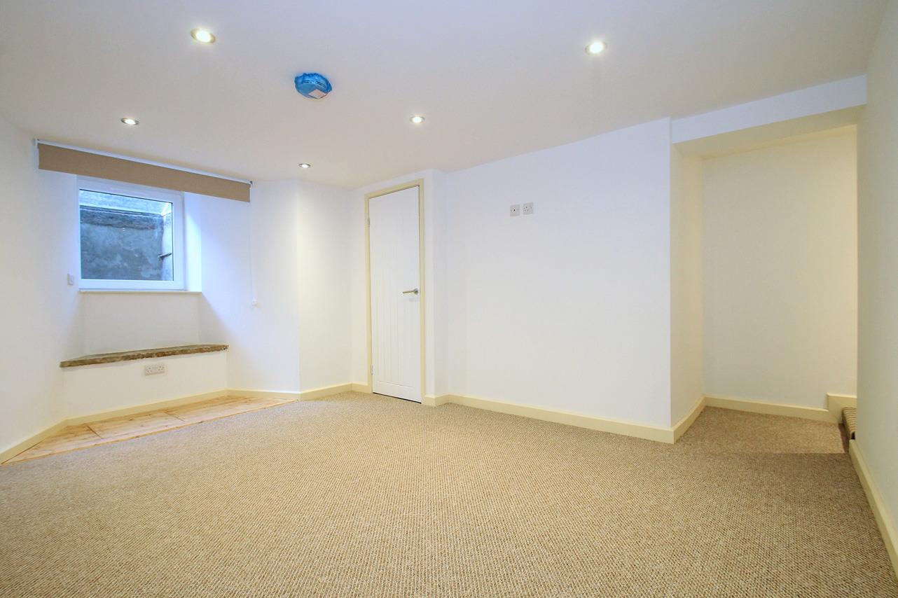 with window to the front elevation, carpet flooring and large walk in storage room.