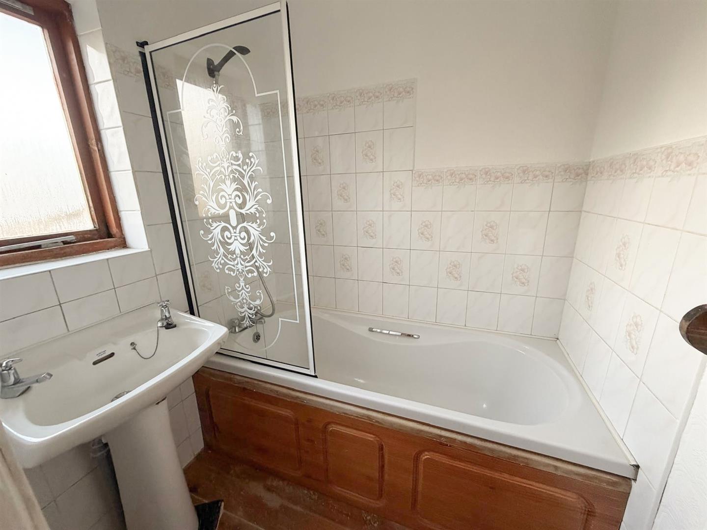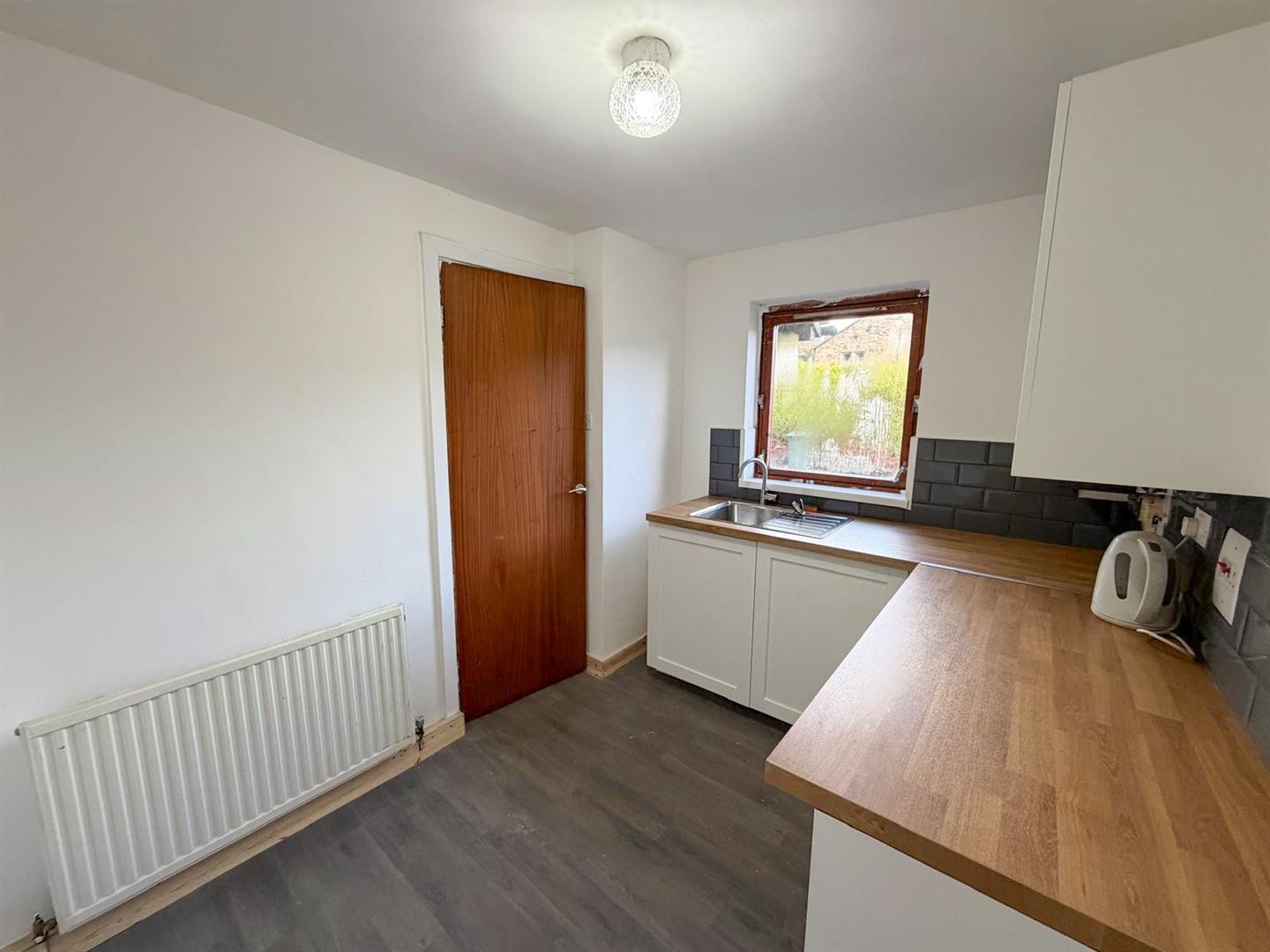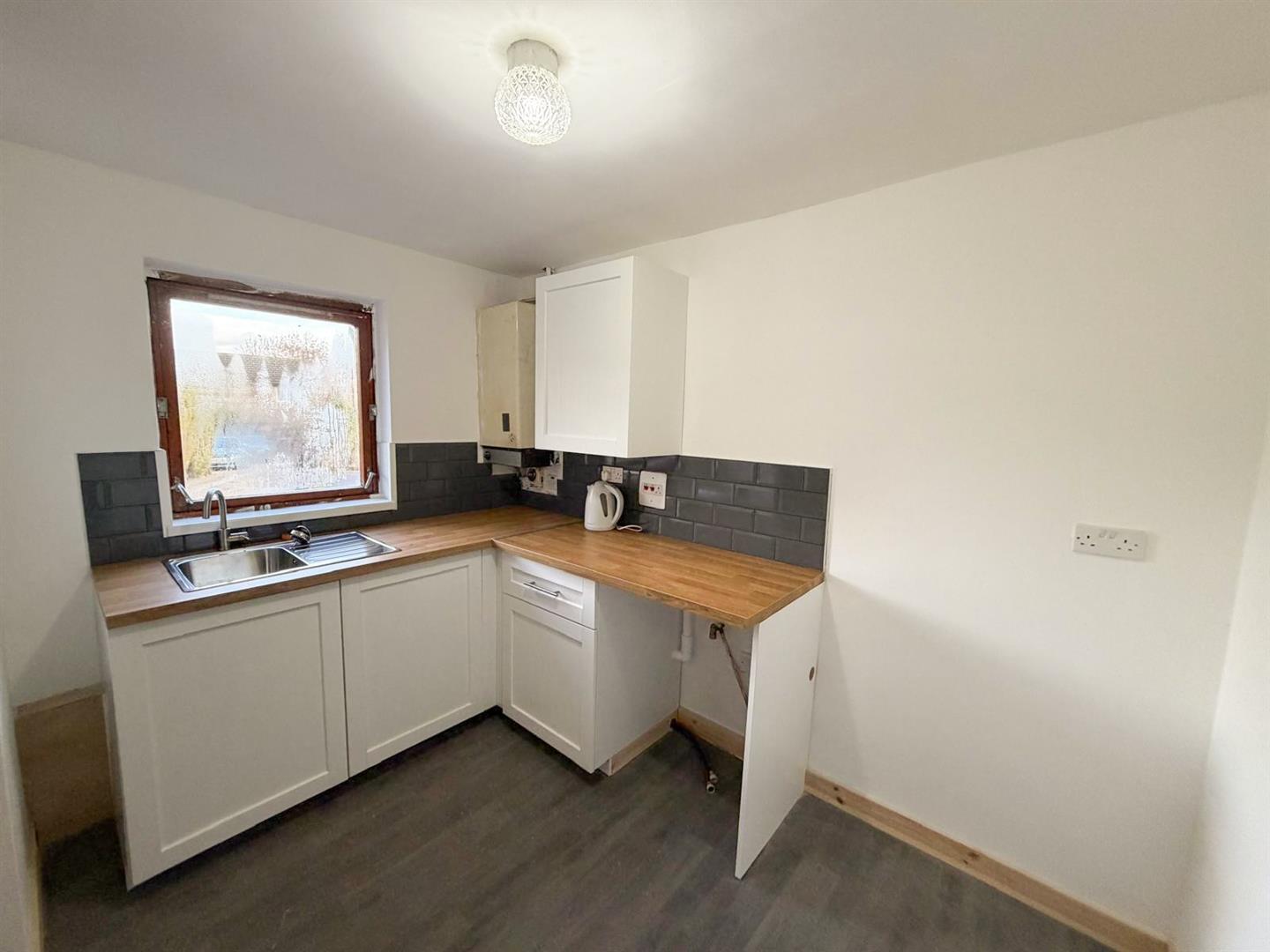 The property opens with a covered entrance and handy bin store before leading into a hallway with open staircase, generous sitting room, filled with natural light and opening directly onto the rear garden. The newly fitted kitchen adds a contemporary touch, featuring a sleek stainless-steel sink and attractive cupboards in white with laminated beech-block worktops. Upstairs, two well-proportioned double bedrooms are complemented by a house bathroom and separate W.C. The rear garden is fully paved for easy, low-maintenance outdoor living.