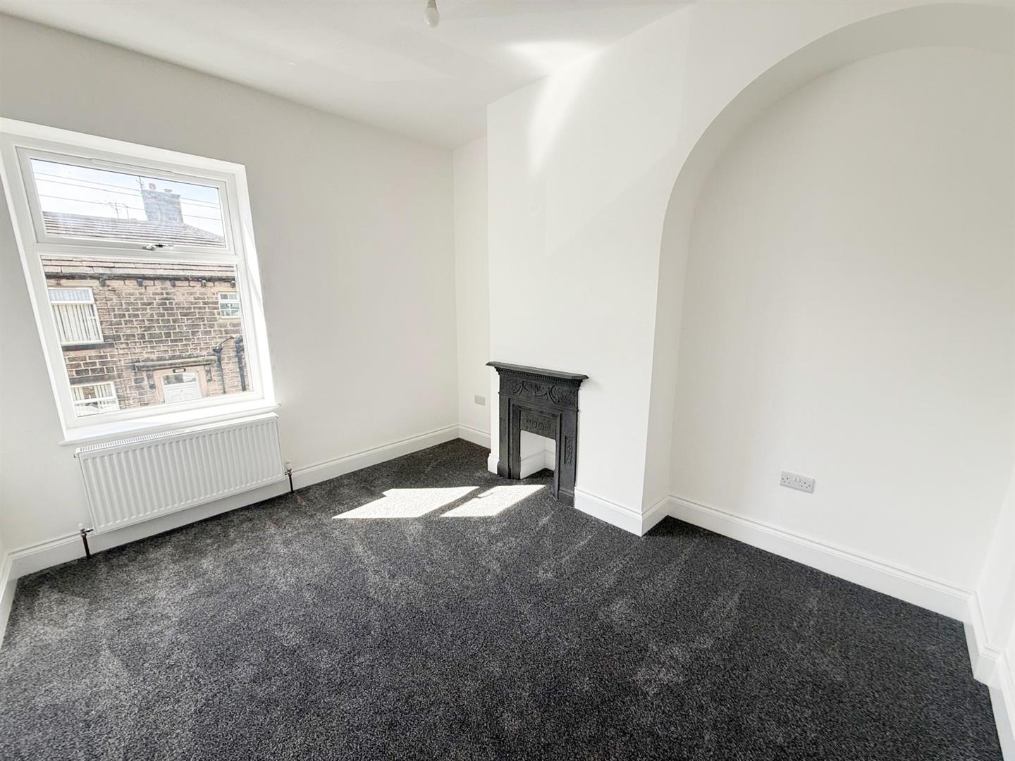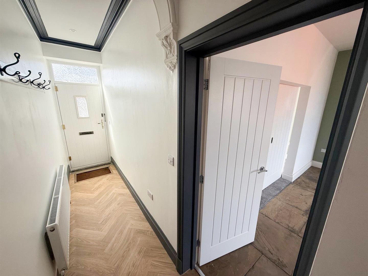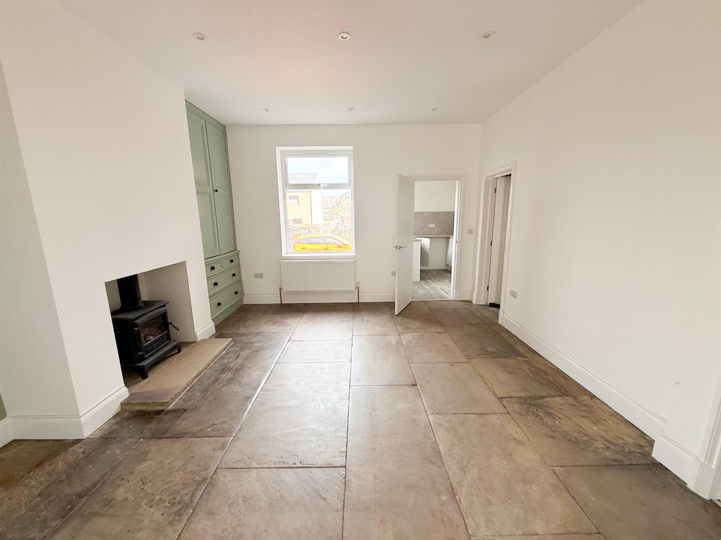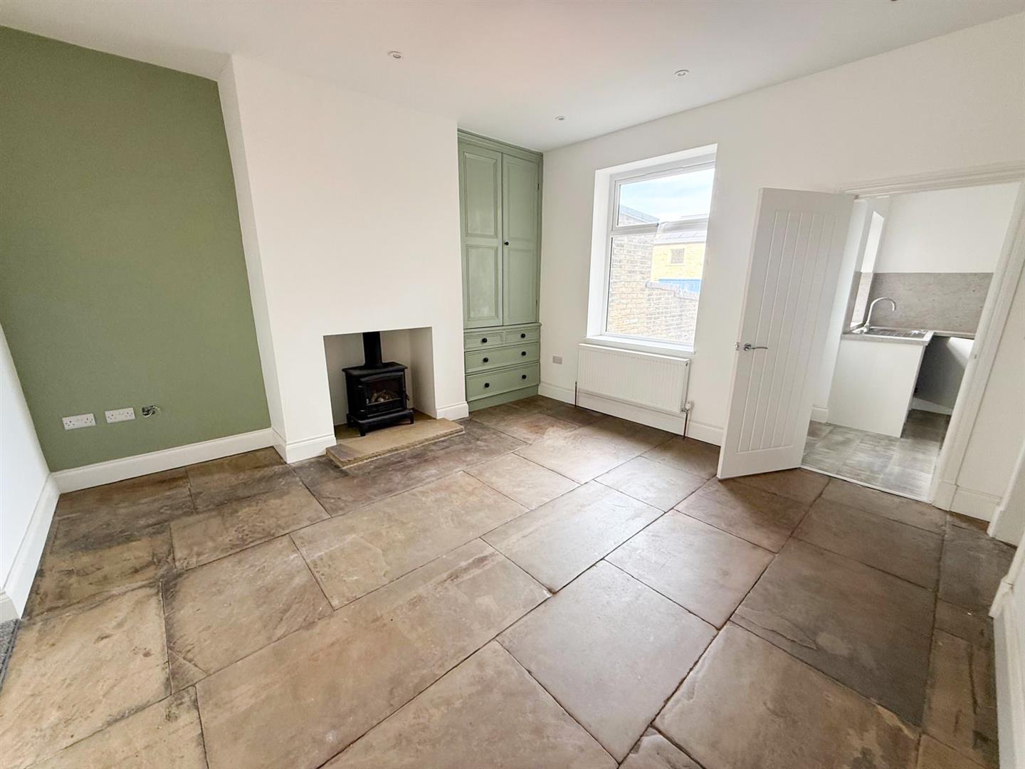 Stepping inside, you are greeted by a spacious entrance hall rich in original features, including elegant cornicing and an ornate archway that immediately set the tone for the rest of the home. To the front, the cosy sitting room is bathed in natural light from a large picture window and retains its original coving, creating a warm and inviting retreat. Sliding double doors lead seamlessly into the main living and dining room—an ideal space for entertaining or family gatherings. Here, a striking fireplace with a gas stove forms a central focal point, complemented by original built-in drawers and cupboards, as well as beautifully preserved Yorkshire stone flagged flooring.