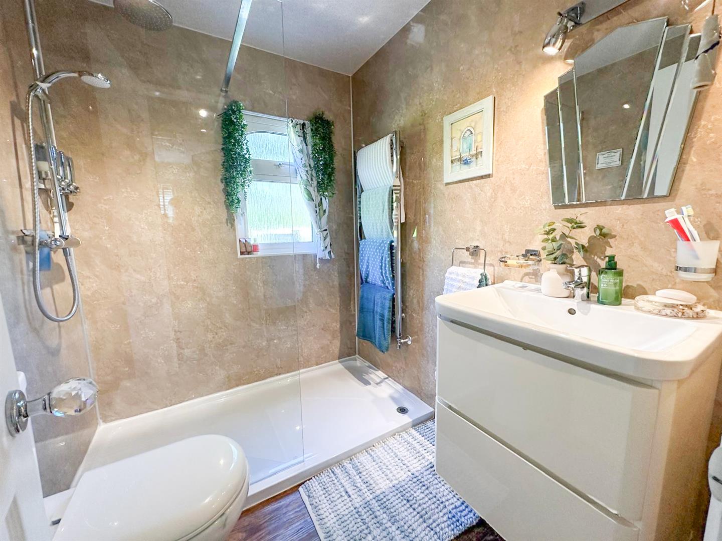 With three-piece suite with a spacious walk-in shower featuring rainfall and handheld fittings, a stylish white gloss vanity unit with sink, low suite W.C, and a heated chrome towel rail.