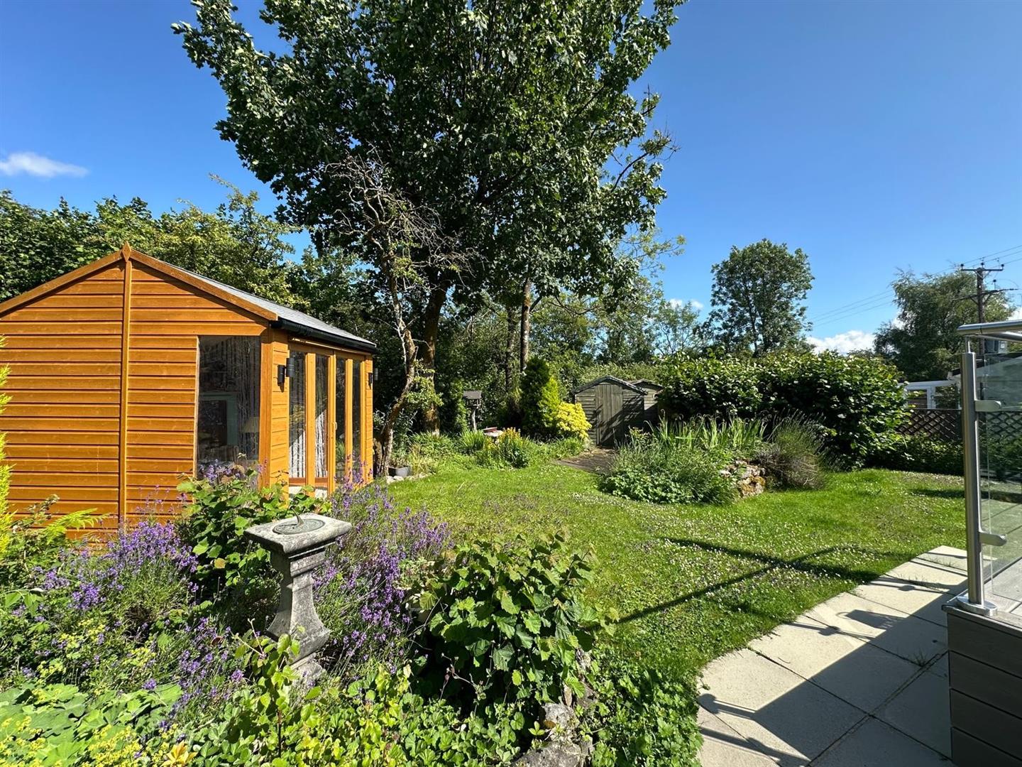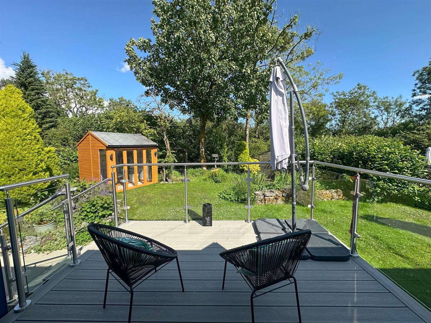 At the front of the property is a low-maintenance garden, while the rear boasts a beautifully landscaped garden backing onto woodland. A contemporary balcony, featuring Trex decking and a glazed balustrade, includes both steps and a lift for disabled access, with double doors opening into the dining room. The outdoor space also includes a stunning summer house with electricity and bi-fold doors, a timber shed, and a spacious, practical composite shed. Private parking is available, along with additional visitor parking.