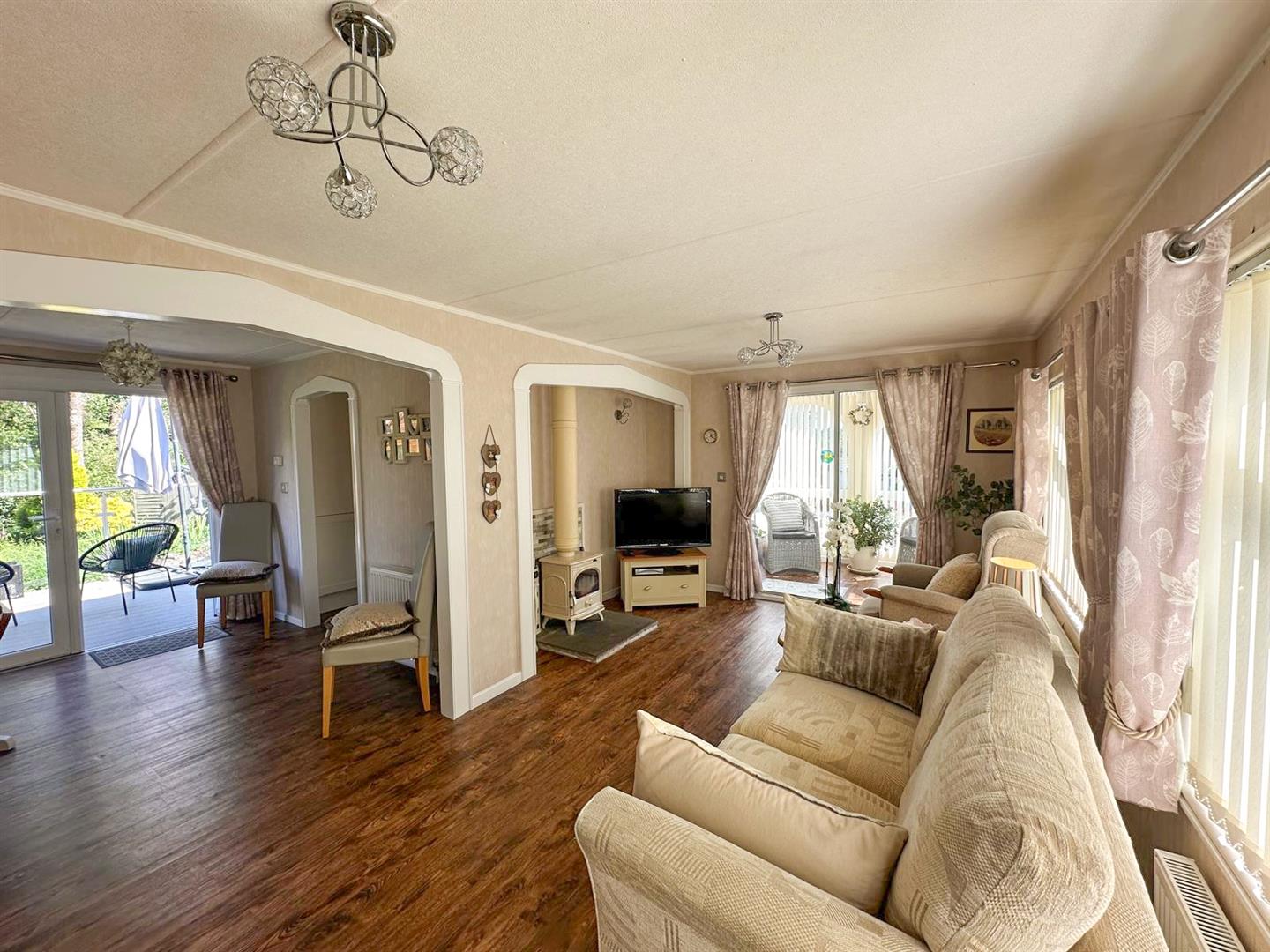 A generous, light-filled room featuring a top-of-the-range recessed cream wood-burning stove set on a stone hearth. Two ceiling lights, wall lights, and patio doors create a warm and inviting atmosphere.