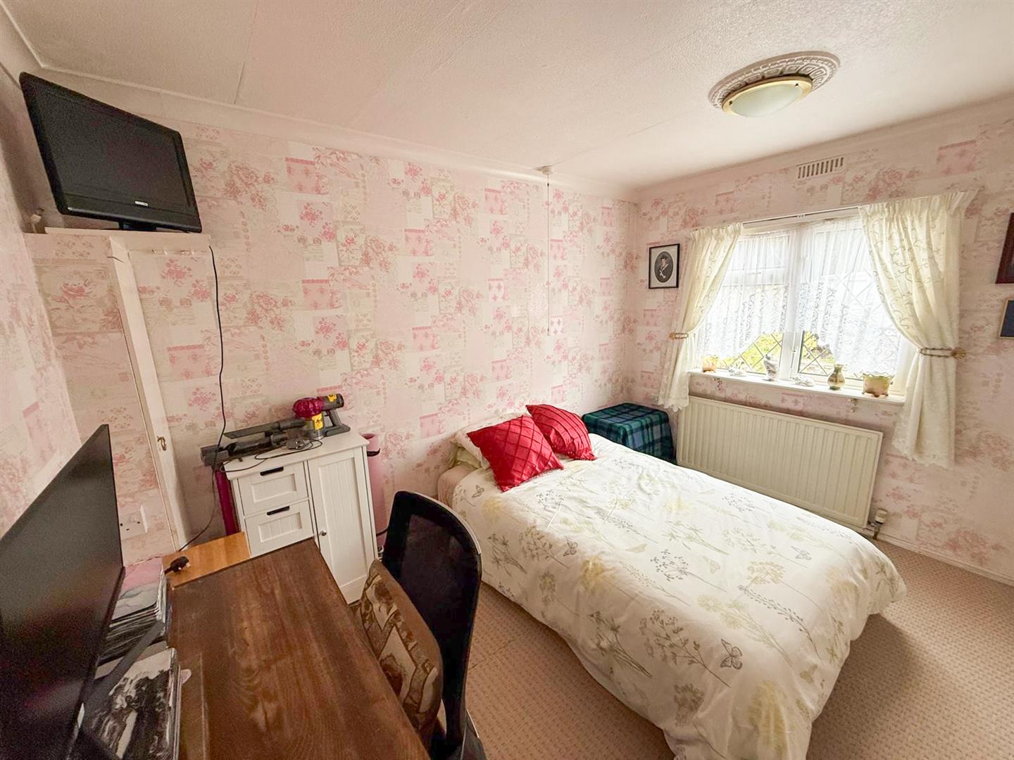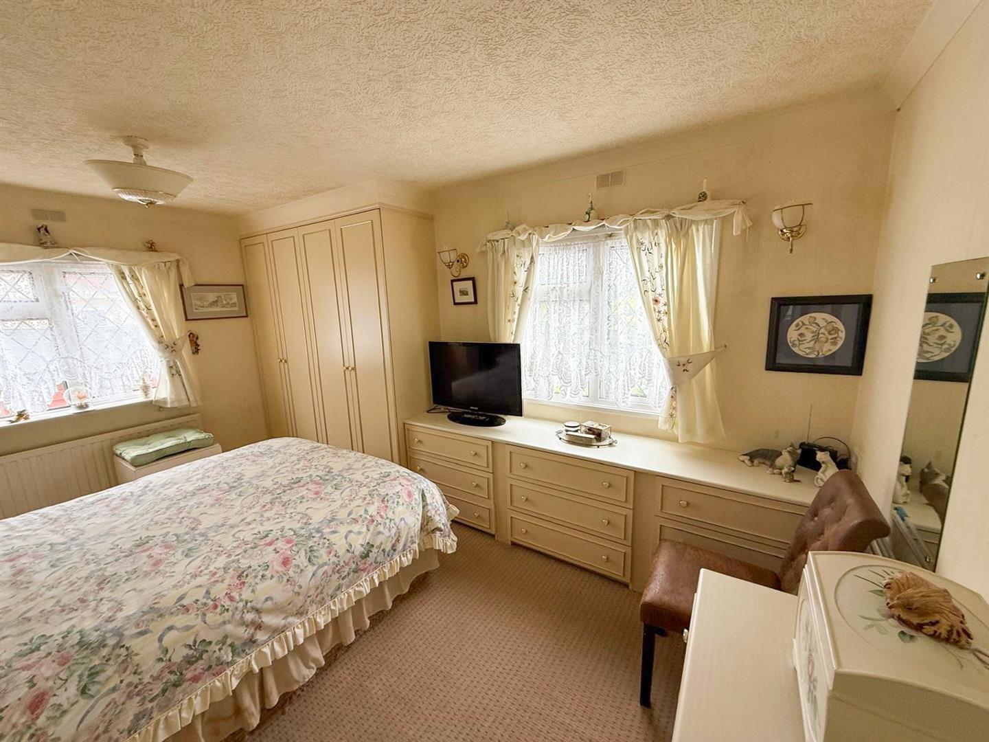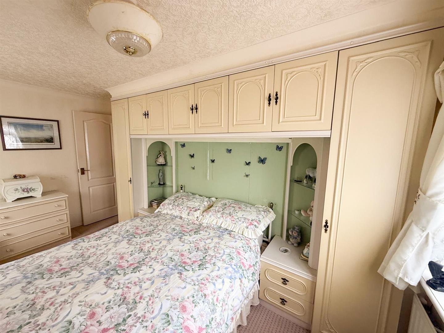 An inner hallway leads to two comfortable double bedrooms, both with built-in furniture offering excellent storage. A spacious shower room completes the interior layout. Outside, you’ll find garden areas on three sides—ideal for enjoying the outdoors in privacy—as well as convenient on-site parking.