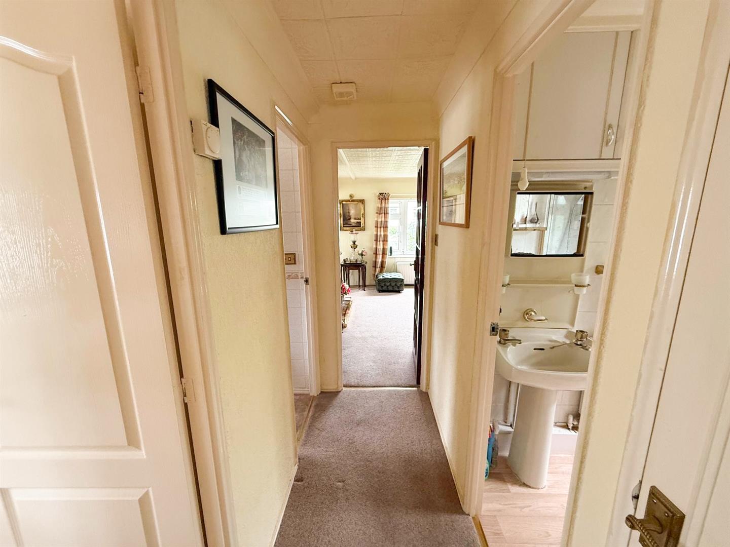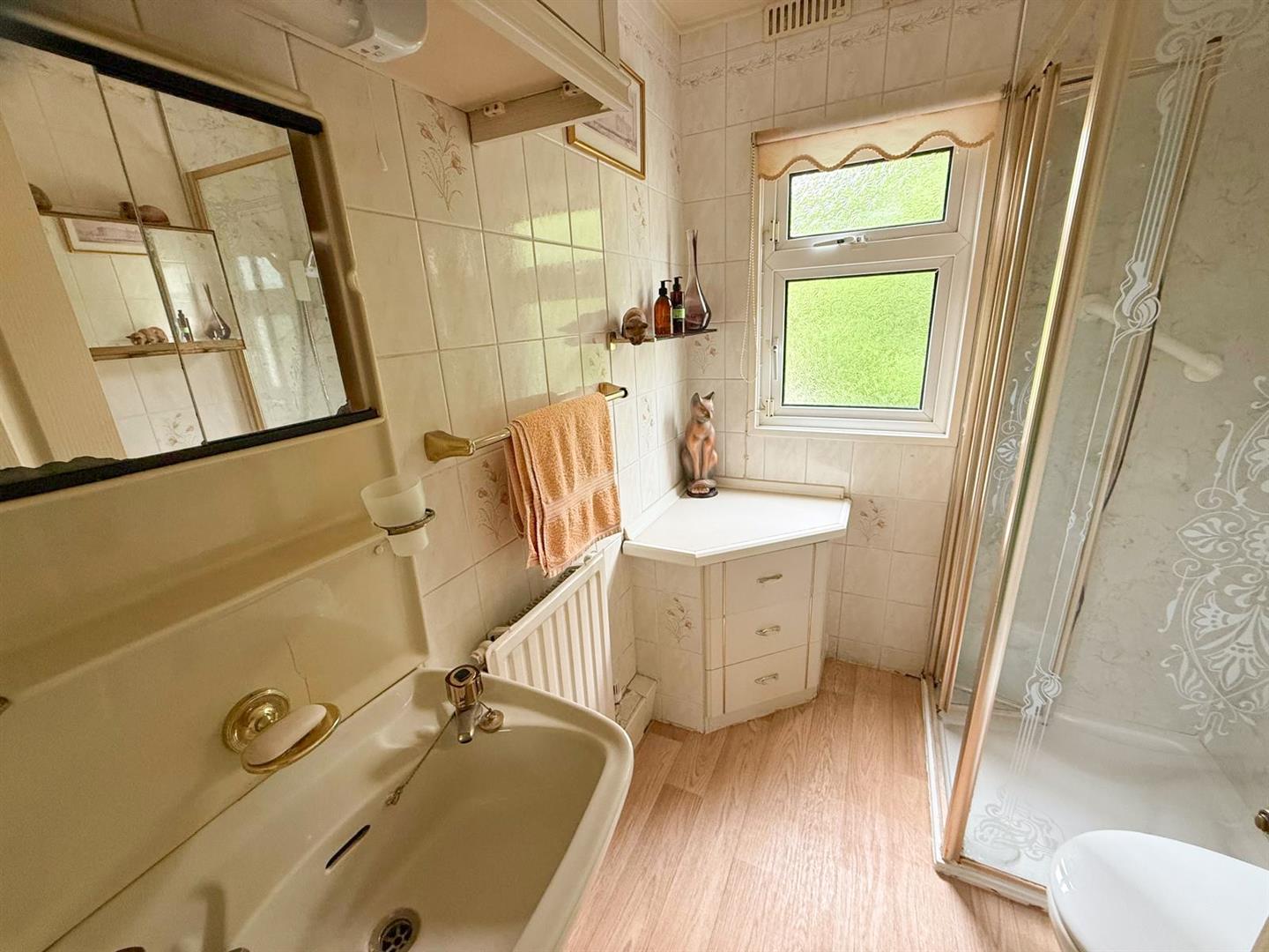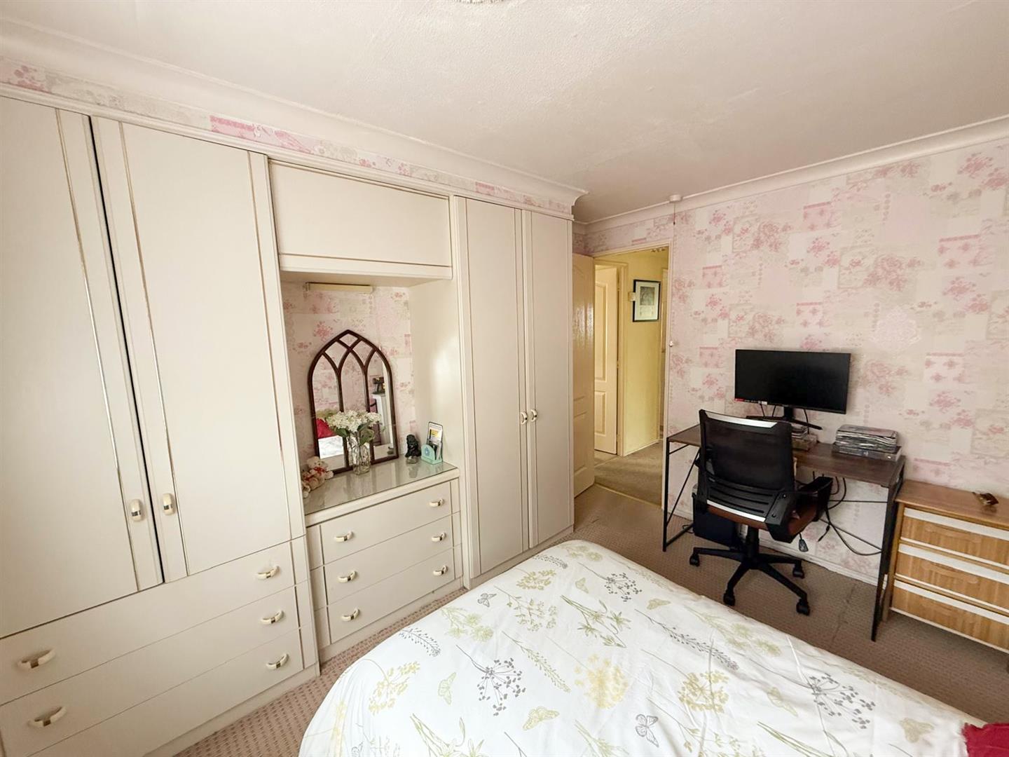 An inner hallway leads to two comfortable double bedrooms, both with built-in furniture offering excellent storage. A spacious shower room completes the interior layout. Outside, you’ll find garden areas on three sides—ideal for enjoying the outdoors in privacy—as well as convenient on-site parking.