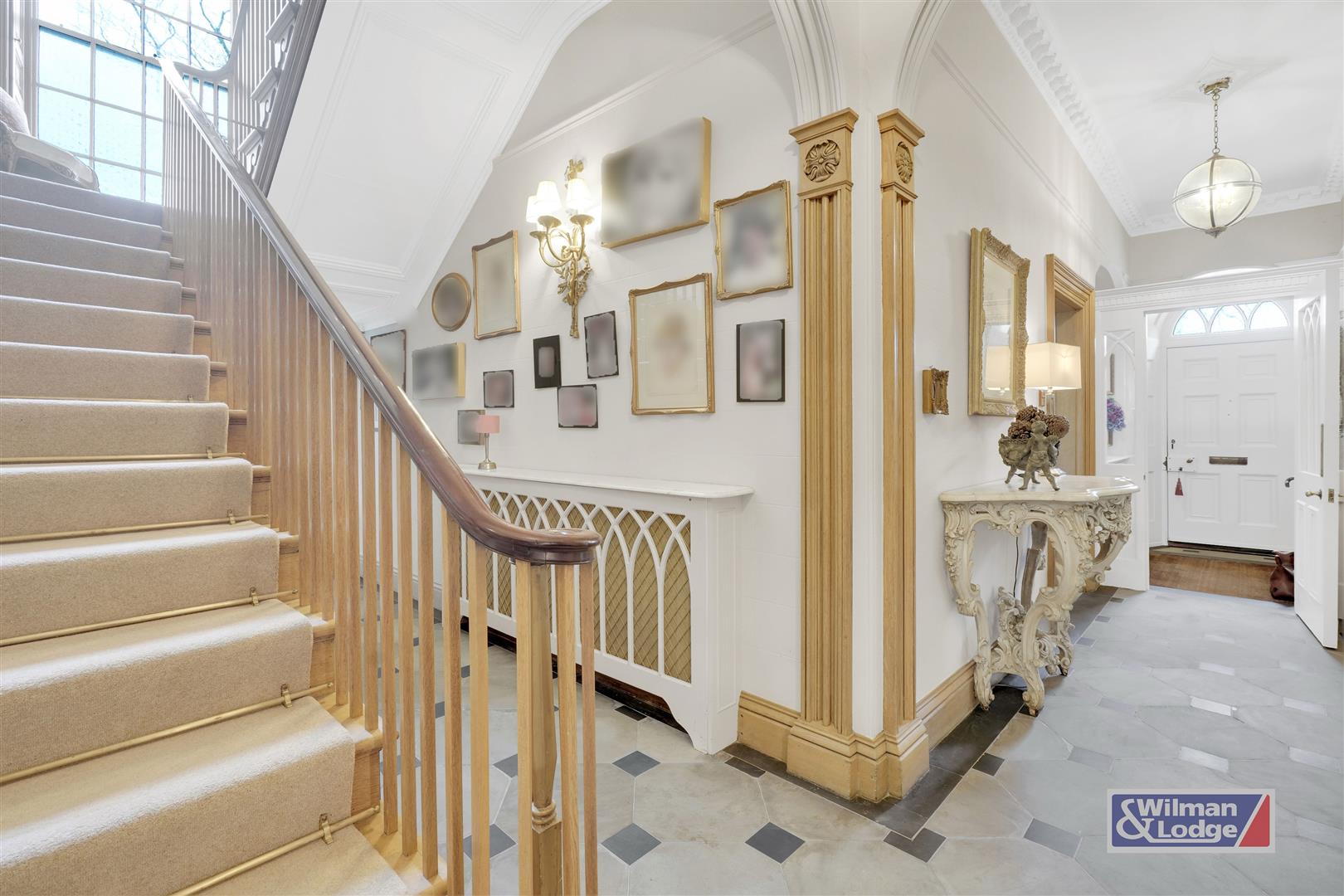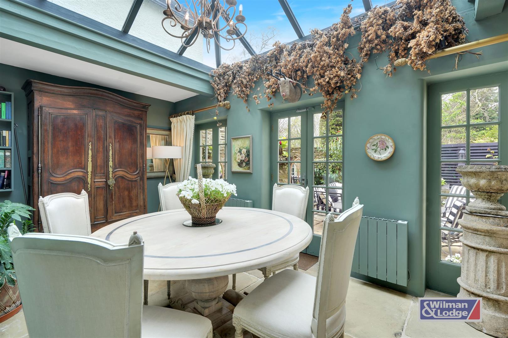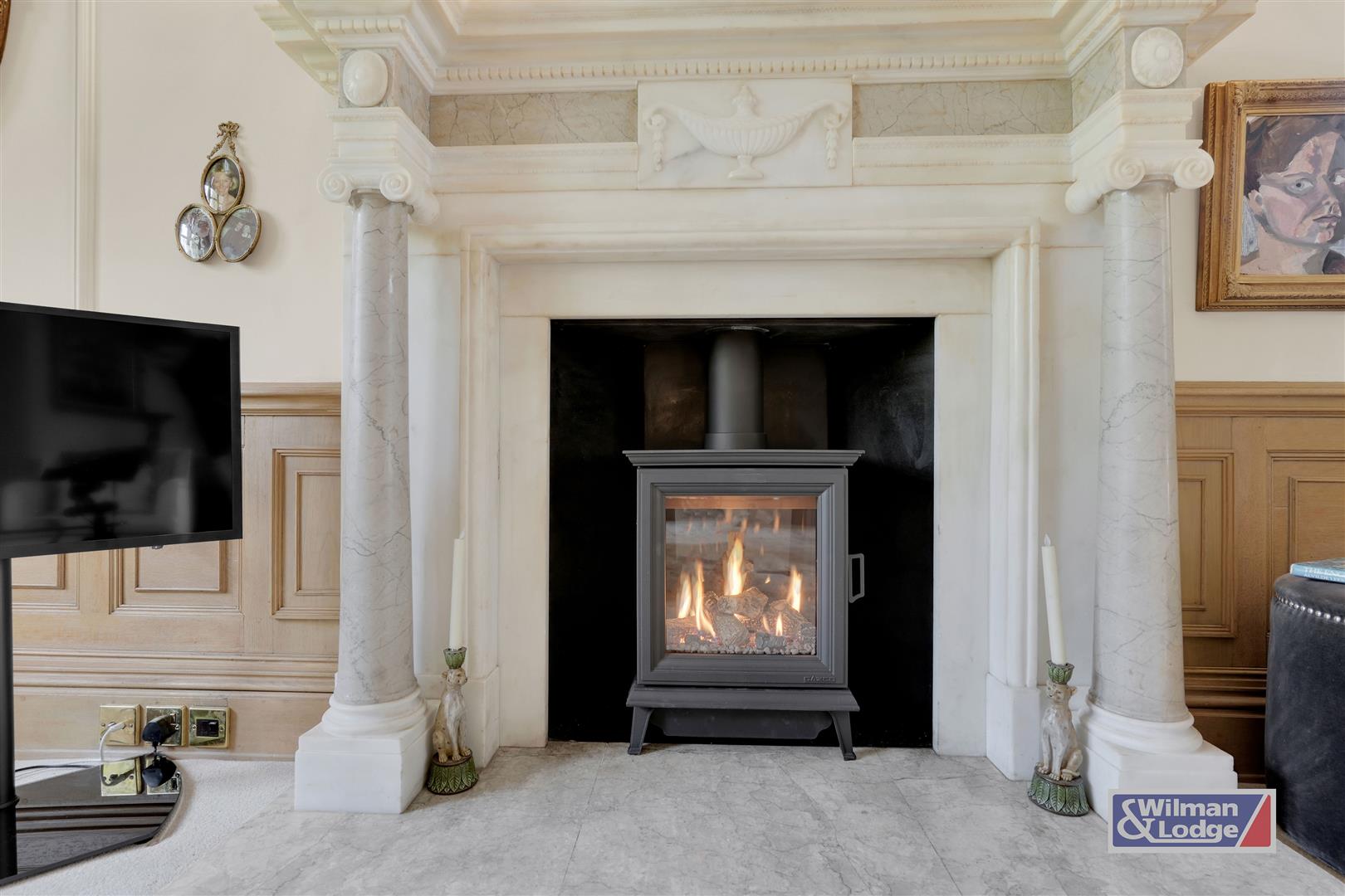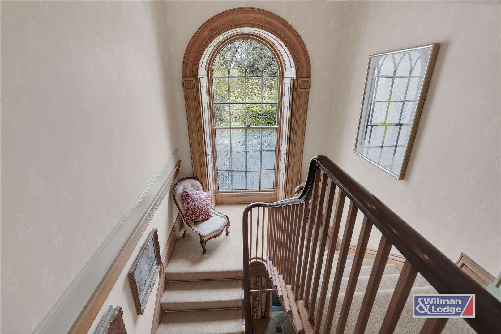 As you approach through the stately gated entrance, the allure of this magnificent property becomes immediately evident. Stepping into the entrance vestibule, you are greeted by an ambiance of timeless sophistication that leads into the breathtaking main hall. To the left, the exquisite sitting room unfolds, seamlessly connecting to a charming library/study, creating a perfect space for relaxation or intellectual pursuits. To the right, the living kitchen, featuring Everhot oven, quartz work tops, Quooker tap and handmade custom cabinetry by Grove House Bespoke Kitchens, awaits, boasting panoramic views over the meticulously landscaped gardens. A useful cloakroom and a sun-drenched, newly fitted lantern roofed garden room, opening to a serene courtyard garden complete the ground floor.