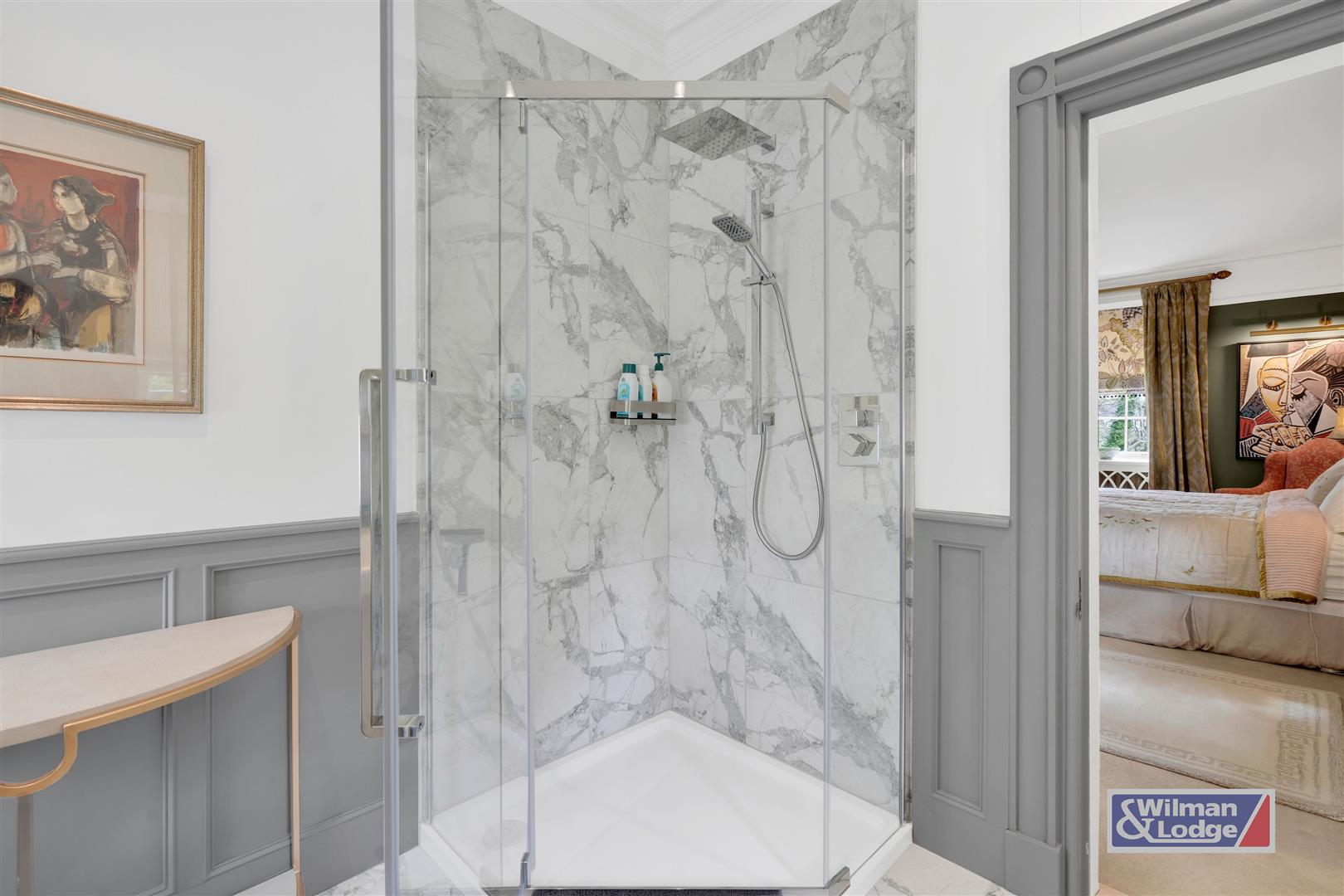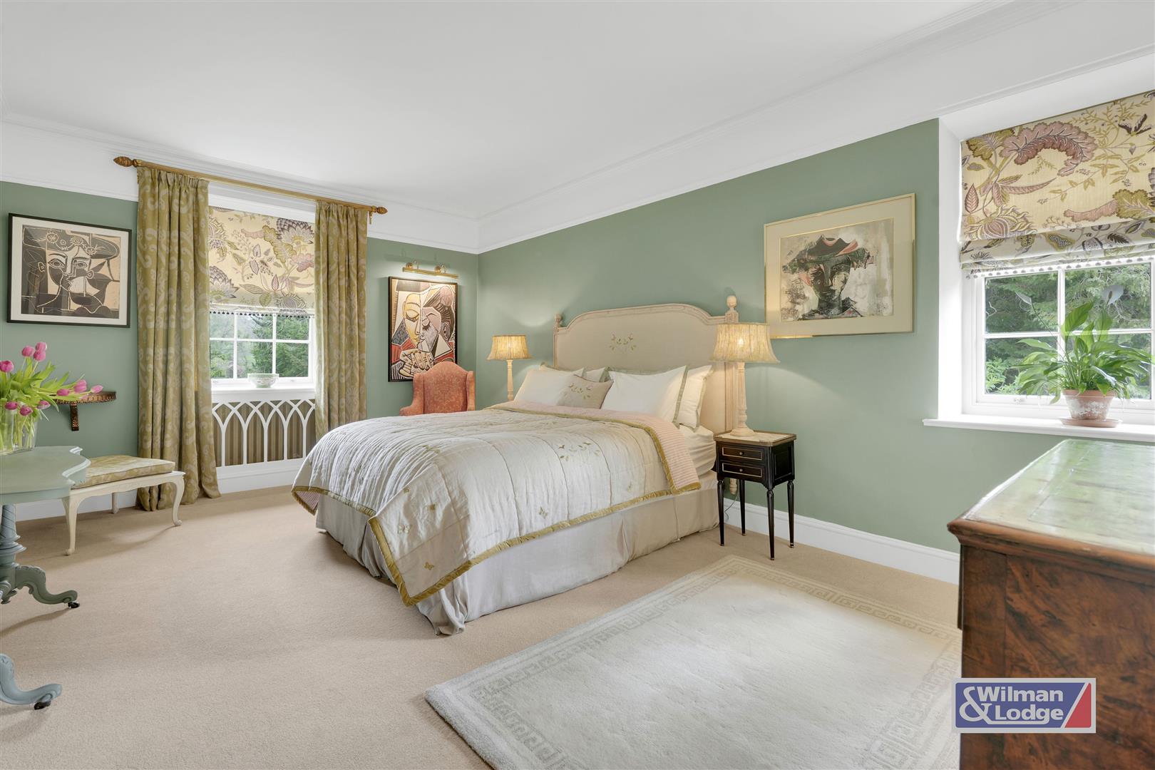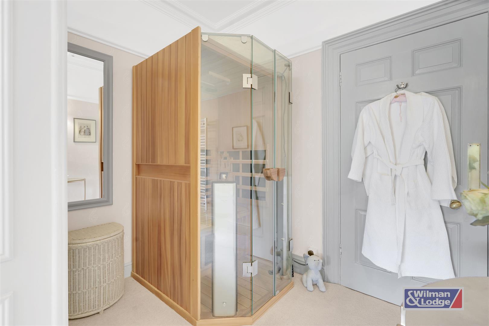 Ascending to the first floor, the half-landing showcases a distinctive crescent window, bathing the space in natural light. The spacious landing, adorned with built-in furniture, leads to the master suite, a sanctuary of comfort with enchanting views over the gardens and duck pond. This retreat includes a sumptuous bathroom equipped with a private sauna. The second bedroom mirrors the master in both elegance and size, sharing the same captivating vistas. A beautifully appointed house shower room, both luxurious and contemporary, serves this level.