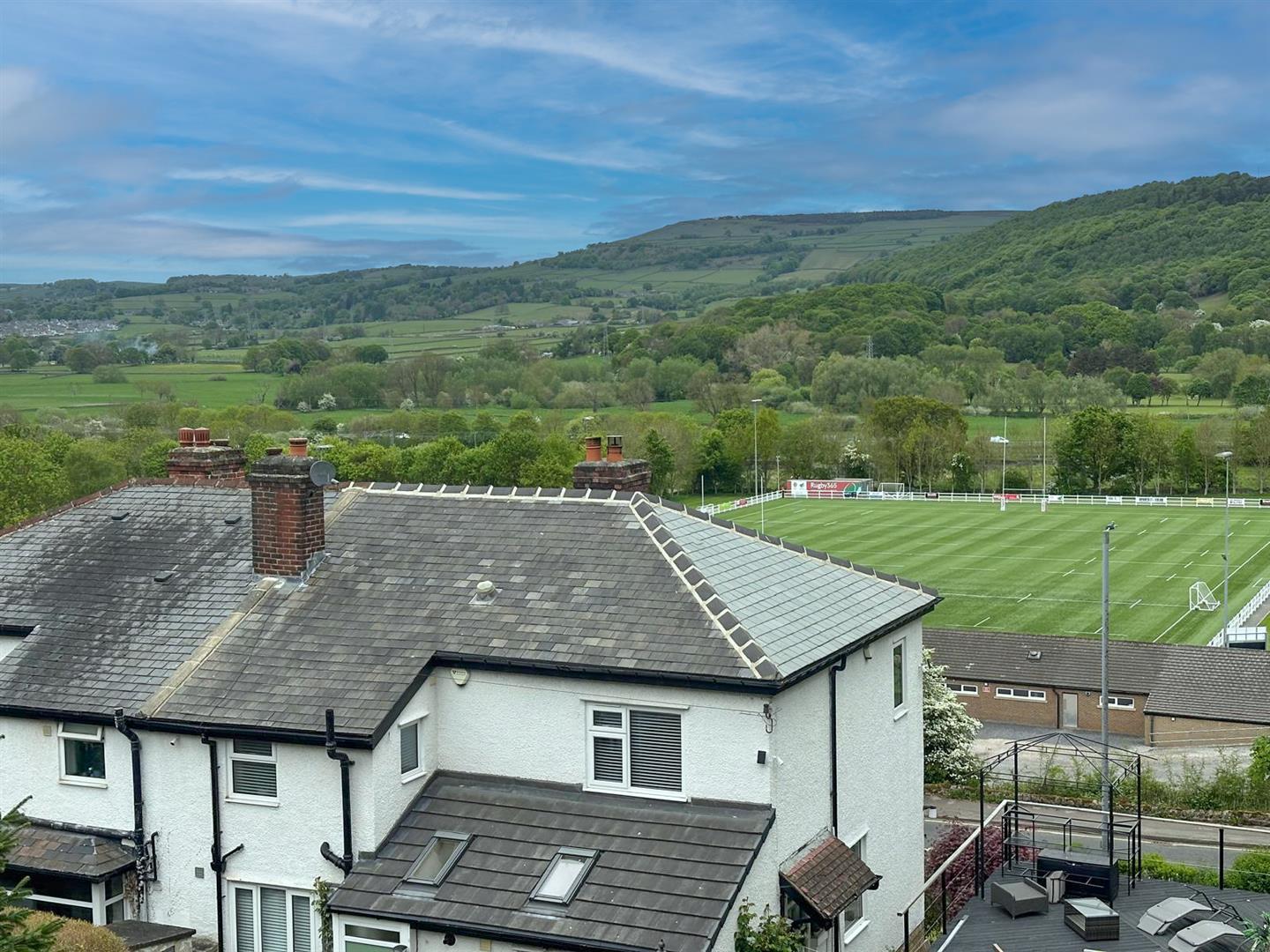Upon entering, you’re welcomed into a spacious and elegant hallway featuring an open staircase and practical understairs storage. The sitting room is a refined yet cosy space, enhanced by a contemporary fireplace and a large picture window that perfectly frames the sweeping valley views. Flowing seamlessly from here are oak-glazed folding doors that lead into a stunning dining kitchen — an impressive 22-foot-long space fitted with sage green cabinetry, solid wood worktops, a composite sink, built-in electric double oven and a four-ring induction hob. Recessed lighting and stylish flooring complete the look, with direct access to the private rear garden.