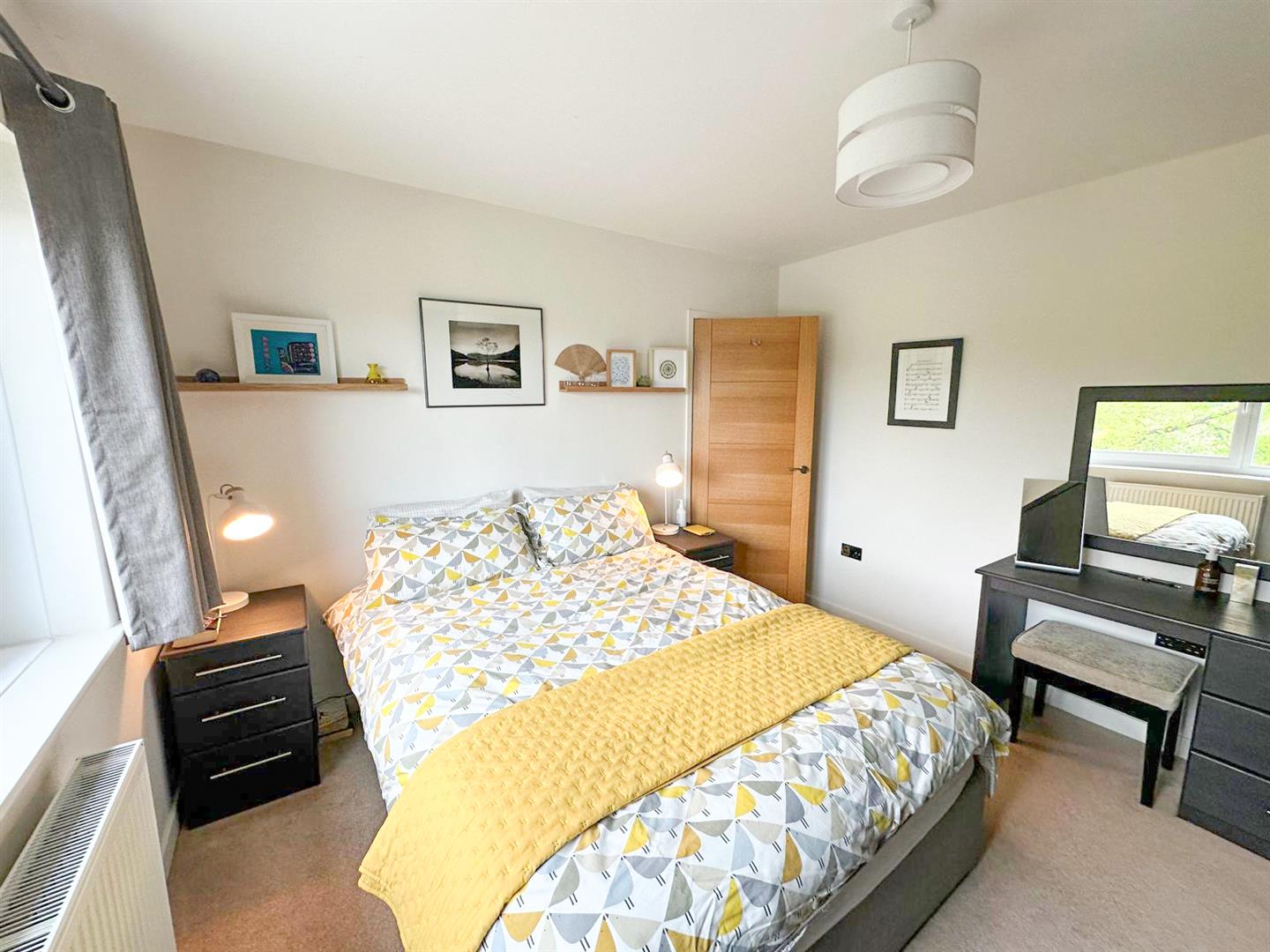 Upstairs, the home continues to impress. The first floor reveals three generously sized bedrooms, each filled with natural light and enjoying picturesque outlooks, particularly the principal bedroom, which overlooks the valley and features bespoke built-in wardrobes. The luxurious four-piece bathroom includes a freestanding bath, a walk-in rainfall shower and sleek gunmetal grey cabinetry that adds a modern touch of sophistication.
