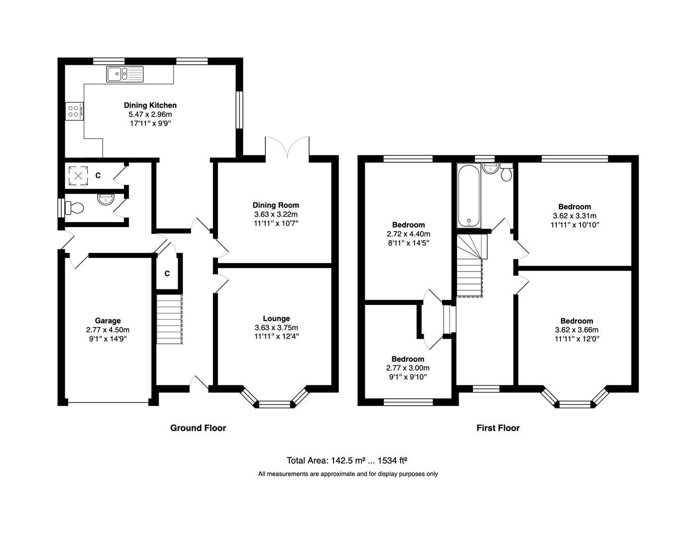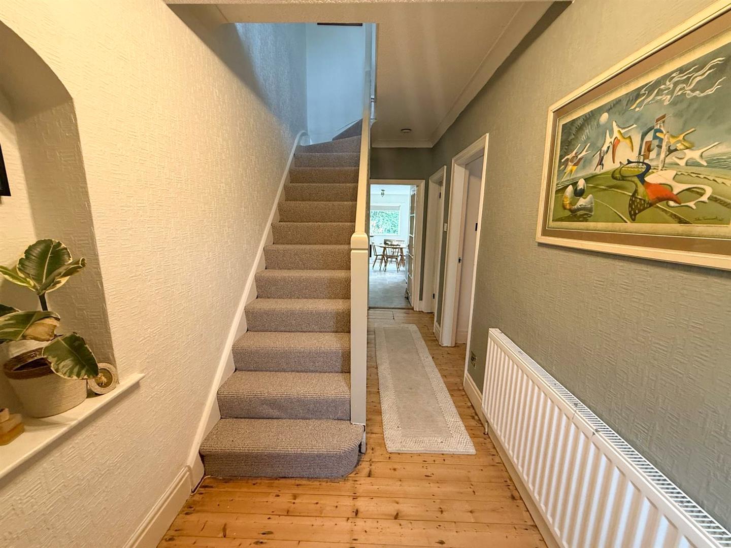 The accommodation is thoughtfully arranged over two floors, blending charming character features with modern practicality. The welcoming entrance hall sets the tone, featuring an elegant open staircase and ample space for coats and shoes. To the right, a delightful sitting room enjoys a large bay window, a recessed electric stove, and stripped wooden floorboards—offering a cosy and inviting ambience. Beyond lies a second living/dining room and a well-equipped living/dining kitchen at the rear, perfectly suited to everyday family life and entertaining. An inner hall provides a cloak area, a spacious walk-in store with Velux window, a cloakroom, and internal access to the garage.