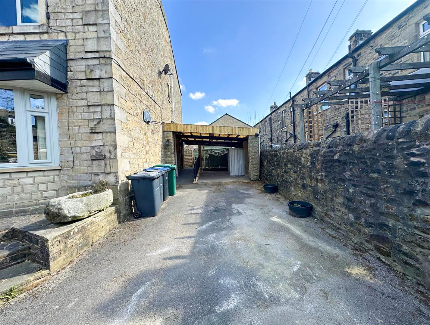 Outside, a grassed and flagged forecourt is bordered by stone pillars and timber rails, with a useful storage shed, double timber gates and a wide driveway under a carport roof. A lawned rear garden adds further outdoor space and a raised decking area. Across St John's Street, a separate detached garage includes parking for two vehicles on a tarmac forecourt. This area offers further development potential, whether for an end-terrace dwelling or a decked area over the beck, subject to planning approval.