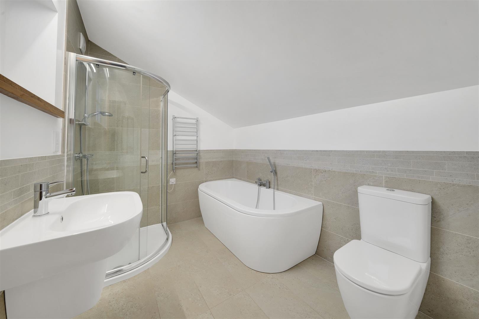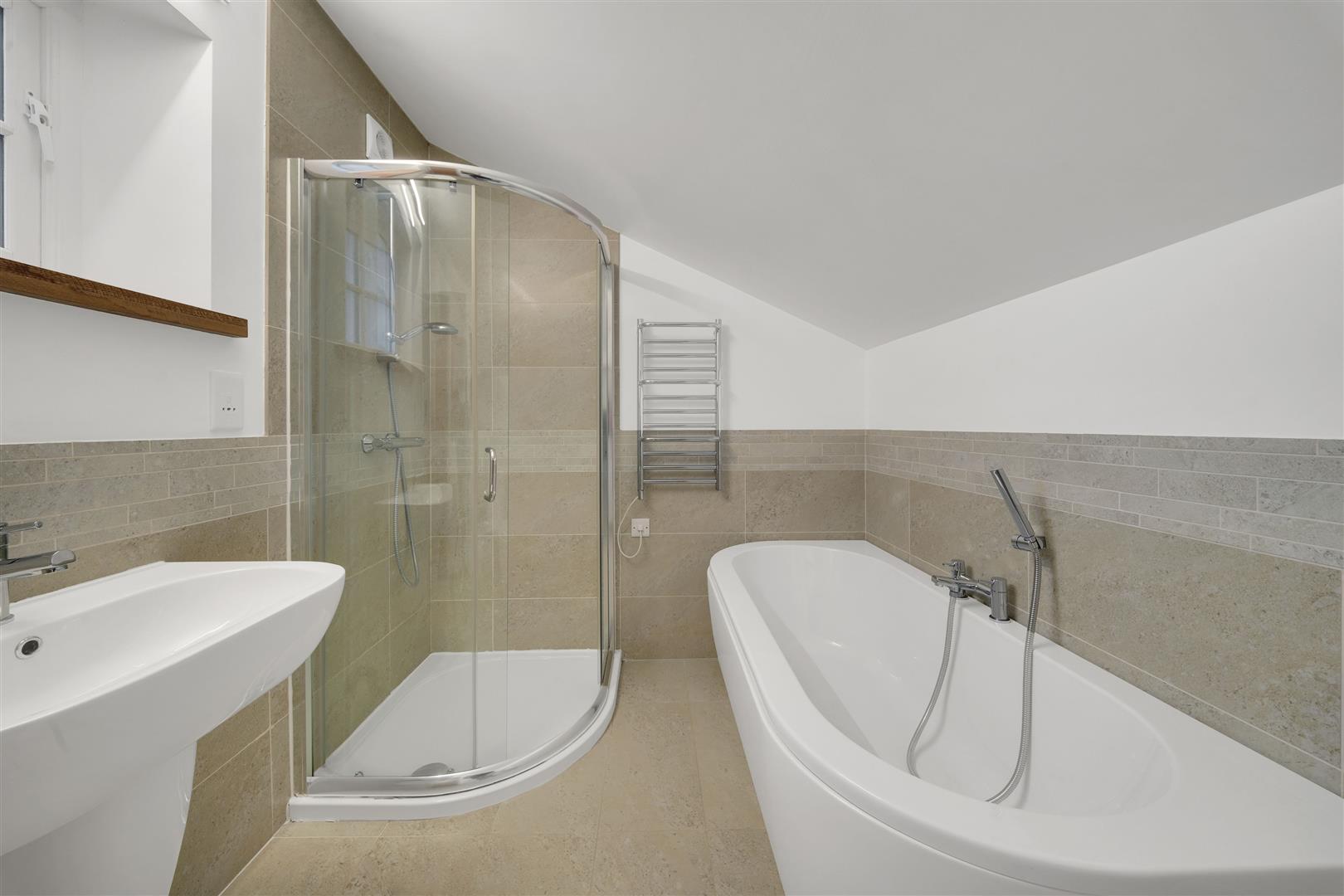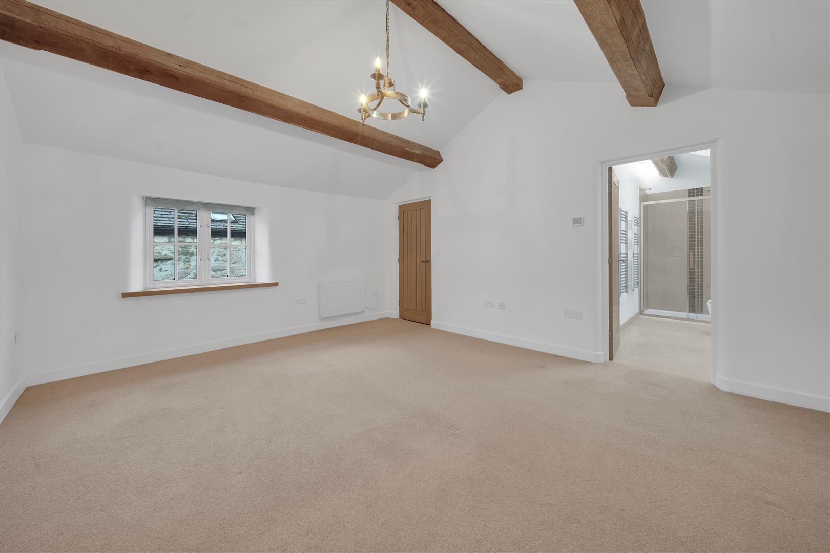 To the first floor of the main house, a spacious landing leads to two impressive double bedrooms. The principal bedroom enjoys a front-facing aspect, a striking feature ceiling, and a luxurious en-suite shower room. The second double bedroom also benefits from a high-quality en-suite bathroom.